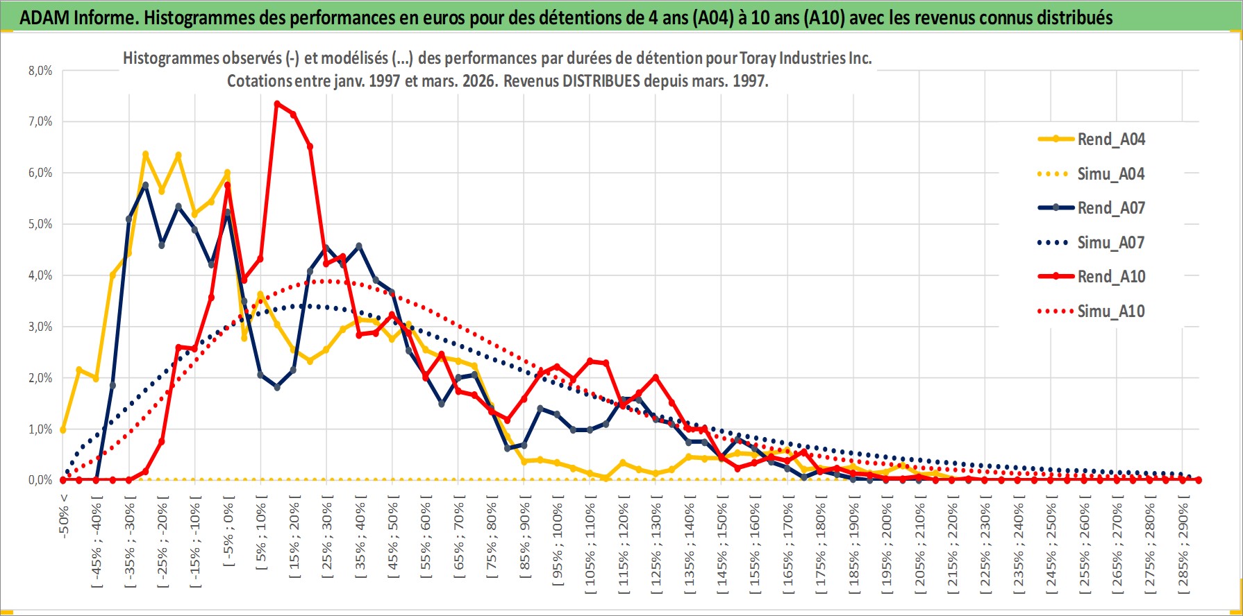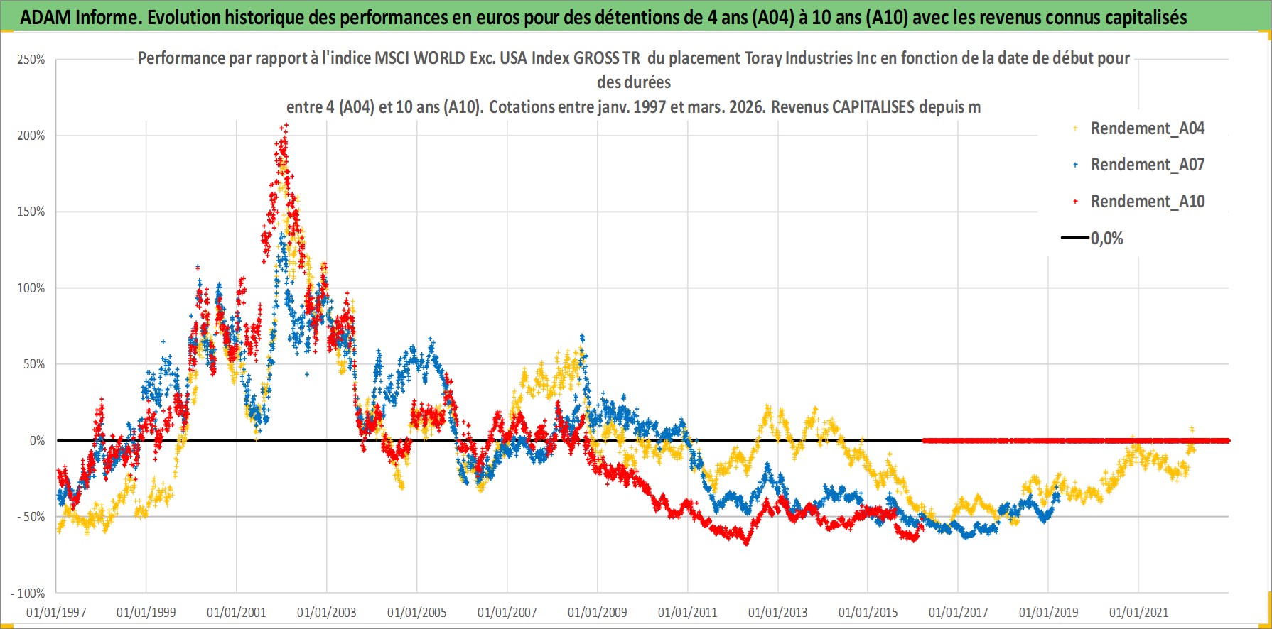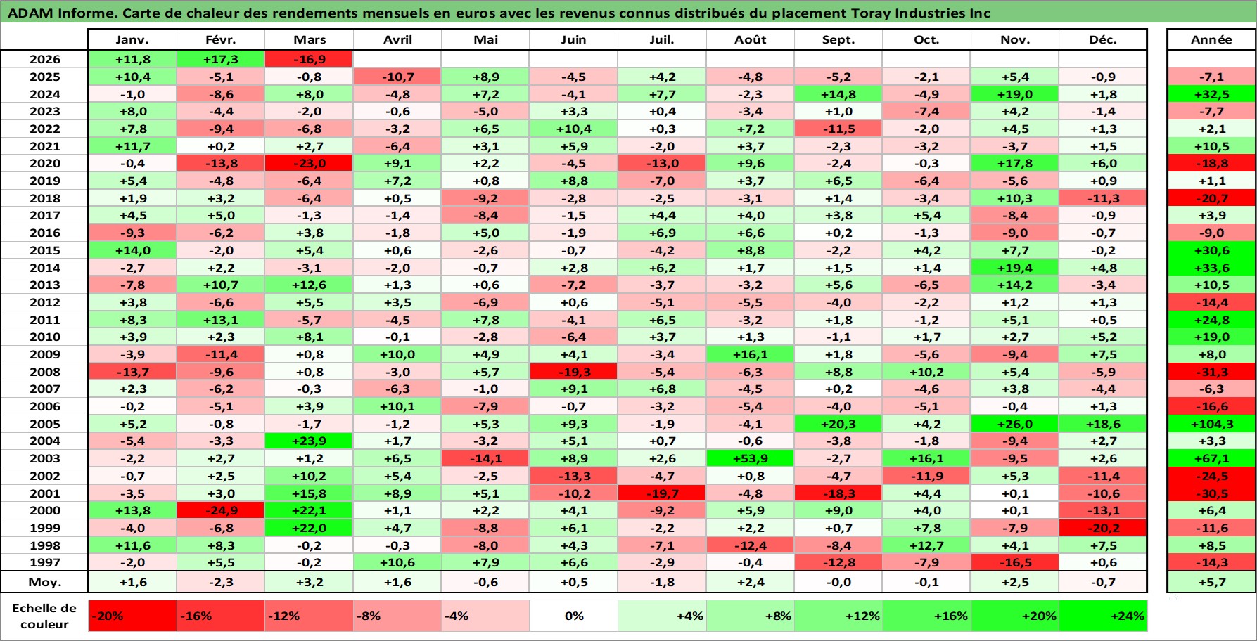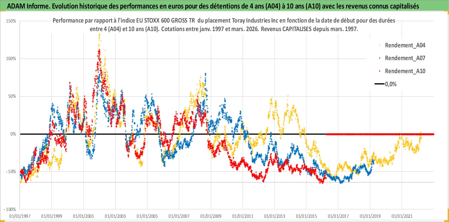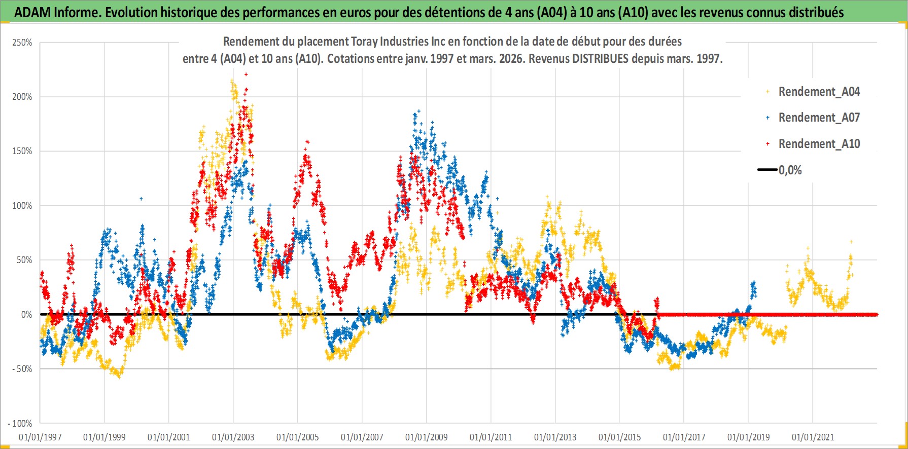 Site dédié aux investisseursPage dédiée sur site financeAnalyse des valorisations hebdomadaires de l'action Toray Industries Inc. Cet actif est cote en JPY. Les valorisations sont en contrevaleur EURO et couvrent les semaines 1997W01 a 2026W13. Les revenus de cet actif financier sont pris en compte depuis la semaine 1997W13. La note globale ESG de cet actif est estimee a 9.0 (apres rebasage entre 0 et 20).