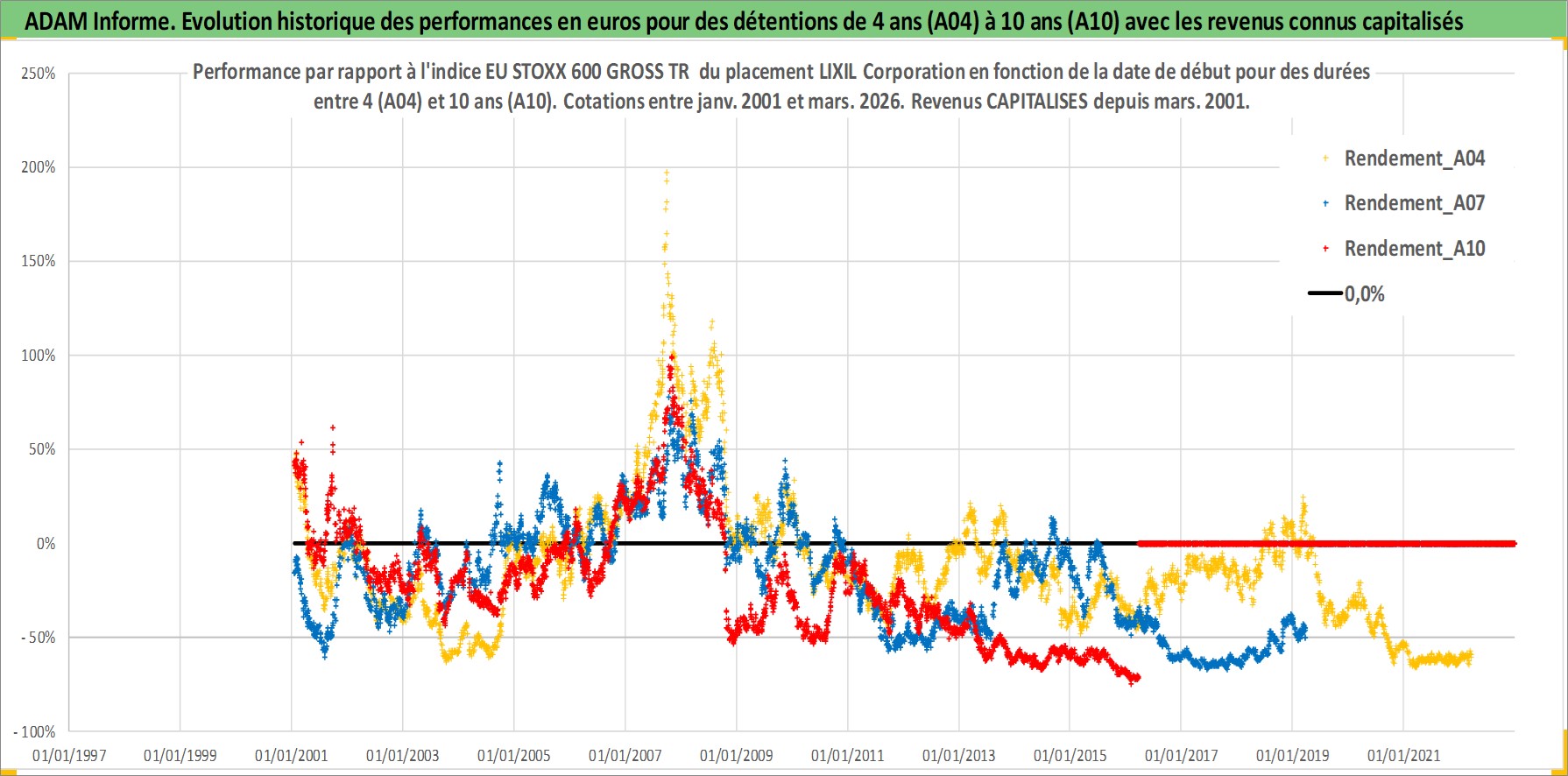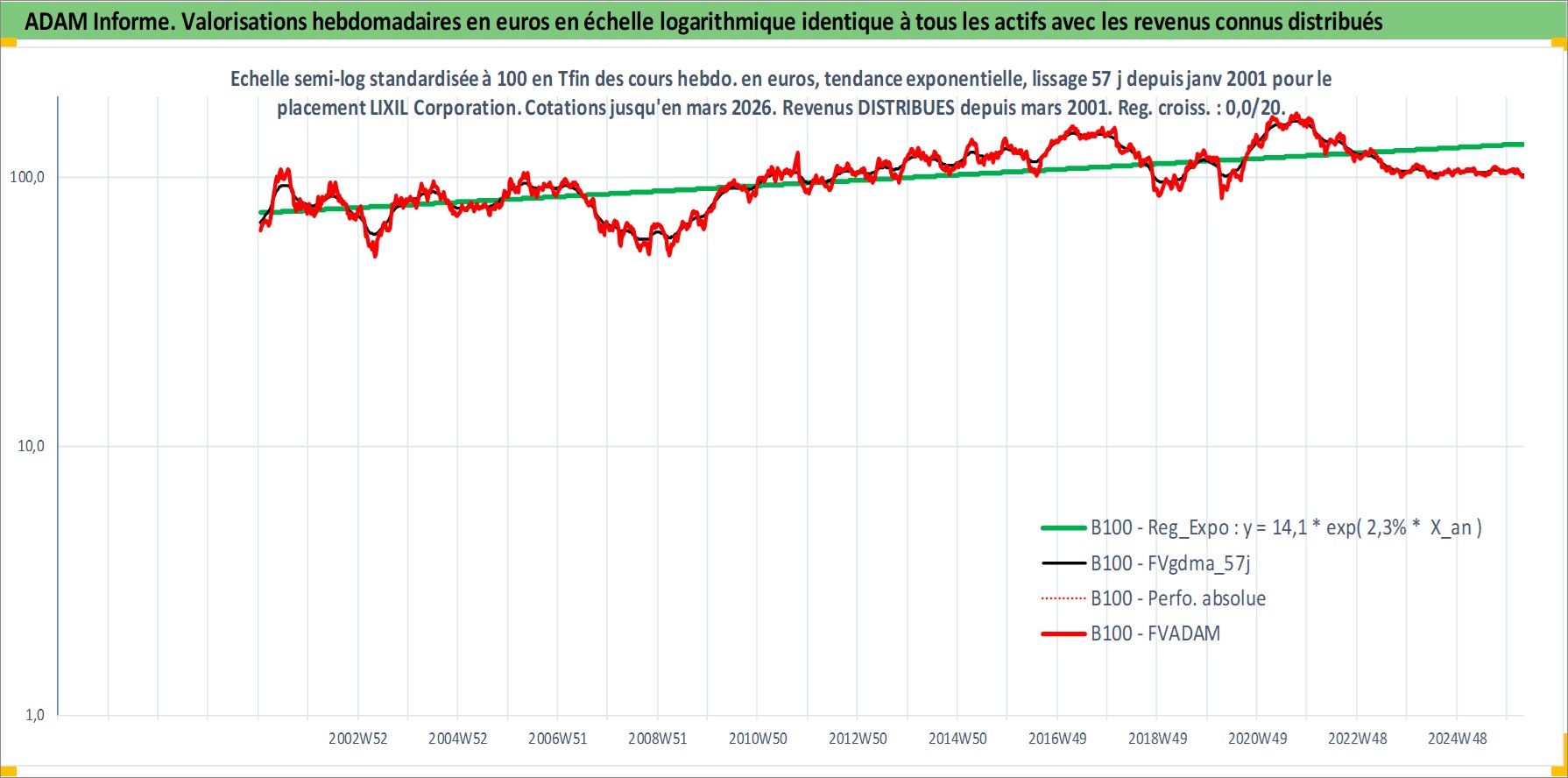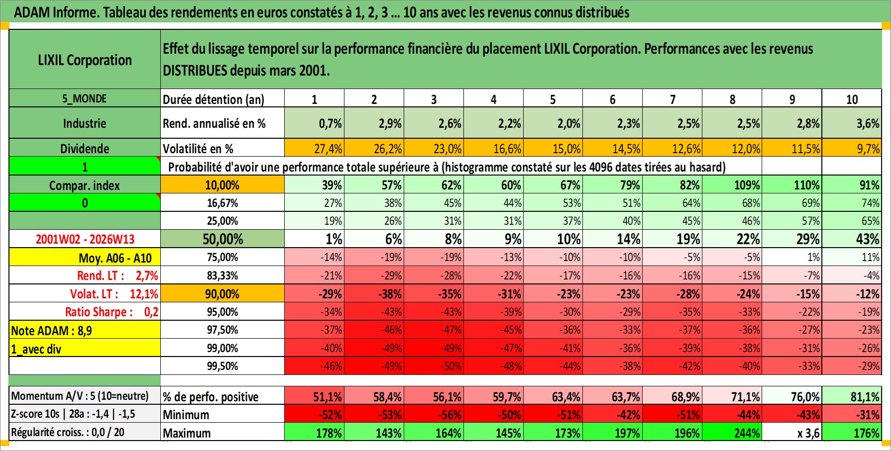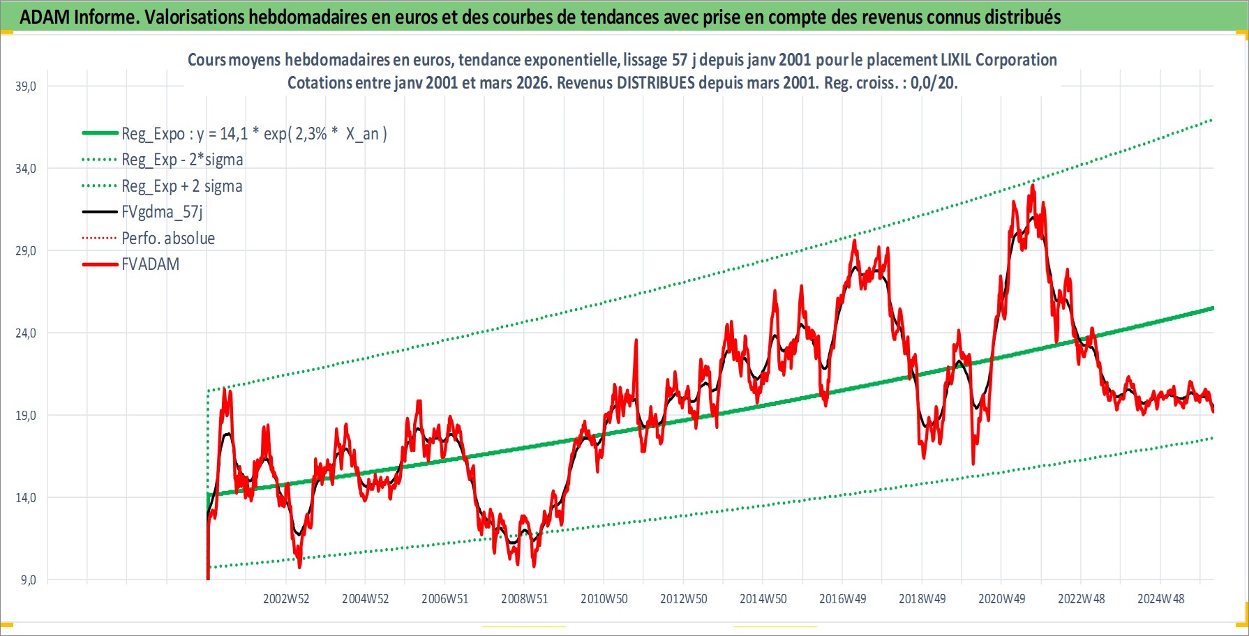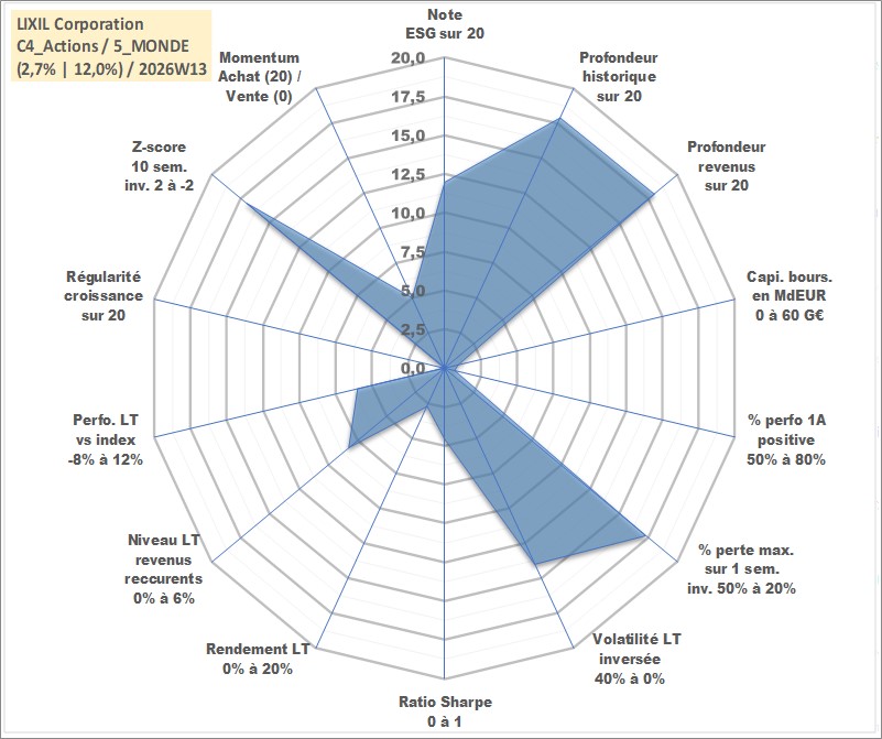 Site dédié aux investisseursPage dédiée sur site financeAnalyse des valorisations hebdomadaires de l'action LIXIL Corporation. Cet actif est cote en JPY. Les valorisations sont en contrevaleur EURO et couvrent les semaines 2001W02 a 2026W13. Les revenus de cet actif financier sont pris en compte depuis la semaine 2001W13. La note globale ESG de cet actif est estimee a 12.0 (apres rebasage entre 0 et 20).