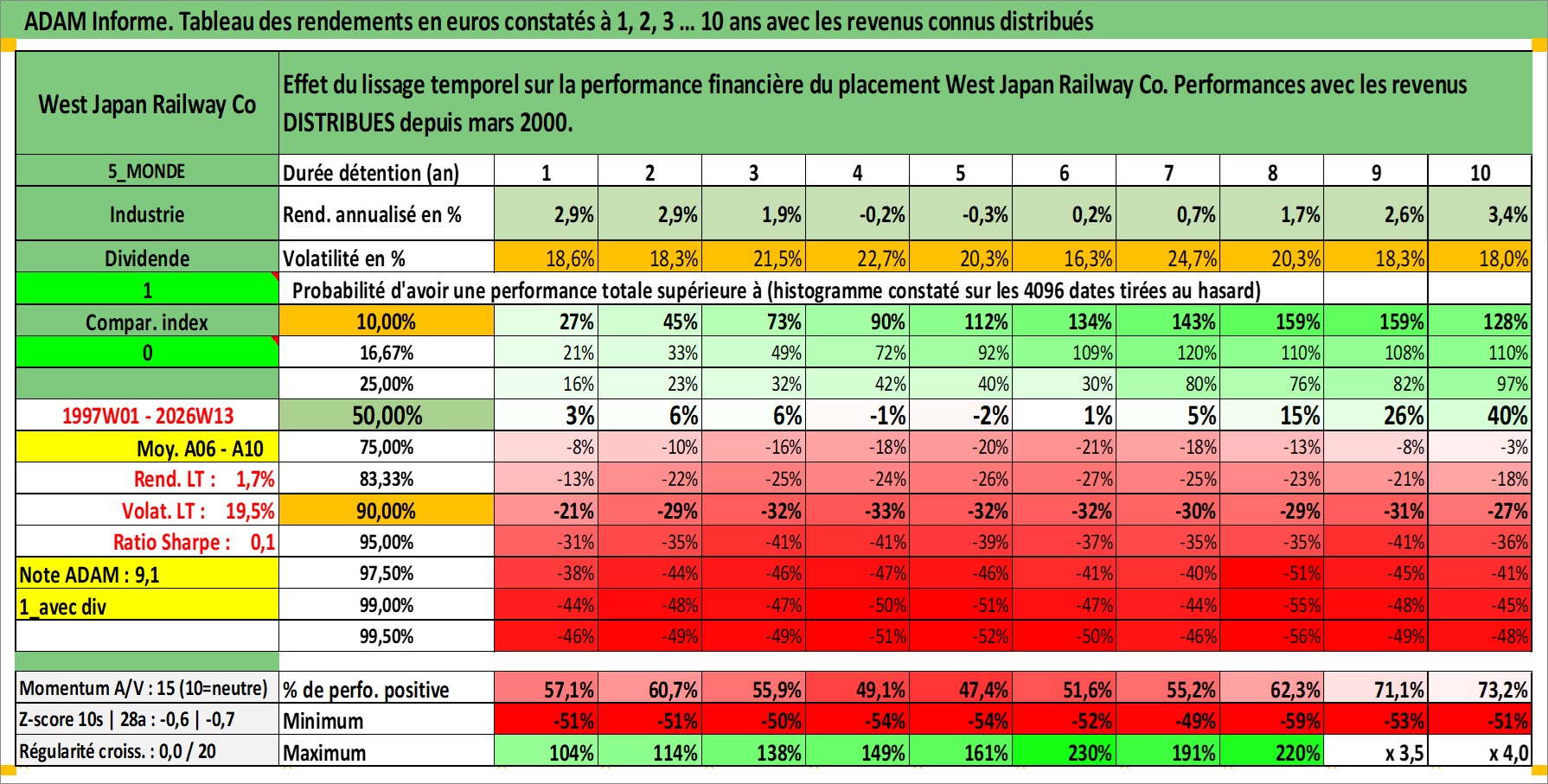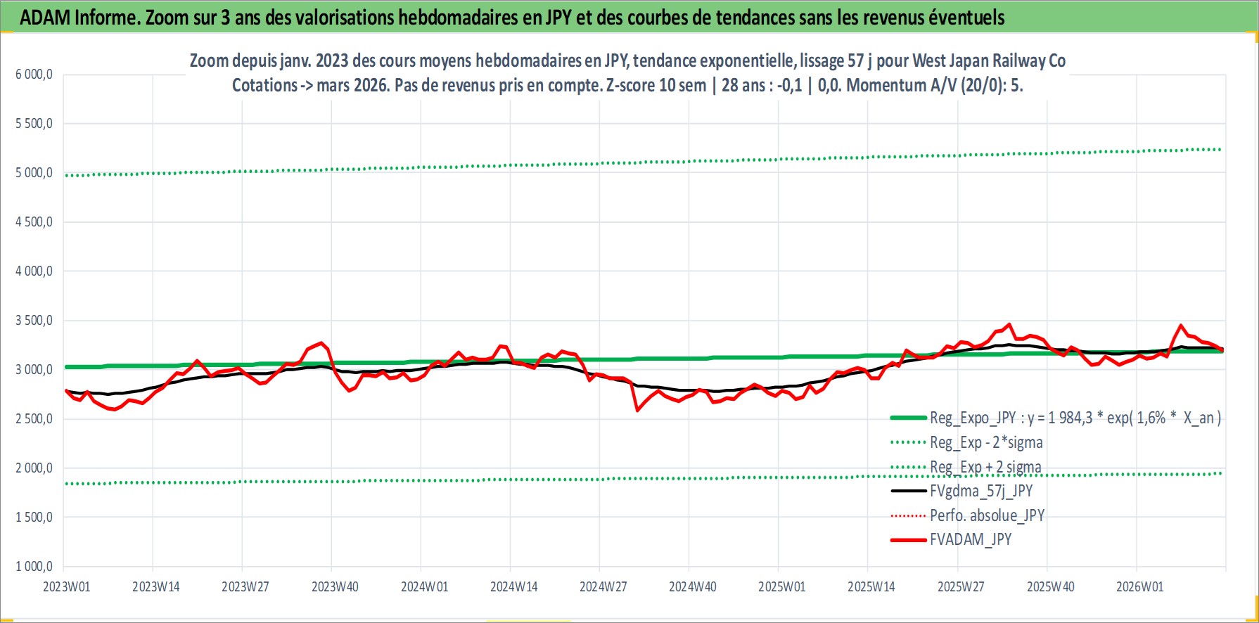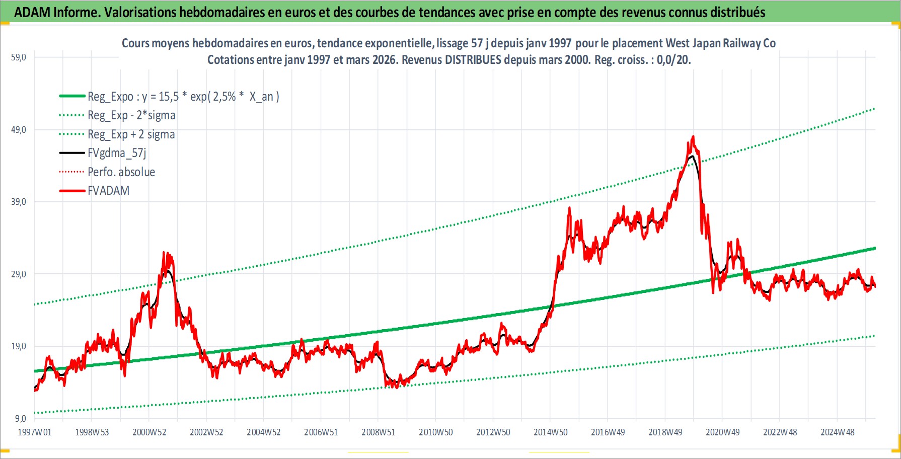 Site dédié aux investisseursPage dédiée sur site financeAnalyse des valorisations hebdomadaires de l'action West Japan Railway Co. Cet actif est cote en JPY. Les valorisations sont en contrevaleur EURO et couvrent les semaines 1997W01 a 2026W13. Les revenus de cet actif financier sont pris en compte depuis la semaine 2000W13. La note globale ESG de cet actif est estimee a 7.0 (apres rebasage entre 0 et 20).