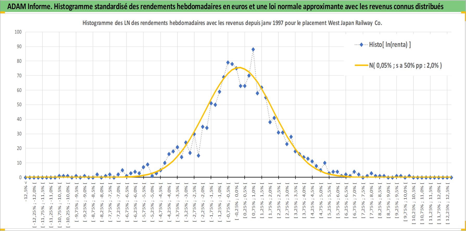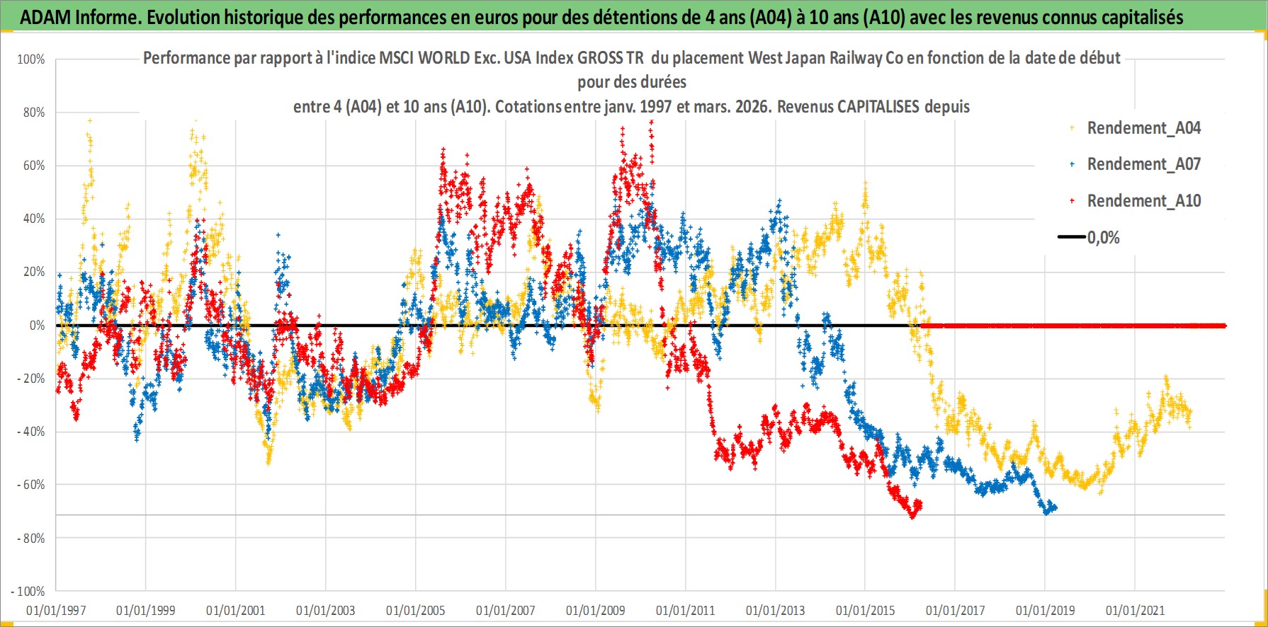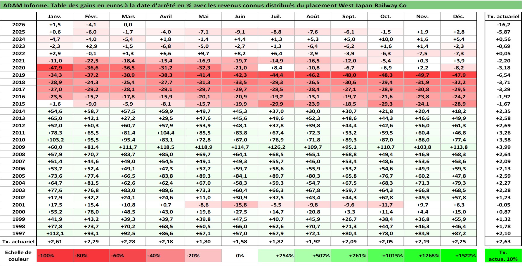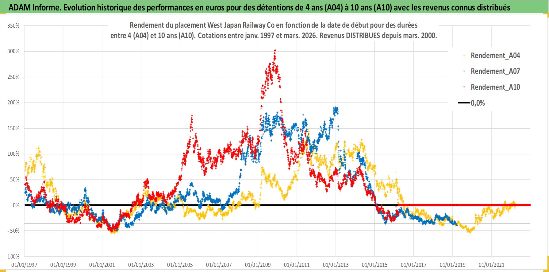 Site dédié aux investisseursPage dédiée sur site financeAnalyse des valorisations hebdomadaires de l'action West Japan Railway Co. Cet actif est cote en JPY. Les valorisations sont en contrevaleur EURO et couvrent les semaines 1997W01 a 2026W13. Les revenus de cet actif financier sont pris en compte depuis la semaine 2000W13. La note globale ESG de cet actif est estimee a 7.0 (apres rebasage entre 0 et 20).