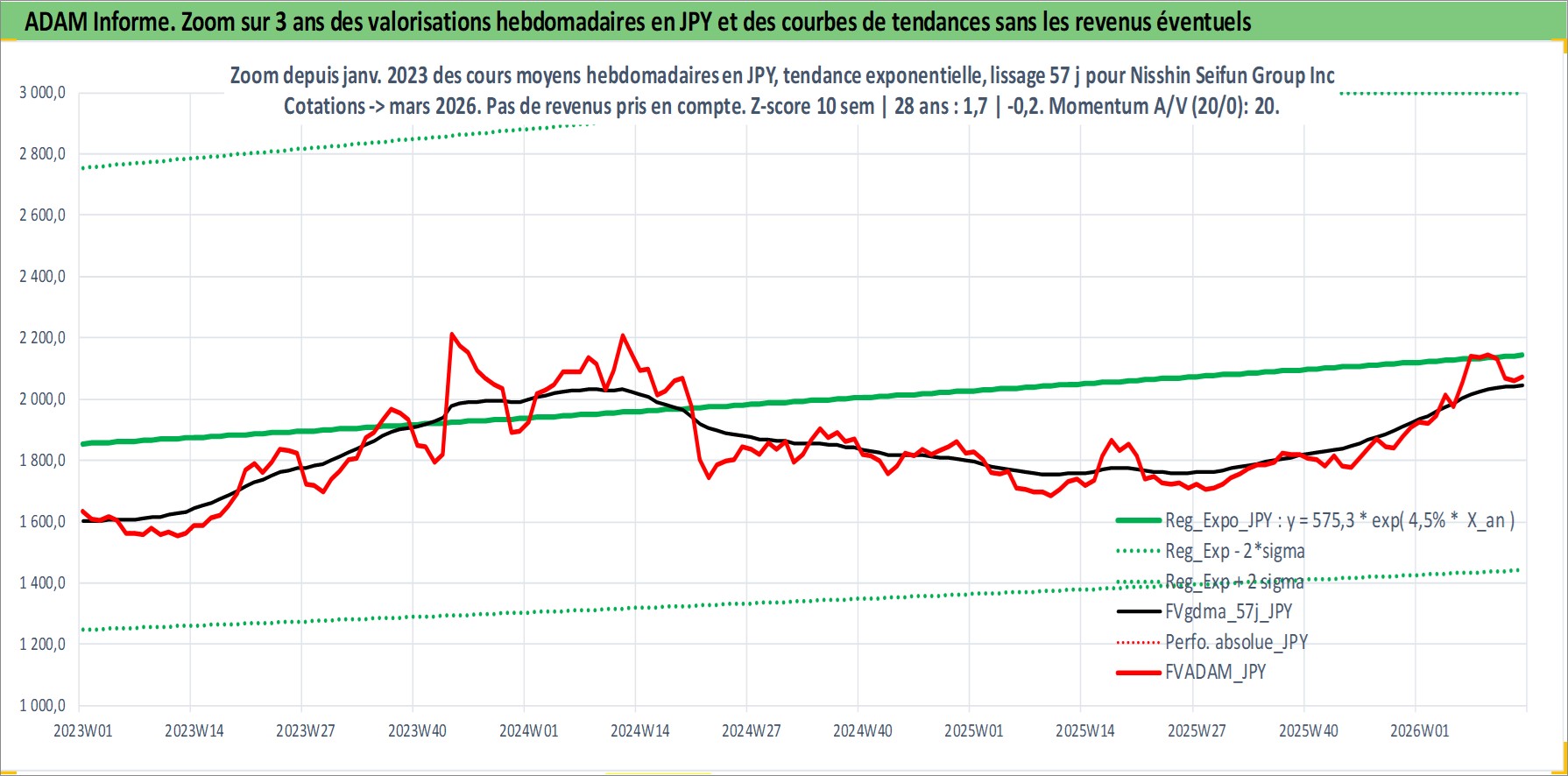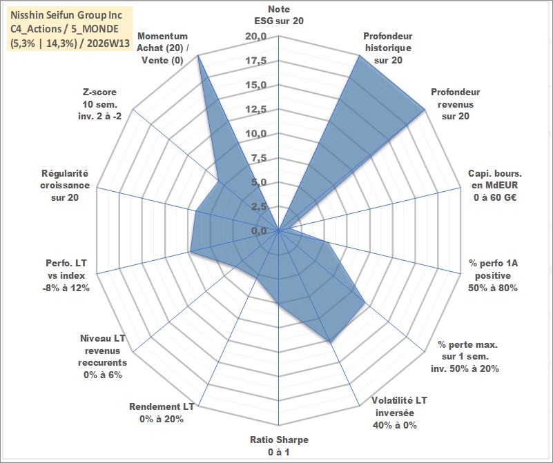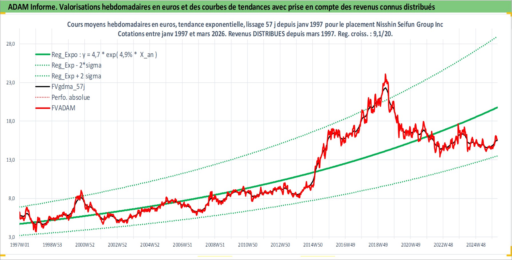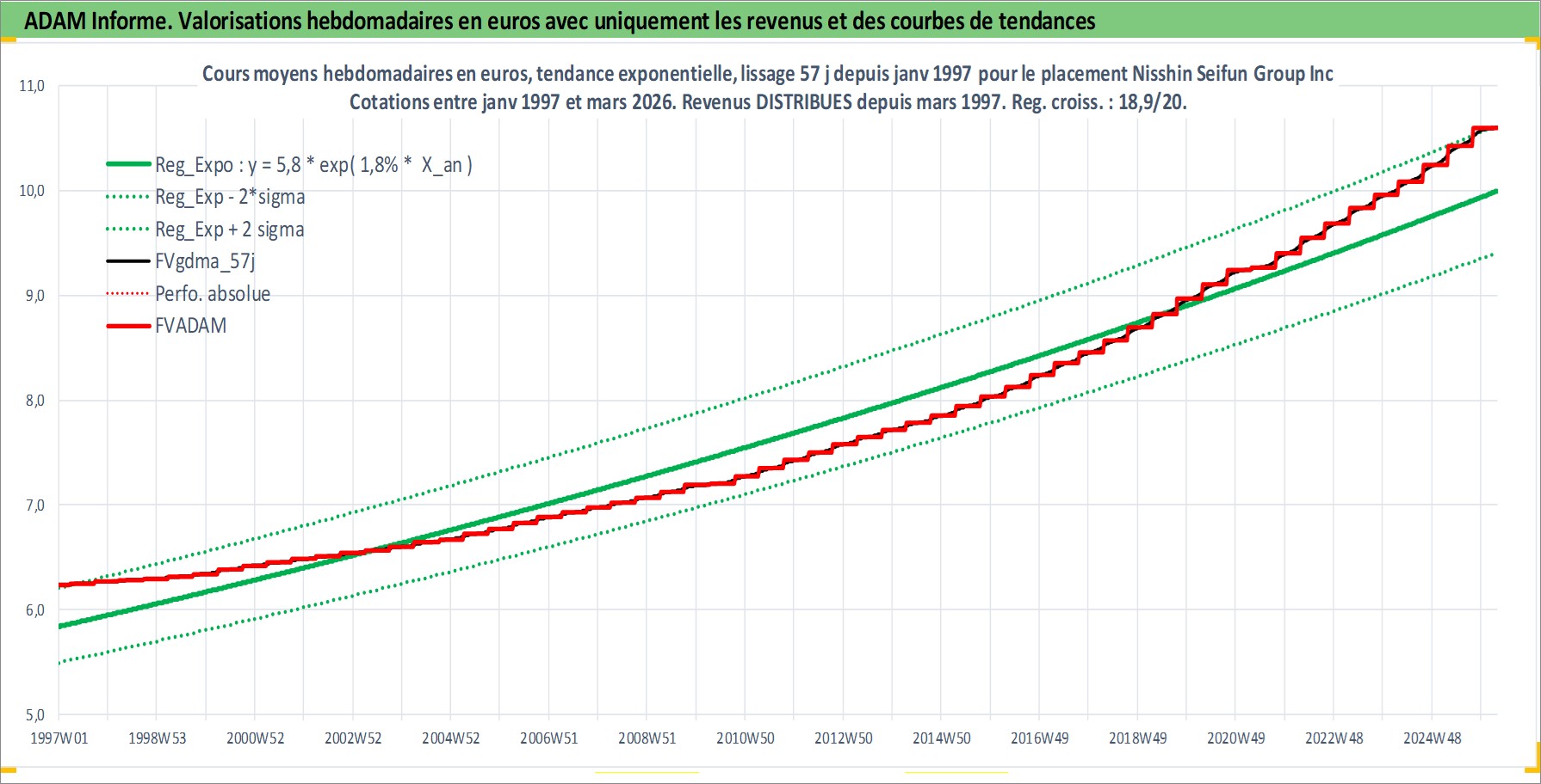 Site dédié aux investisseursPage dédiée sur site financeAnalyse des valorisations hebdomadaires de l'action Nisshin Seifun Group Inc. Cet actif est cote en JPY. Les valorisations sont en contrevaleur EURO et couvrent les semaines 1997W01 a 2026W13. Les revenus de cet actif financier sont pris en compte depuis la semaine 1997W13. La note ESG de cet actif n'est pas connue.