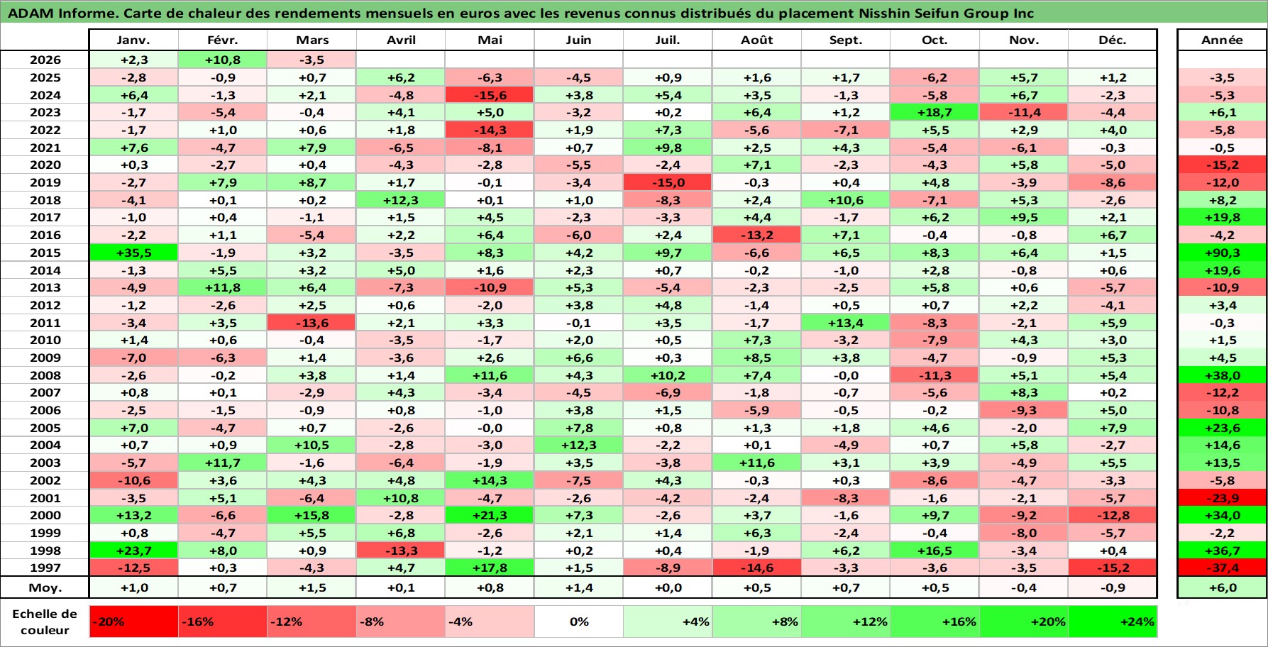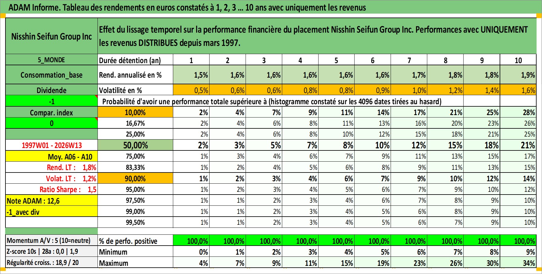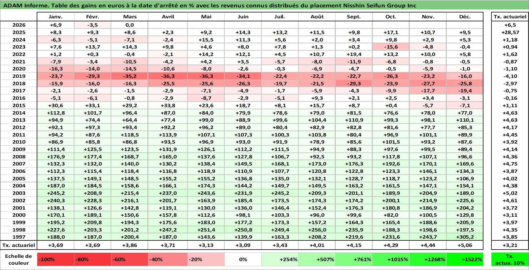 Site dédié aux investisseursPage dédiée sur site financeAnalyse des valorisations hebdomadaires de l'action Nisshin Seifun Group Inc. Cet actif est cote en JPY. Les valorisations sont en contrevaleur EURO et couvrent les semaines 1997W01 a 2026W13. Les revenus de cet actif financier sont pris en compte depuis la semaine 1997W13. La note ESG de cet actif n'est pas connue.