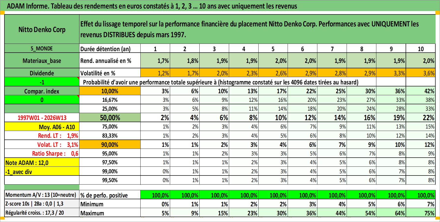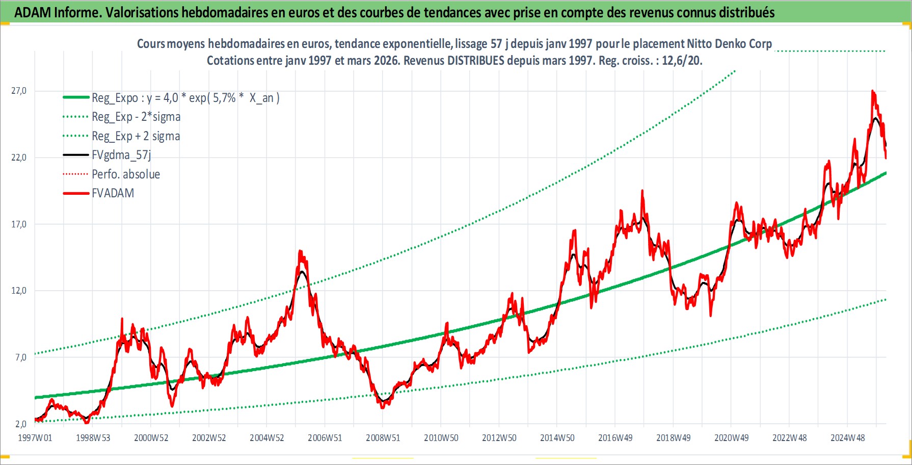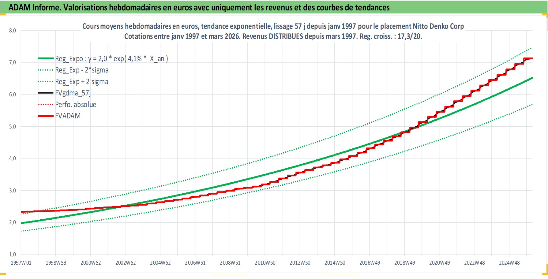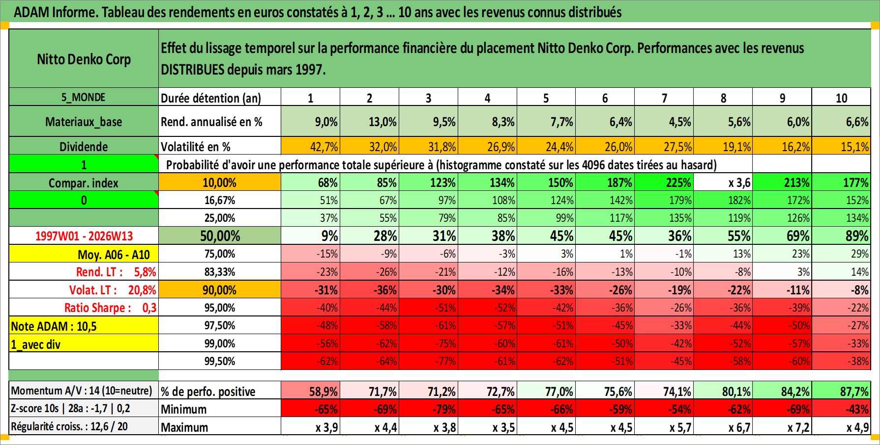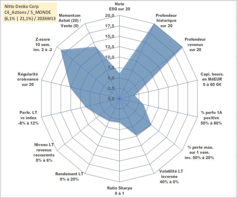 Site dédié aux investisseursPage dédiée sur site financeAnalyse des valorisations hebdomadaires de l'action Nitto Denko Corp. Cet actif est cote en JPY. Les valorisations sont en contrevaleur EURO et couvrent les semaines 1997W01 a 2026W13. Les revenus de cet actif financier sont pris en compte depuis la semaine 1997W13. La note globale ESG de cet actif est estimee a 6.0 (apres rebasage entre 0 et 20).