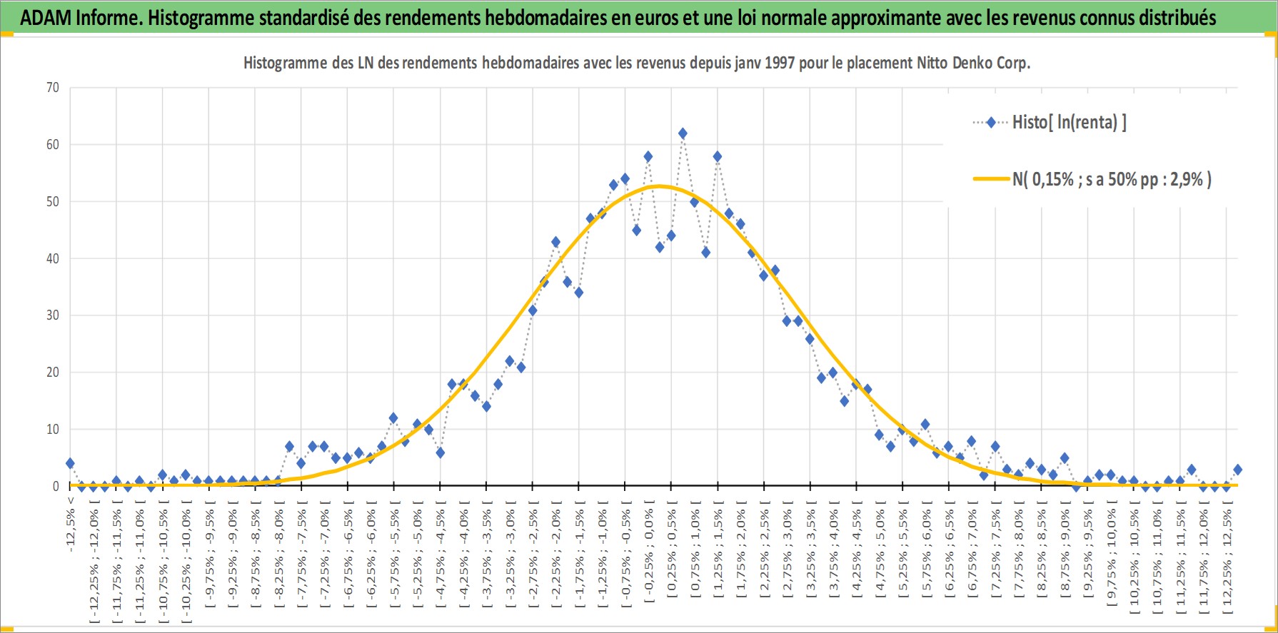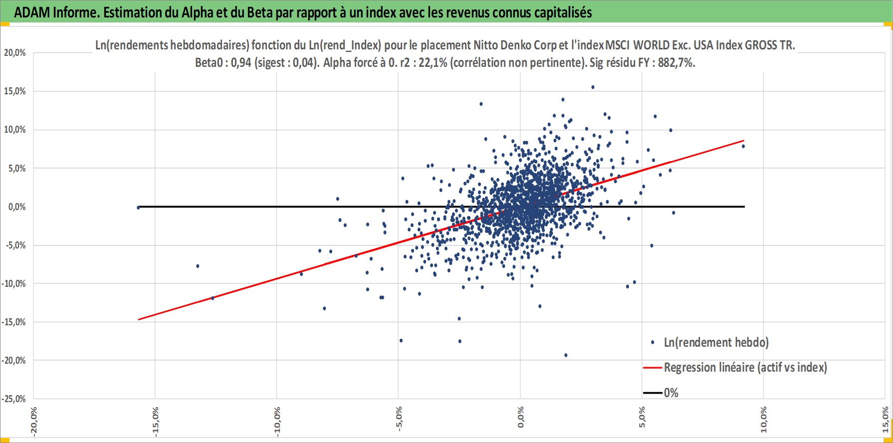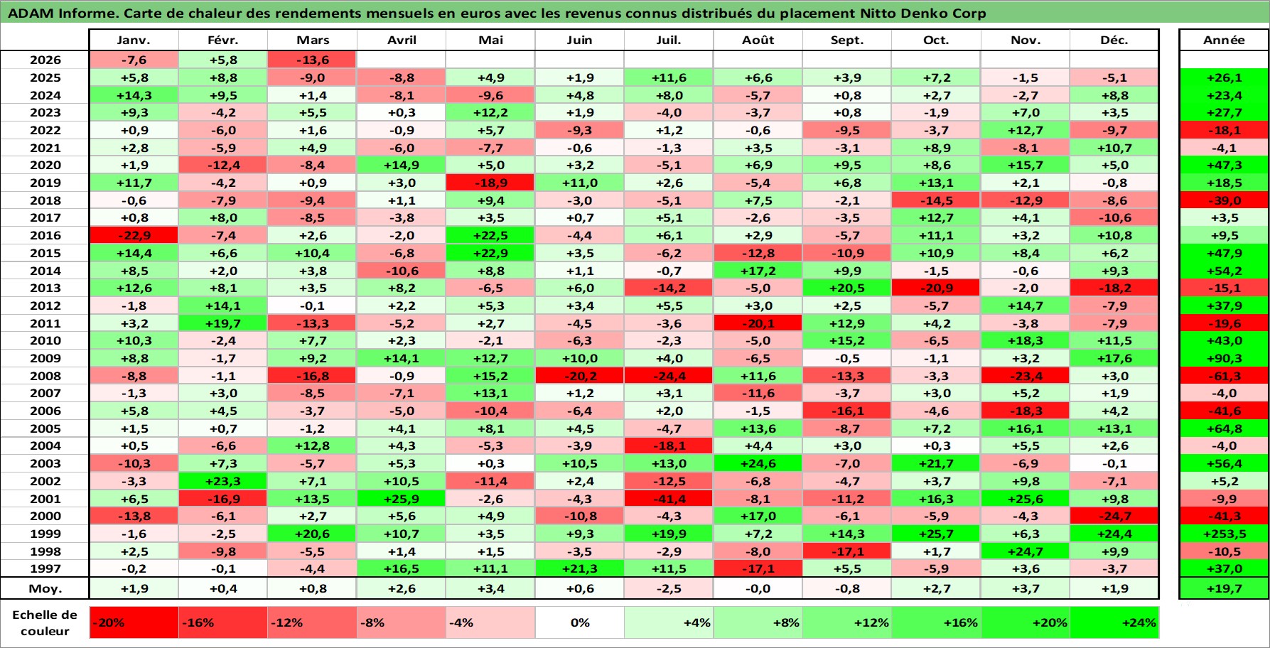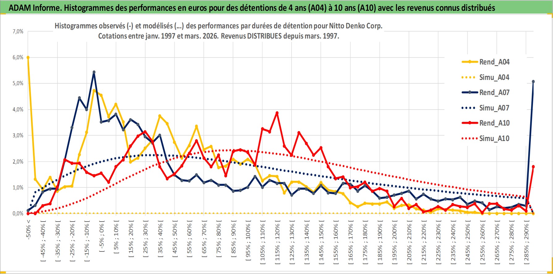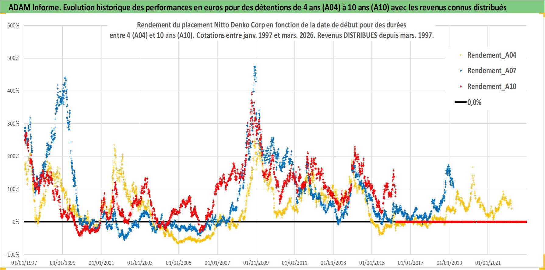 Site dédié aux investisseursPage dédiée sur site financeAnalyse des valorisations hebdomadaires de l'action Nitto Denko Corp. Cet actif est cote en JPY. Les valorisations sont en contrevaleur EURO et couvrent les semaines 1997W01 a 2026W13. Les revenus de cet actif financier sont pris en compte depuis la semaine 1997W13. La note globale ESG de cet actif est estimee a 6.0 (apres rebasage entre 0 et 20).