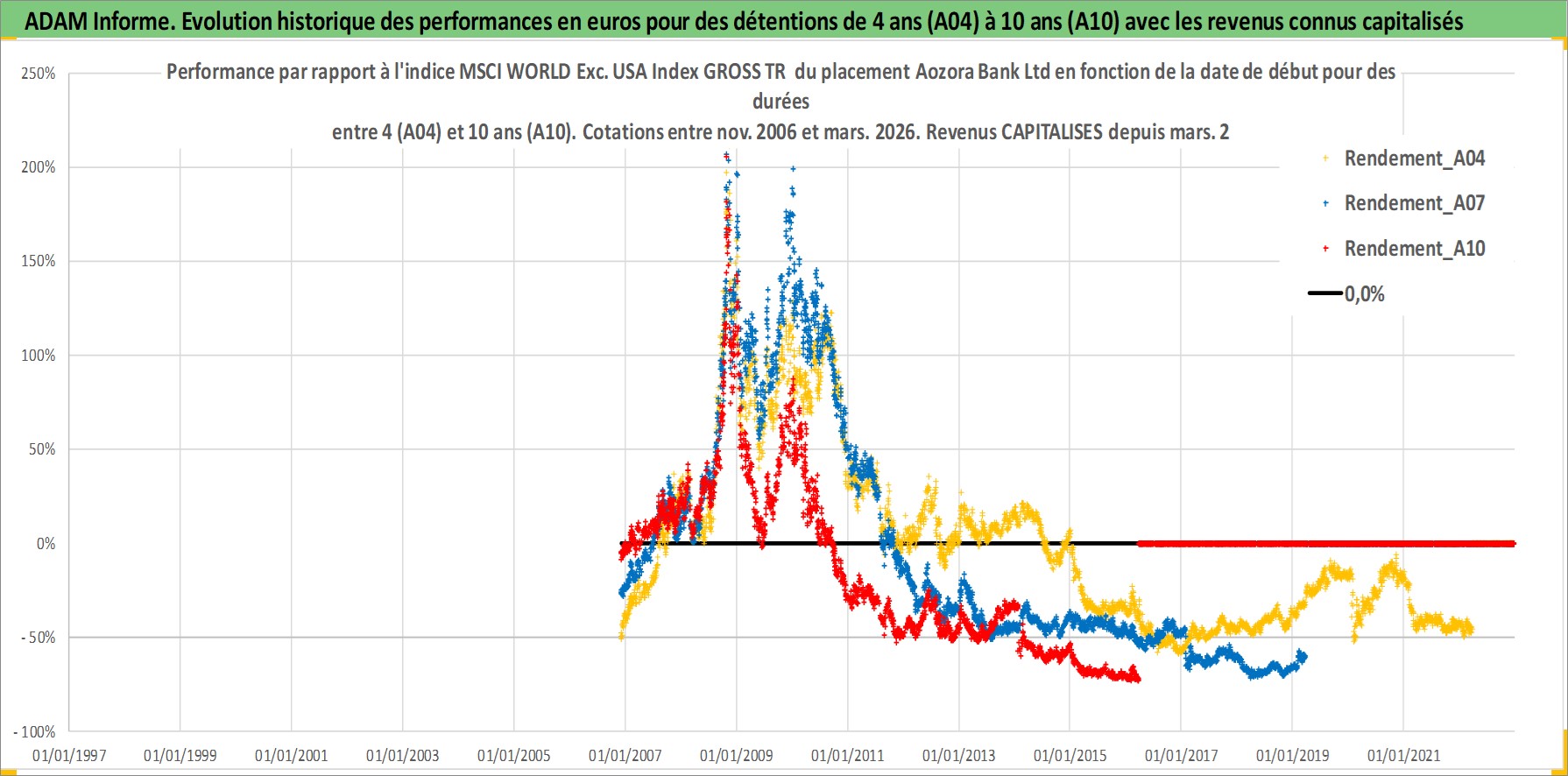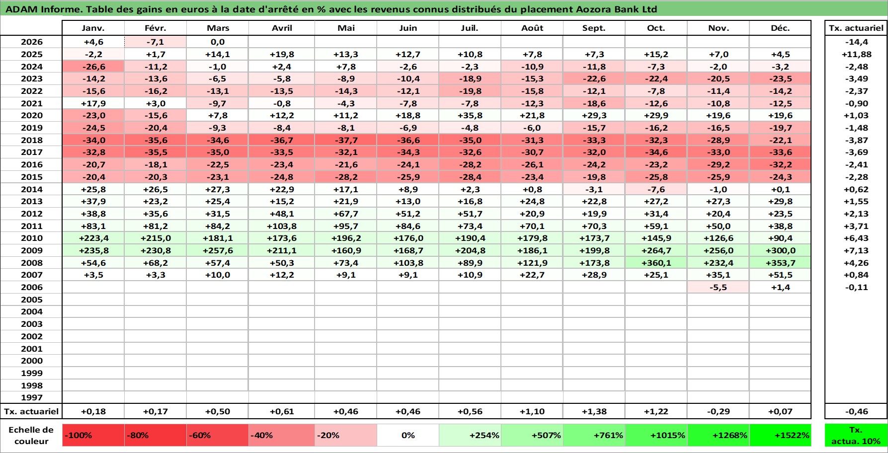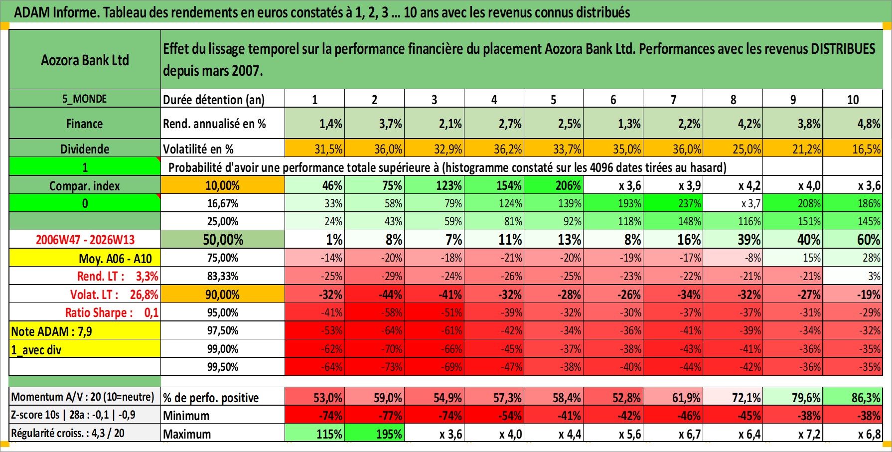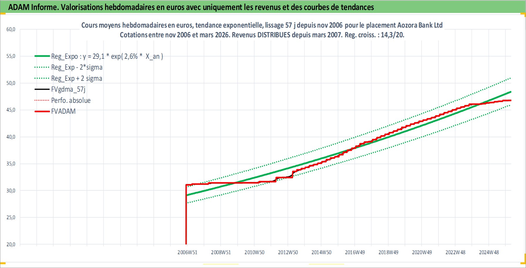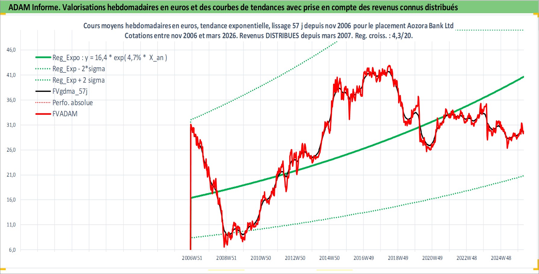 Site dédié aux investisseursPage dédiée sur site financeAnalyse des valorisations hebdomadaires de l'action Aozora Bank Ltd. Cet actif est cote en JPY. Les valorisations sont en contrevaleur EURO et couvrent les semaines 2006W47 a 2026W13. Les revenus de cet actif financier sont pris en compte depuis la semaine 2007W13. La note ESG de cet actif n'est pas connue.