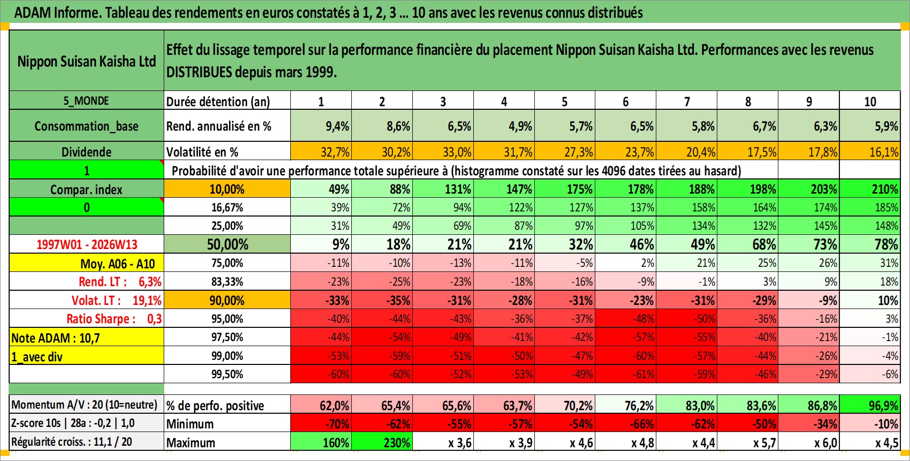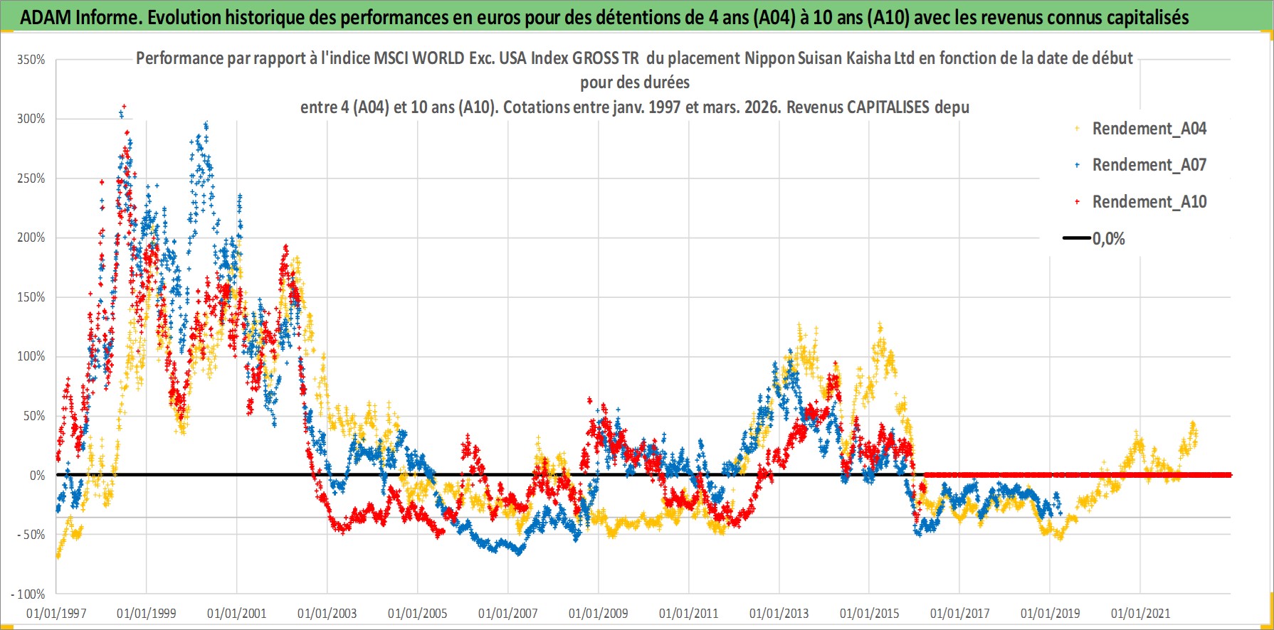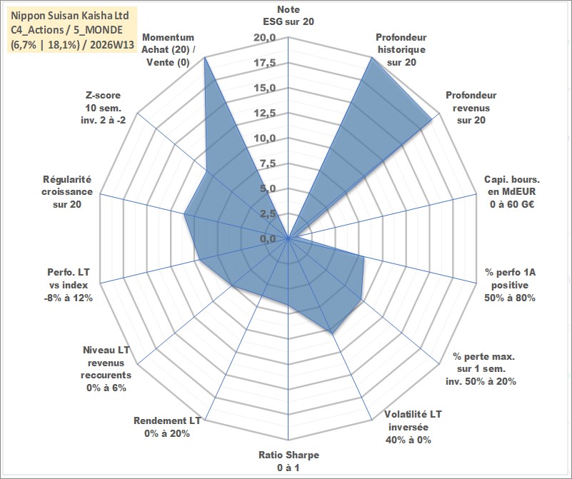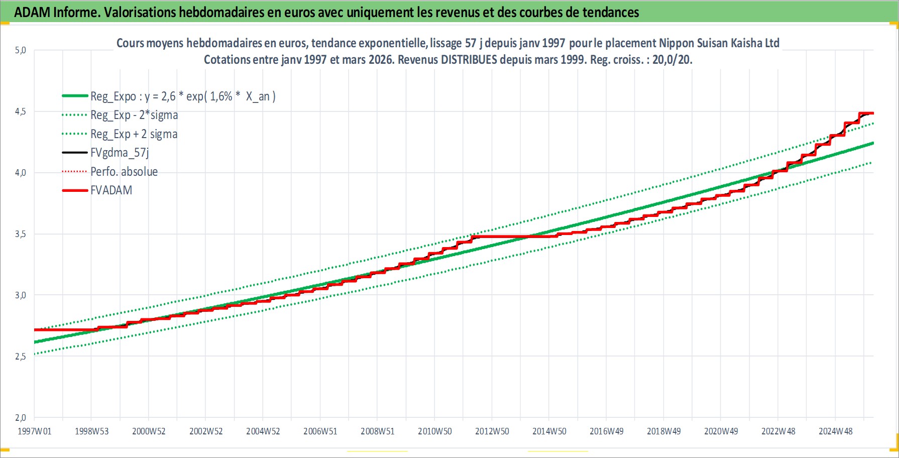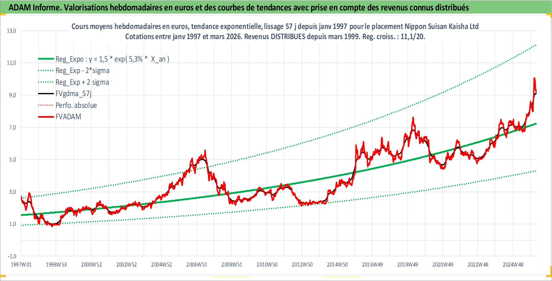 Site dédié aux investisseursPage dédiée sur site financeAnalyse des valorisations hebdomadaires de l'action Nippon Suisan Kaisha Ltd. Cet actif est cote en JPY. Les valorisations sont en contrevaleur EURO et couvrent les semaines 1997W01 a 2026W13. Les revenus de cet actif financier sont pris en compte depuis la semaine 1999W12. La note ESG de cet actif n'est pas connue.