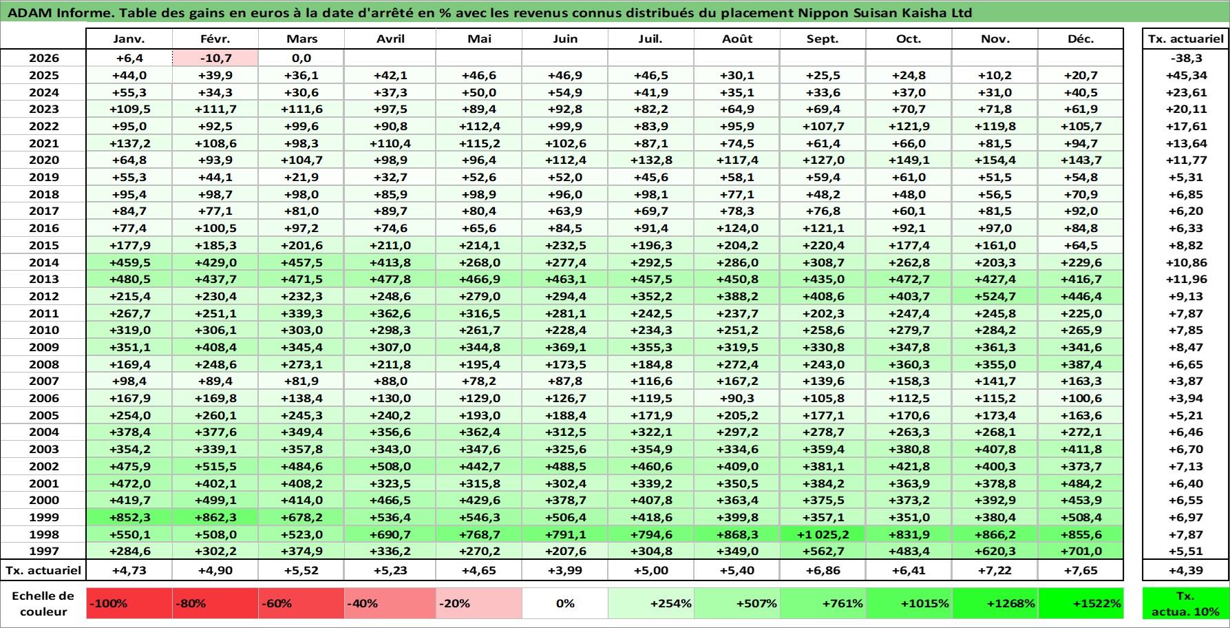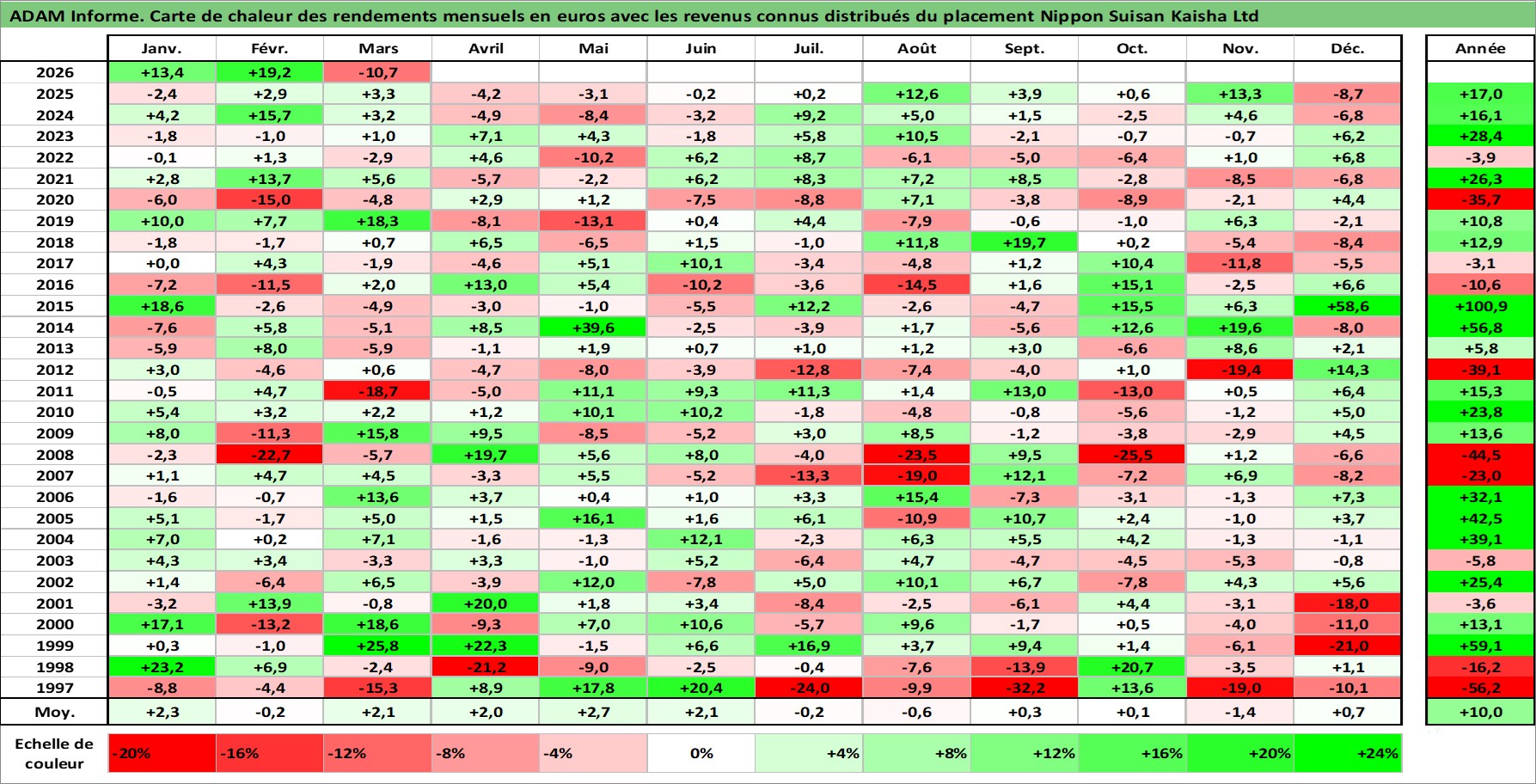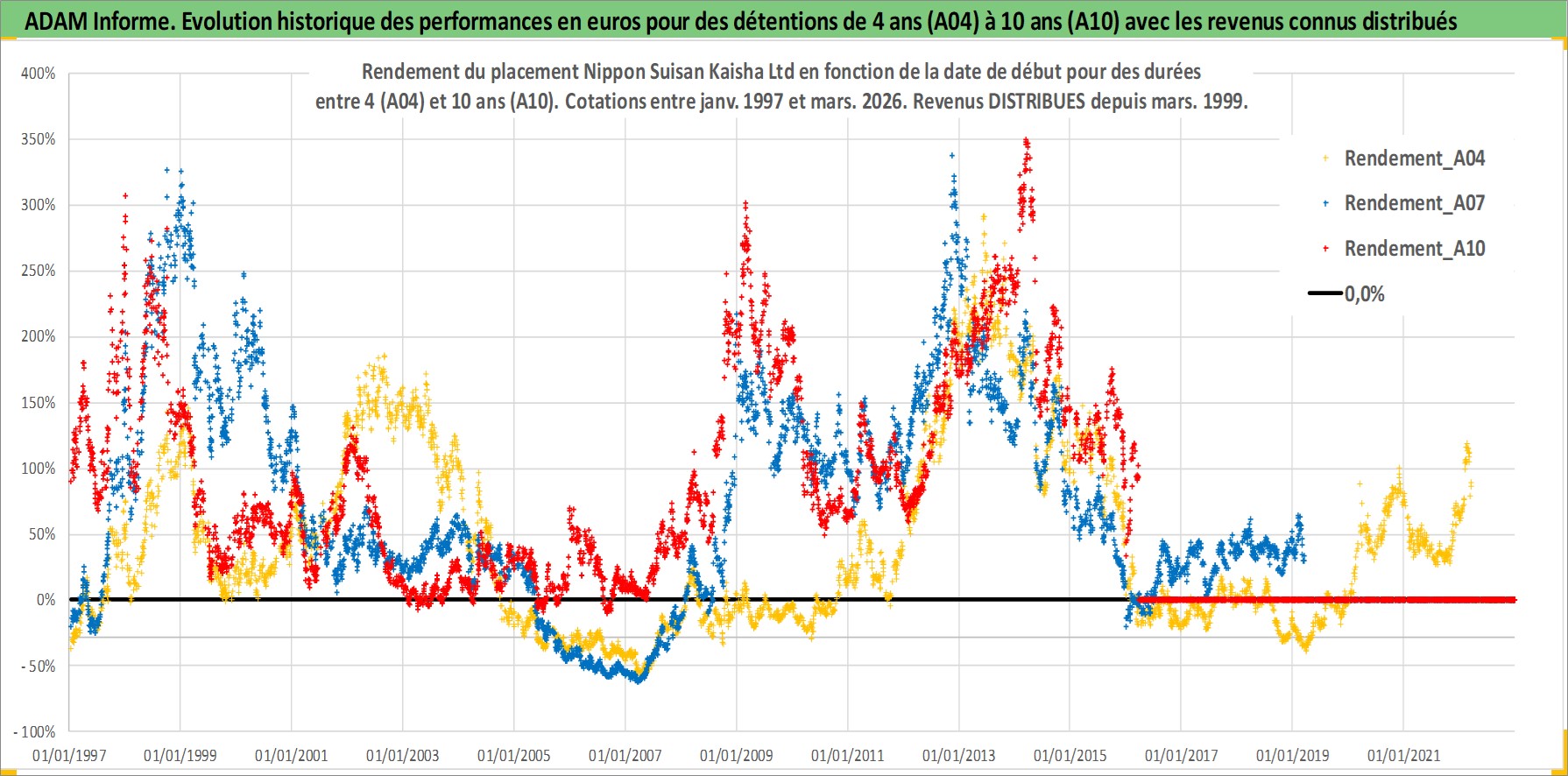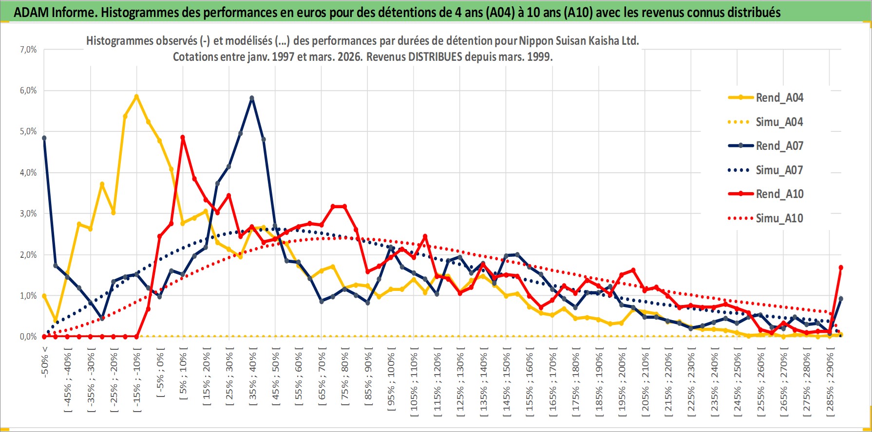 Site dédié aux investisseursPage dédiée sur site financeAnalyse des valorisations hebdomadaires de l'action Nippon Suisan Kaisha Ltd. Cet actif est cote en JPY. Les valorisations sont en contrevaleur EURO et couvrent les semaines 1997W01 a 2026W13. Les revenus de cet actif financier sont pris en compte depuis la semaine 1999W12. La note ESG de cet actif n'est pas connue.