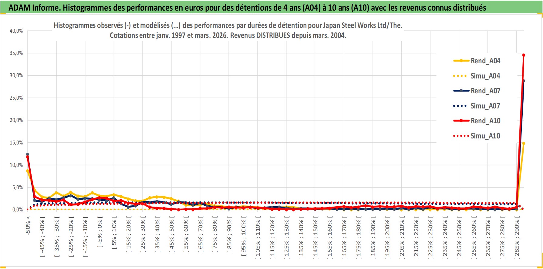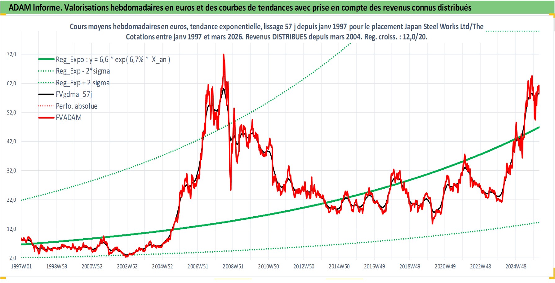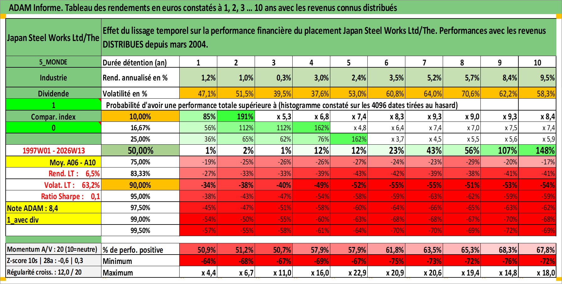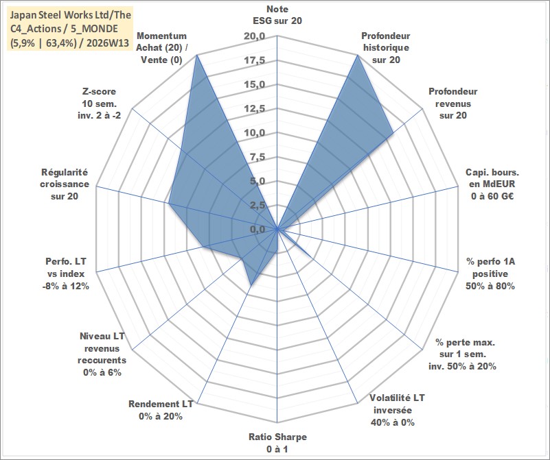 Site dédié aux investisseursPage dédiée sur site financeAnalyse des valorisations hebdomadaires de l'action Japan Steel Works Ltd/The. Cet actif est cote en JPY. Les valorisations sont en contrevaleur EURO et couvrent les semaines 1997W01 a 2026W13. Les revenus de cet actif financier sont pris en compte depuis la semaine 2004W13. La note ESG de cet actif n'est pas connue.
