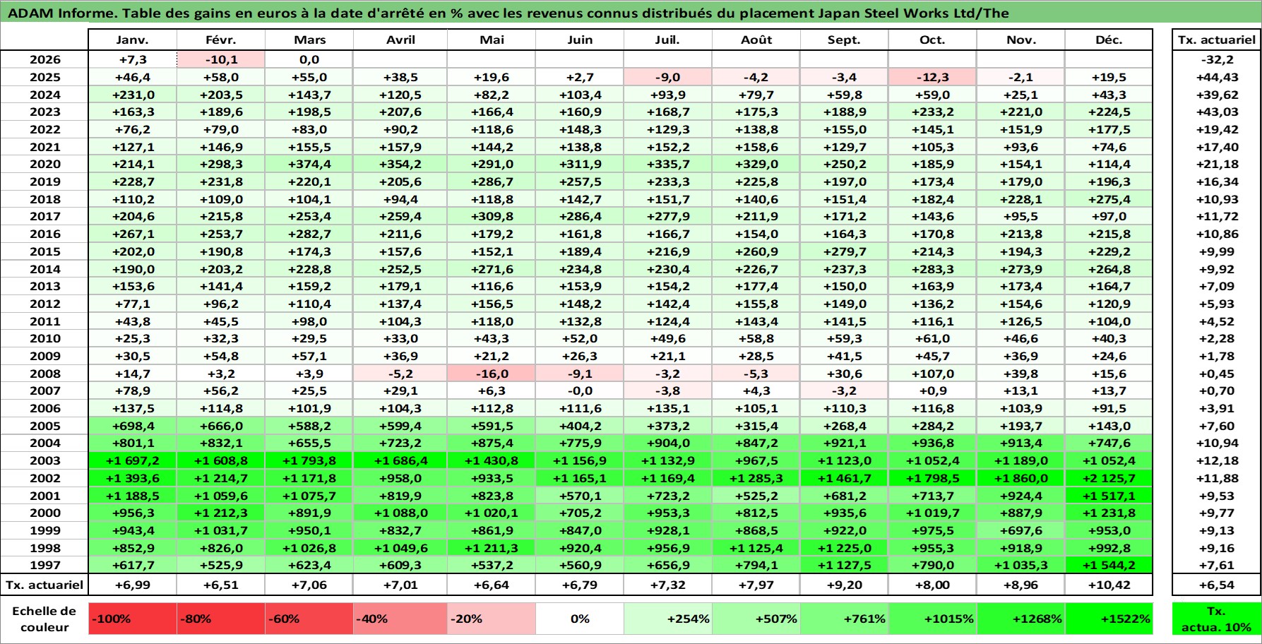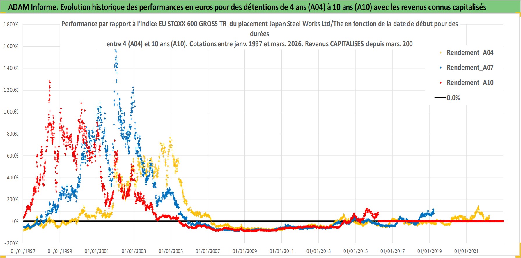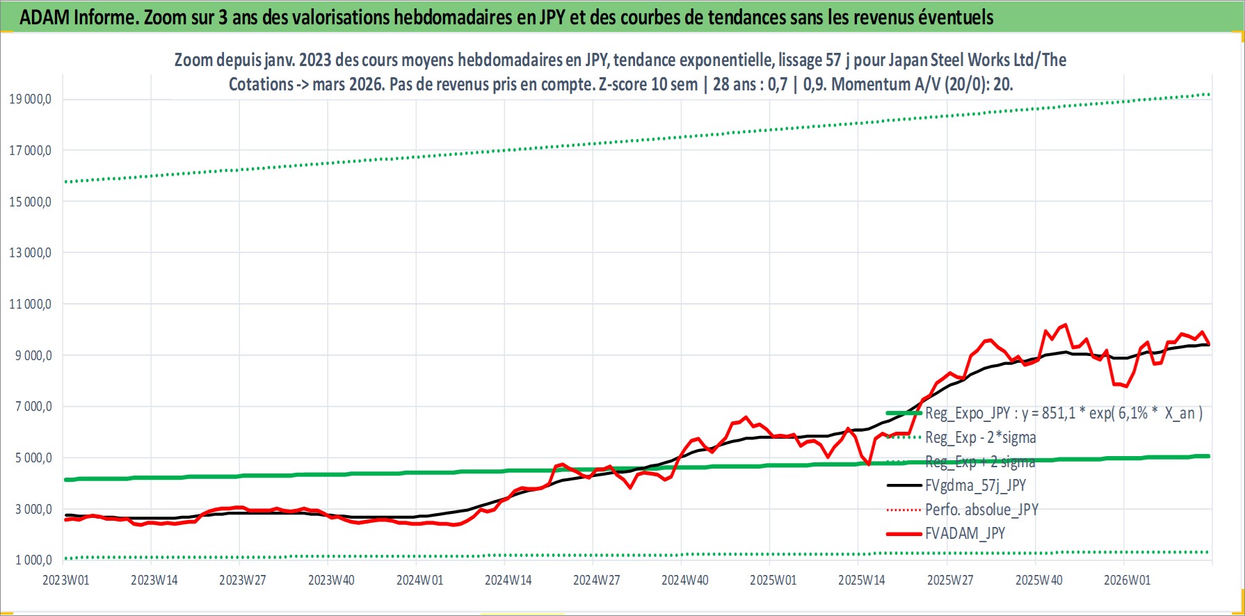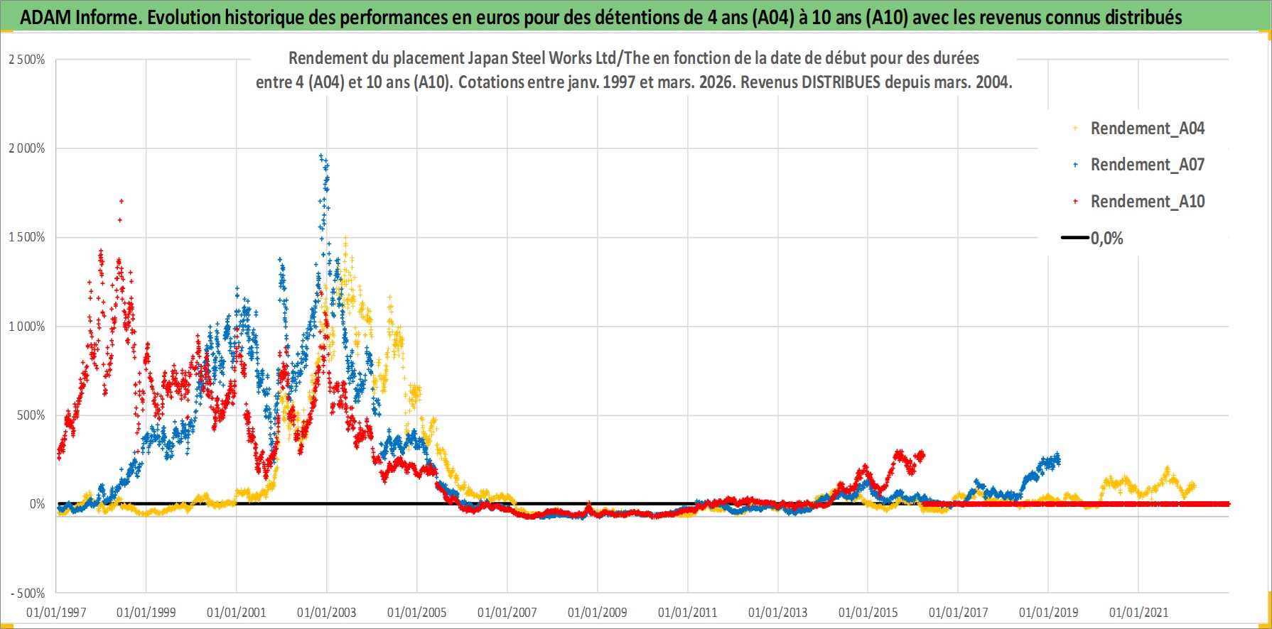 Site dédié aux investisseursPage dédiée sur site financeAnalyse des valorisations hebdomadaires de l'action Japan Steel Works Ltd/The. Cet actif est cote en JPY. Les valorisations sont en contrevaleur EURO et couvrent les semaines 1997W01 a 2026W13. Les revenus de cet actif financier sont pris en compte depuis la semaine 2004W13. La note ESG de cet actif n'est pas connue.