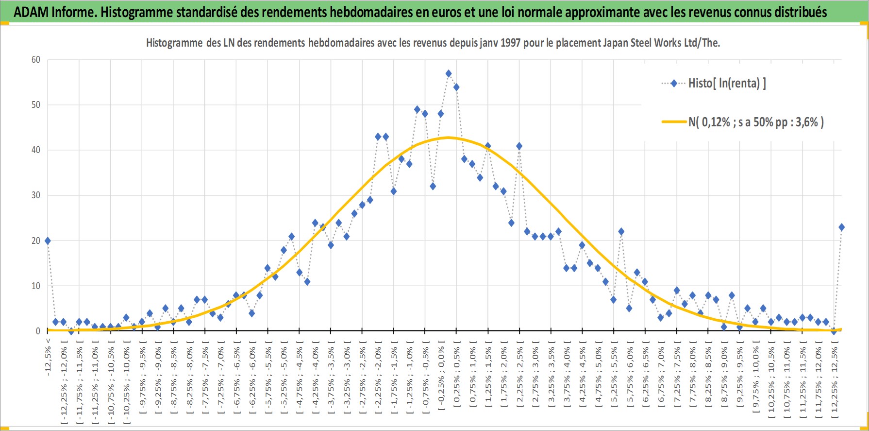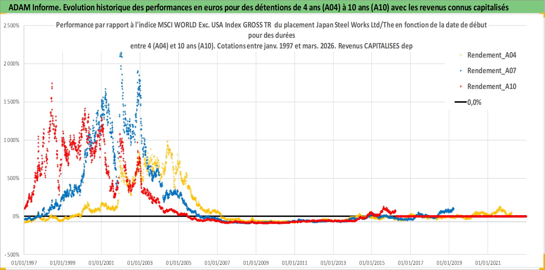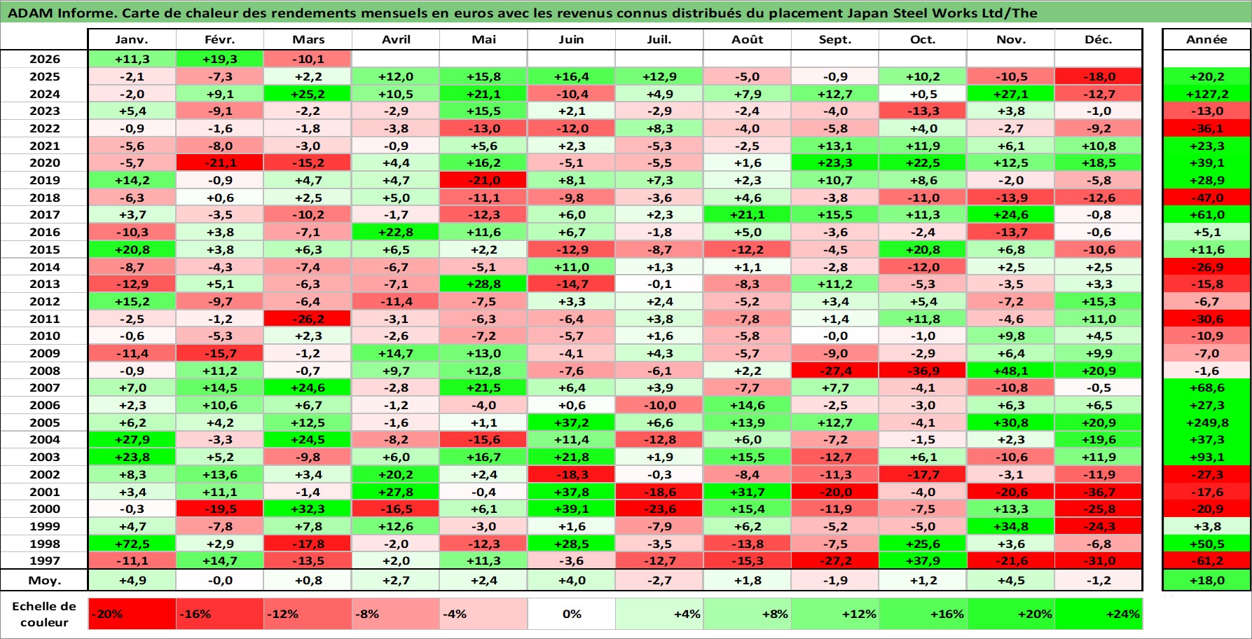 Site dédié aux investisseursPage dédiée sur site financeAnalyse des valorisations hebdomadaires de l'action Japan Steel Works Ltd/The. Cet actif est cote en JPY. Les valorisations sont en contrevaleur EURO et couvrent les semaines 1997W01 a 2026W13. Les revenus de cet actif financier sont pris en compte depuis la semaine 2004W13. La note ESG de cet actif n'est pas connue.