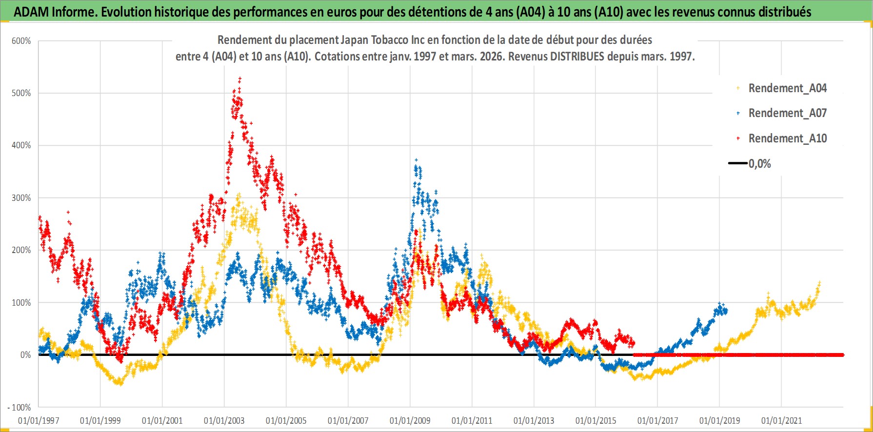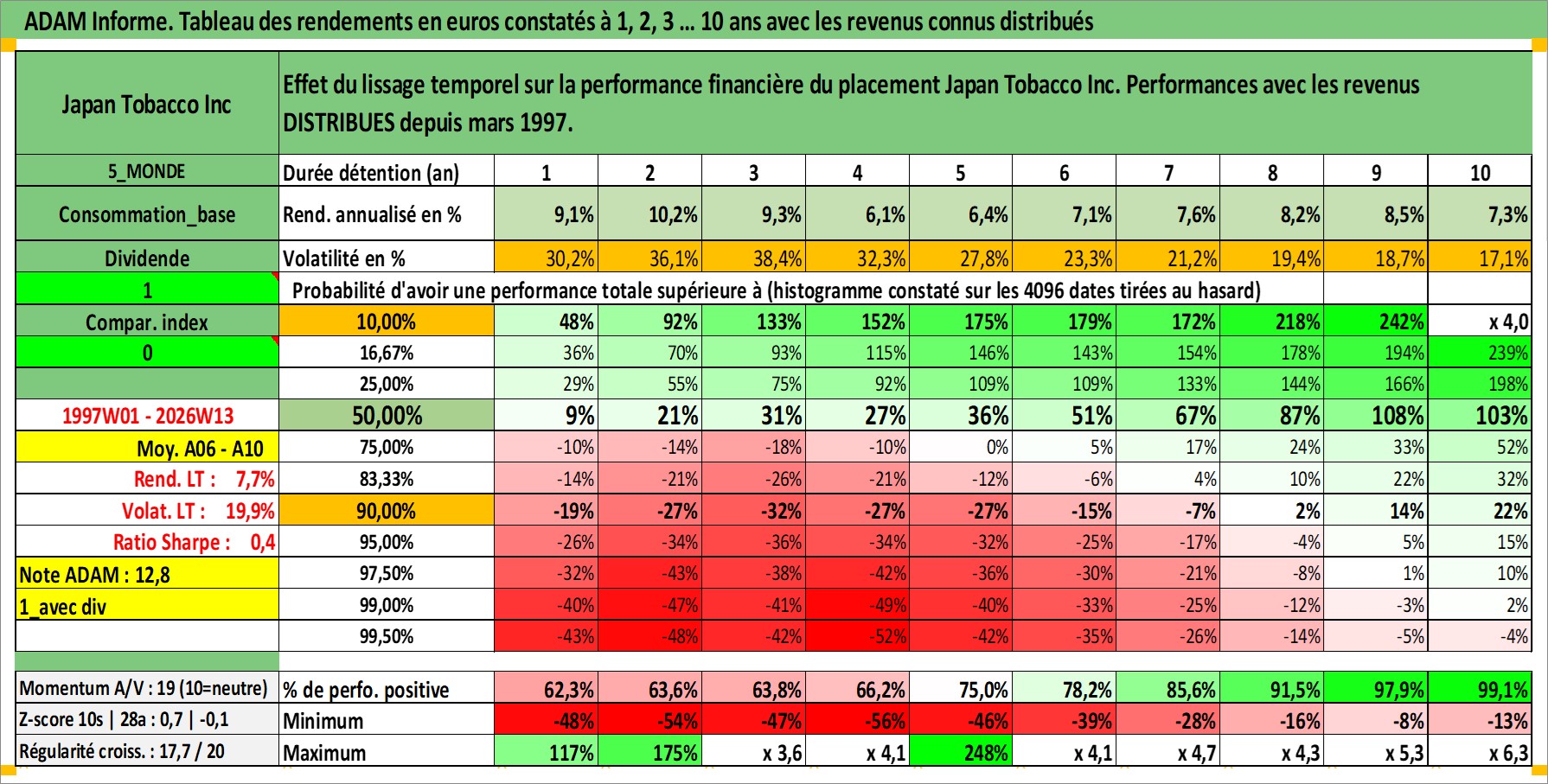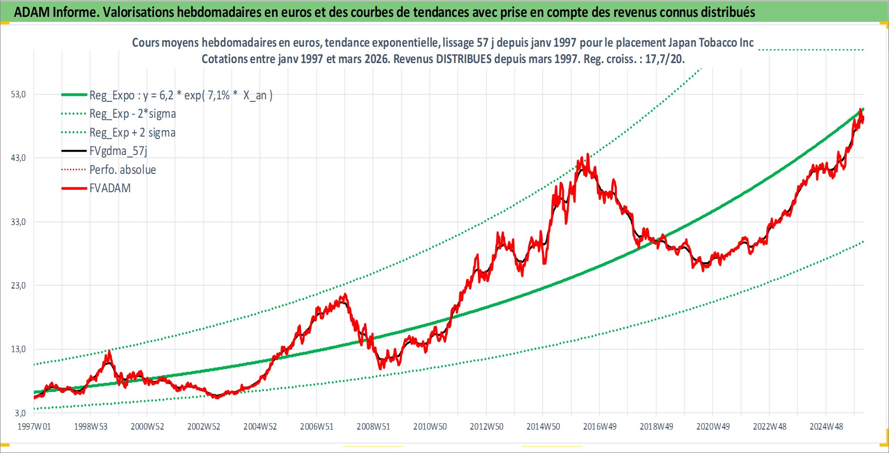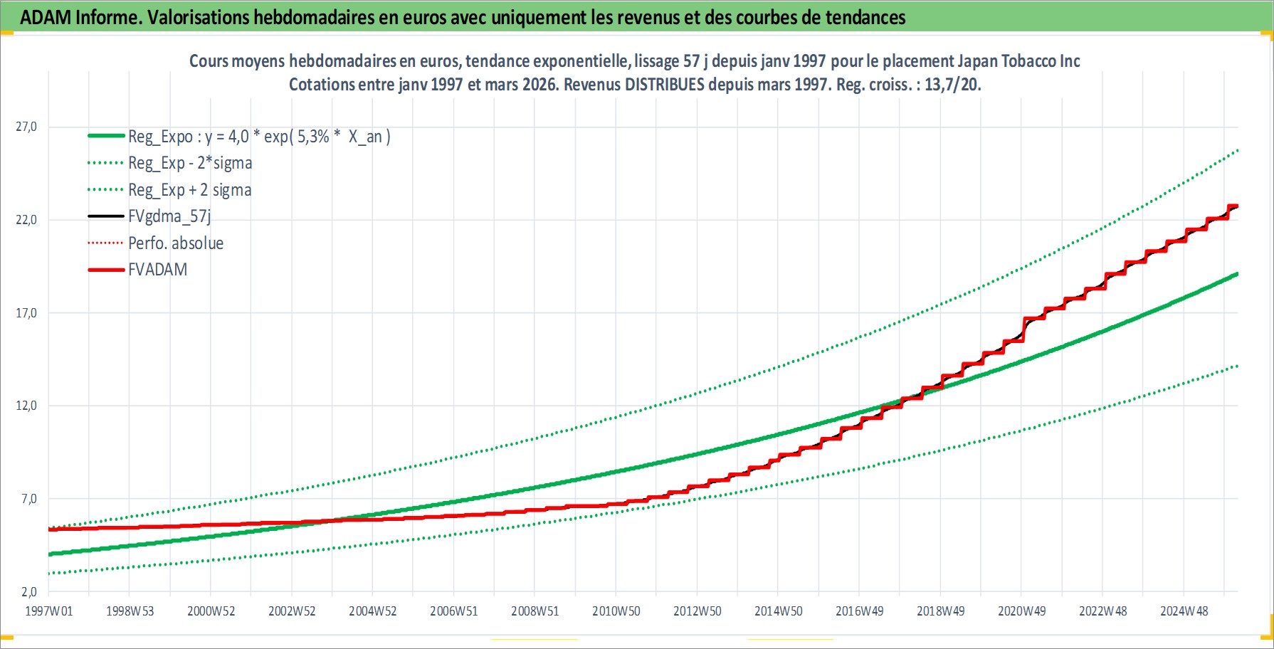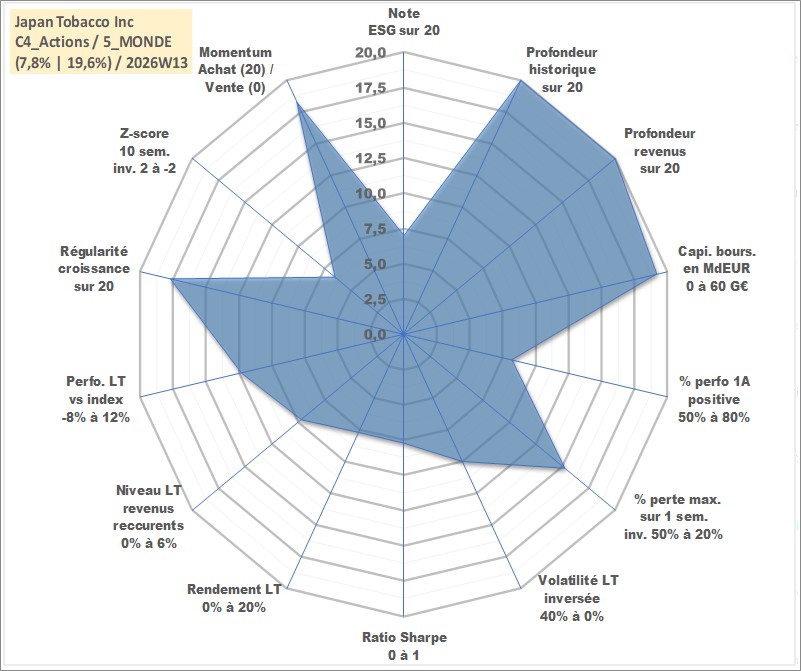Site dédié aux investisseursPage dédiée sur site financeAnalyse des valorisations hebdomadaires de l'action Japan Tobacco Inc. Cet actif est cote en JPY. Les valorisations sont en contrevaleur EURO et couvrent les semaines 1997W01 a 2026W13. Les revenus de cet actif financier sont pris en compte depuis la semaine 1997W13. La note globale ESG de cet actif est estimee a 7.0 (apres rebasage entre 0 et 20).