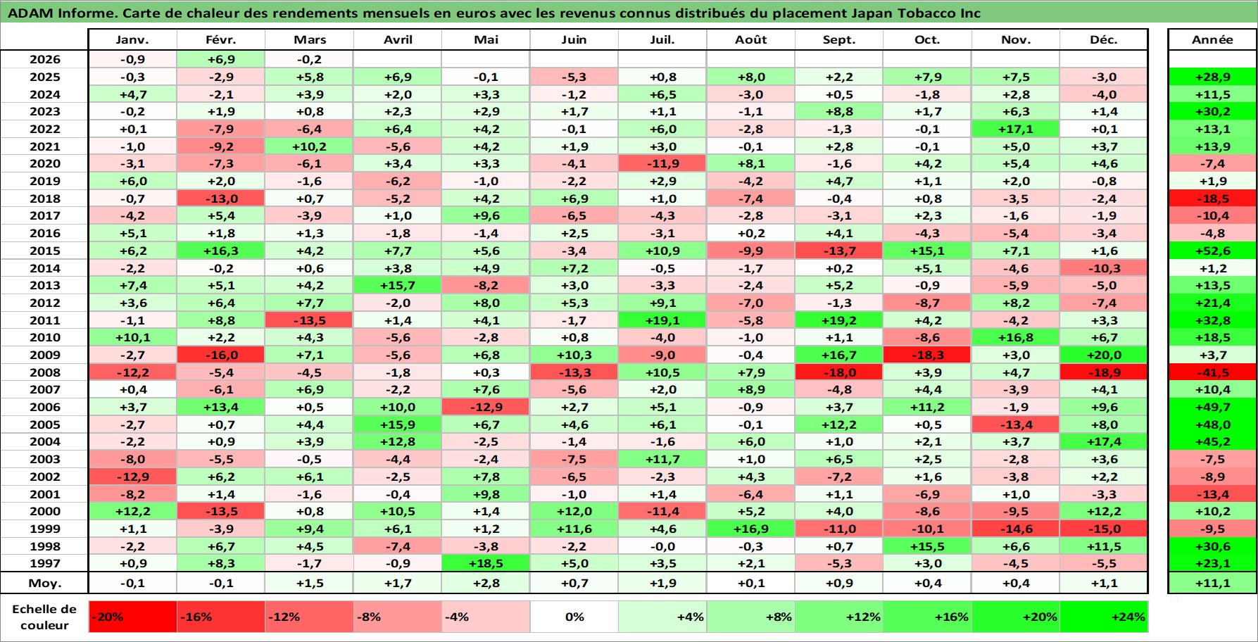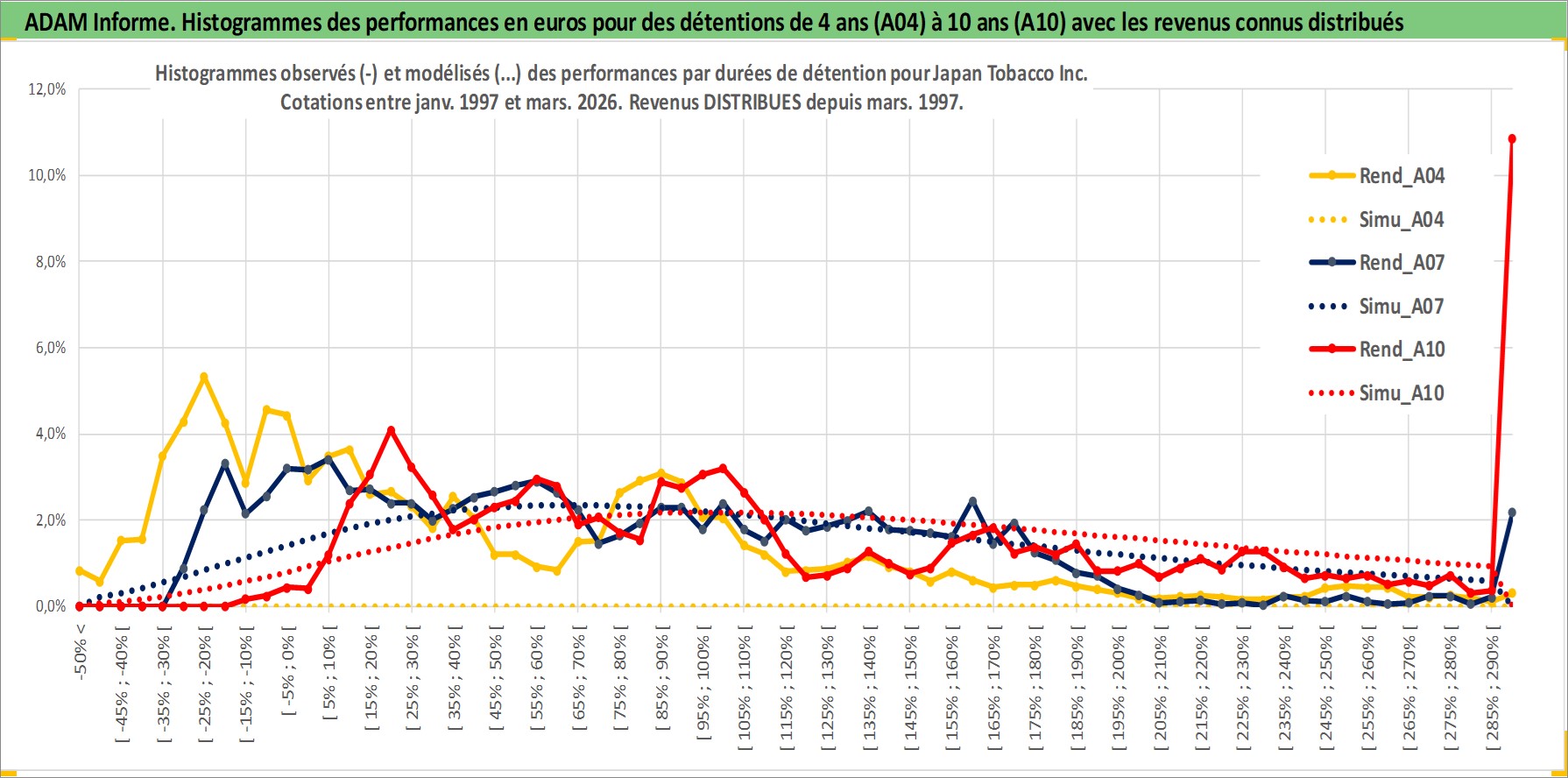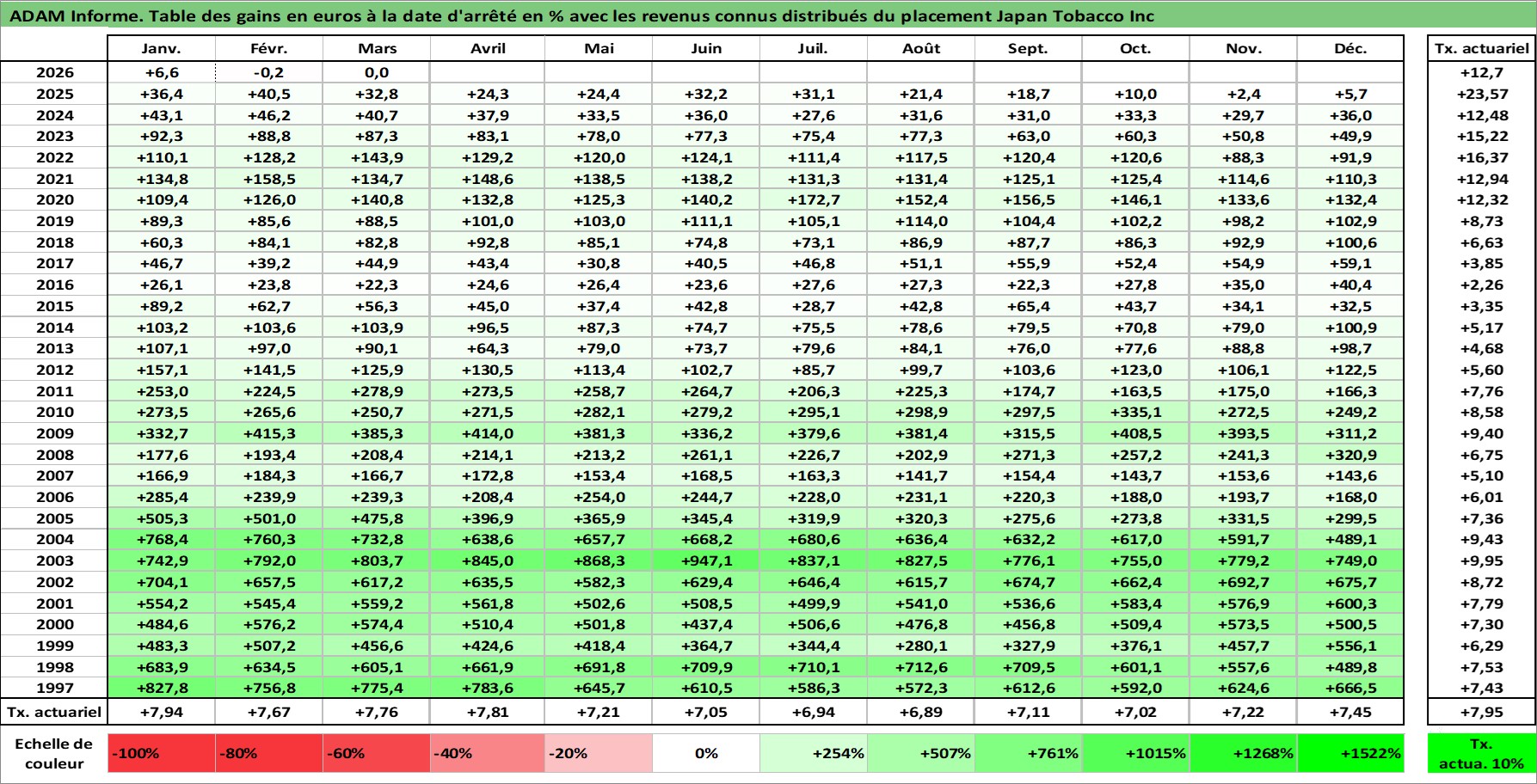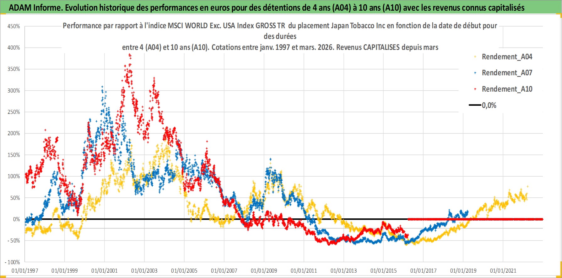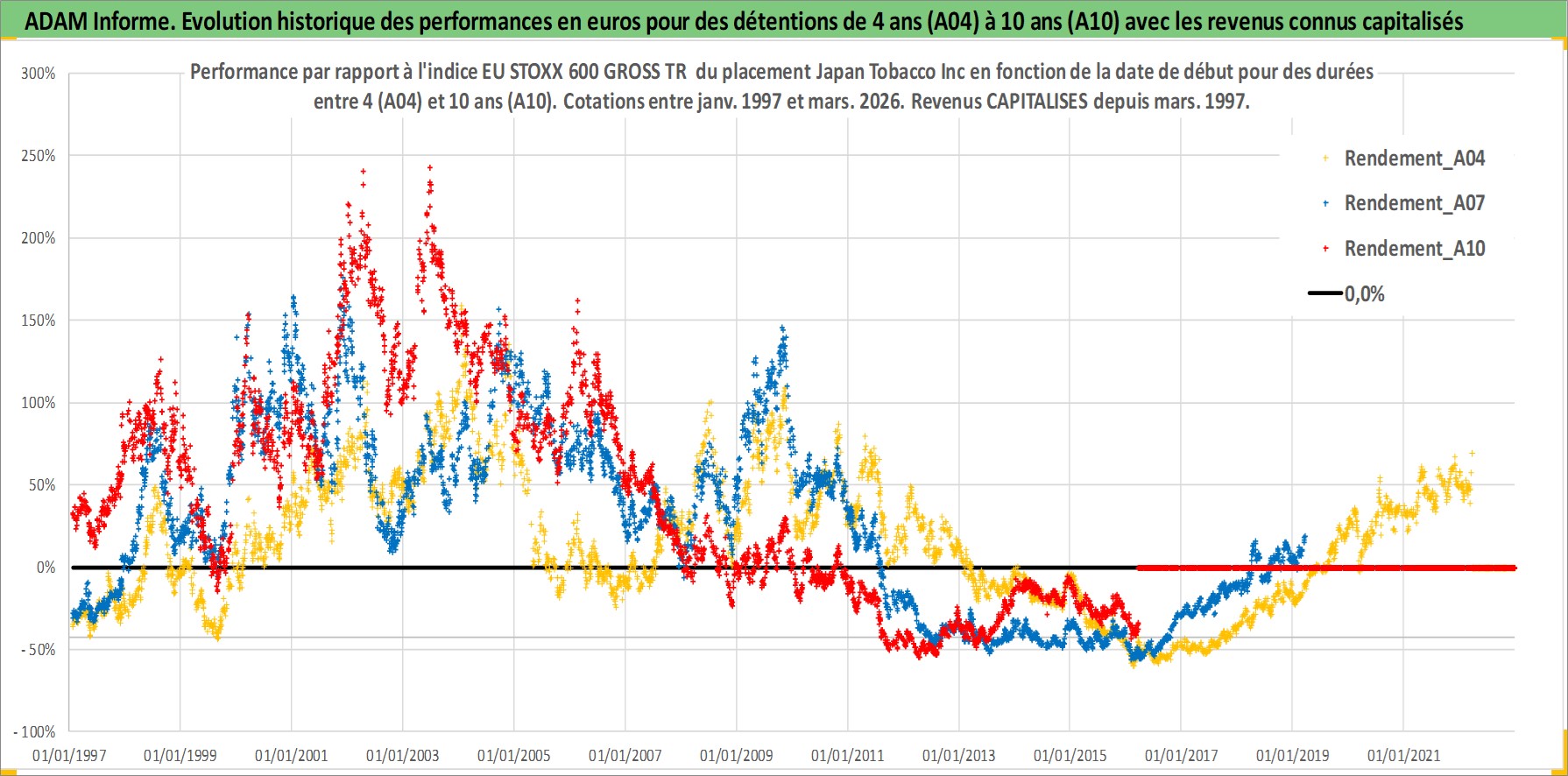 Site dédié aux investisseursPage dédiée sur site financeAnalyse des valorisations hebdomadaires de l'action Japan Tobacco Inc. Cet actif est cote en JPY. Les valorisations sont en contrevaleur EURO et couvrent les semaines 1997W01 a 2026W13. Les revenus de cet actif financier sont pris en compte depuis la semaine 1997W13. La note globale ESG de cet actif est estimee a 7.0 (apres rebasage entre 0 et 20).