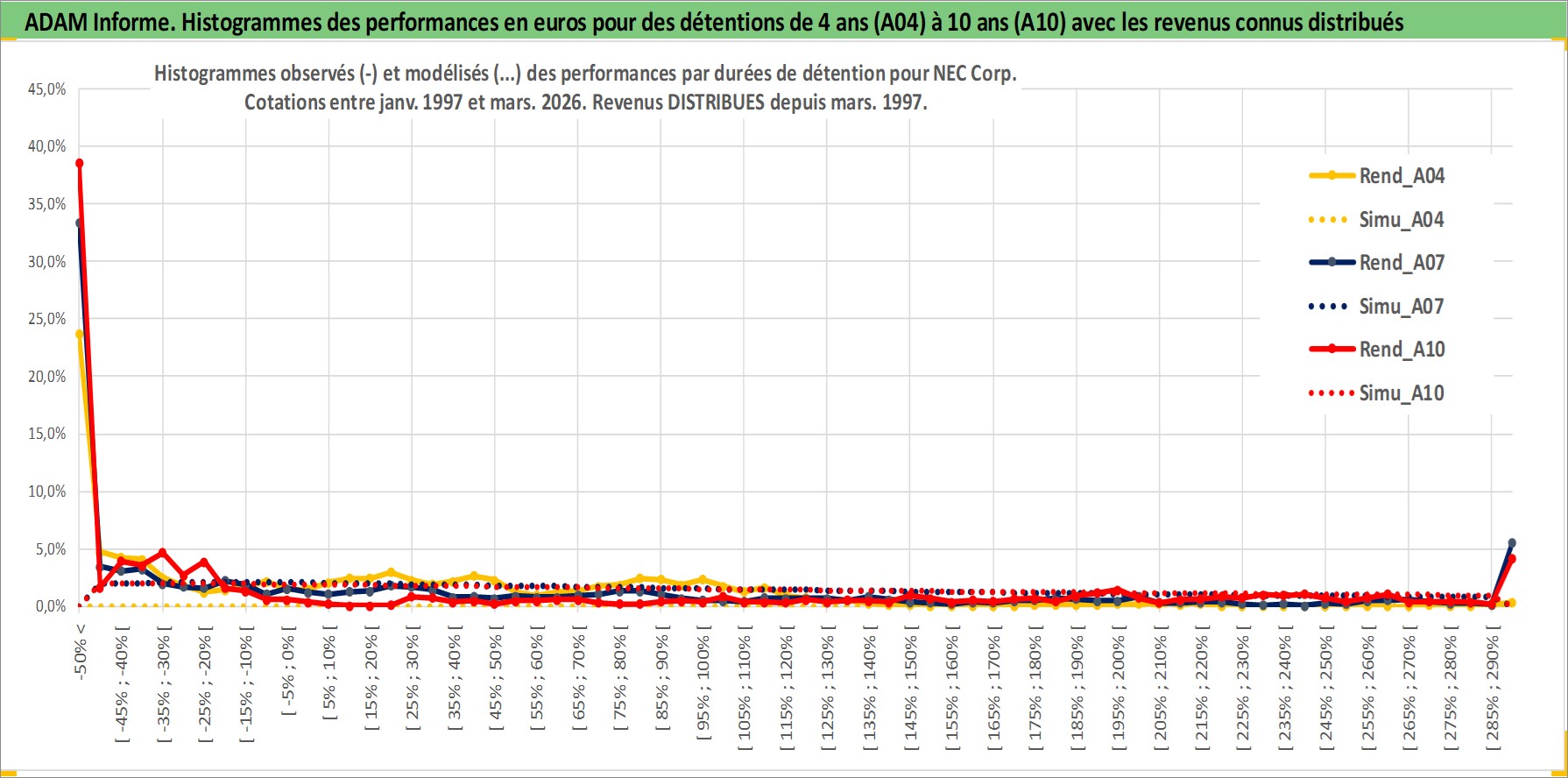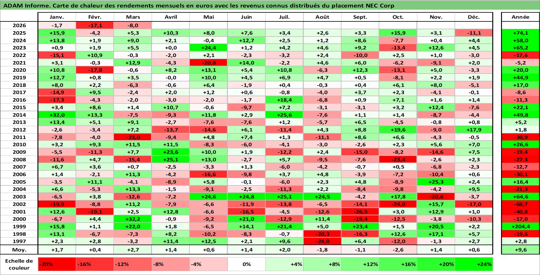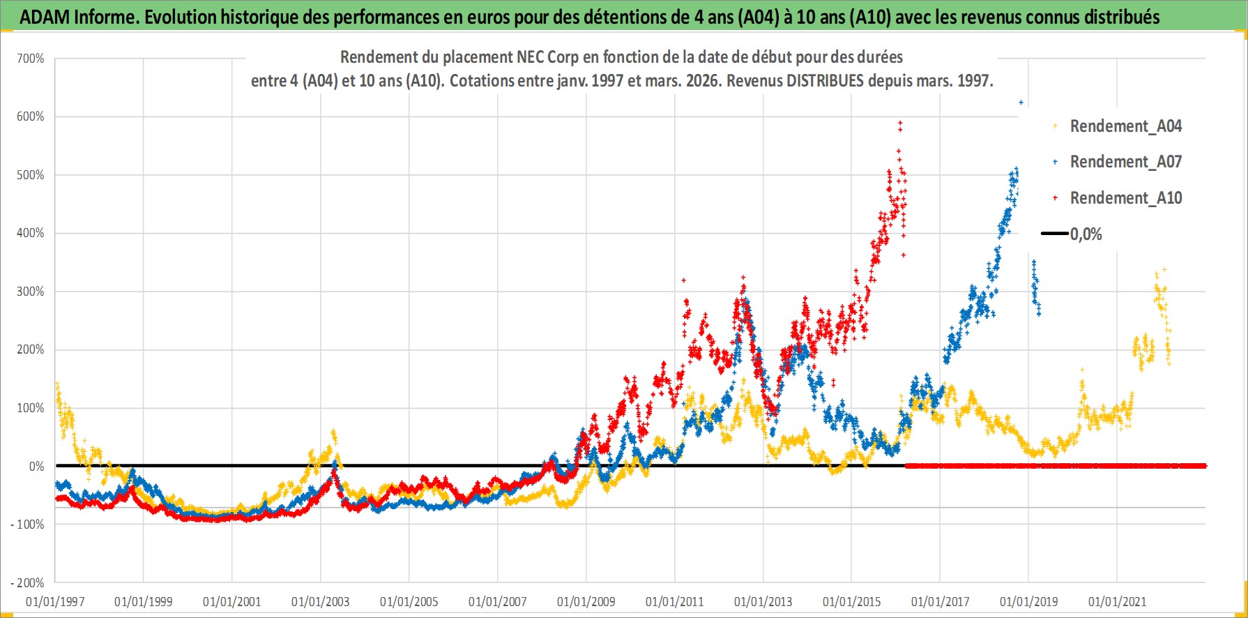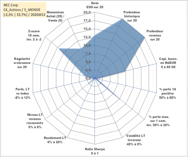 Site dédié aux investisseursPage dédiée sur site financeAnalyse des valorisations hebdomadaires de l'action NEC Corp. Cet actif est cote en JPY. Les valorisations sont en contrevaleur EURO et couvrent les semaines 1997W01 a 2026W13. Les revenus de cet actif financier sont pris en compte depuis la semaine 1997W13. La note globale ESG de cet actif est estimee a 13.0 (apres rebasage entre 0 et 20).