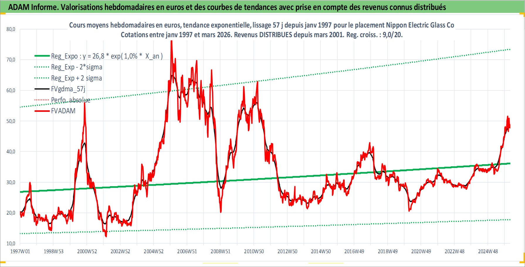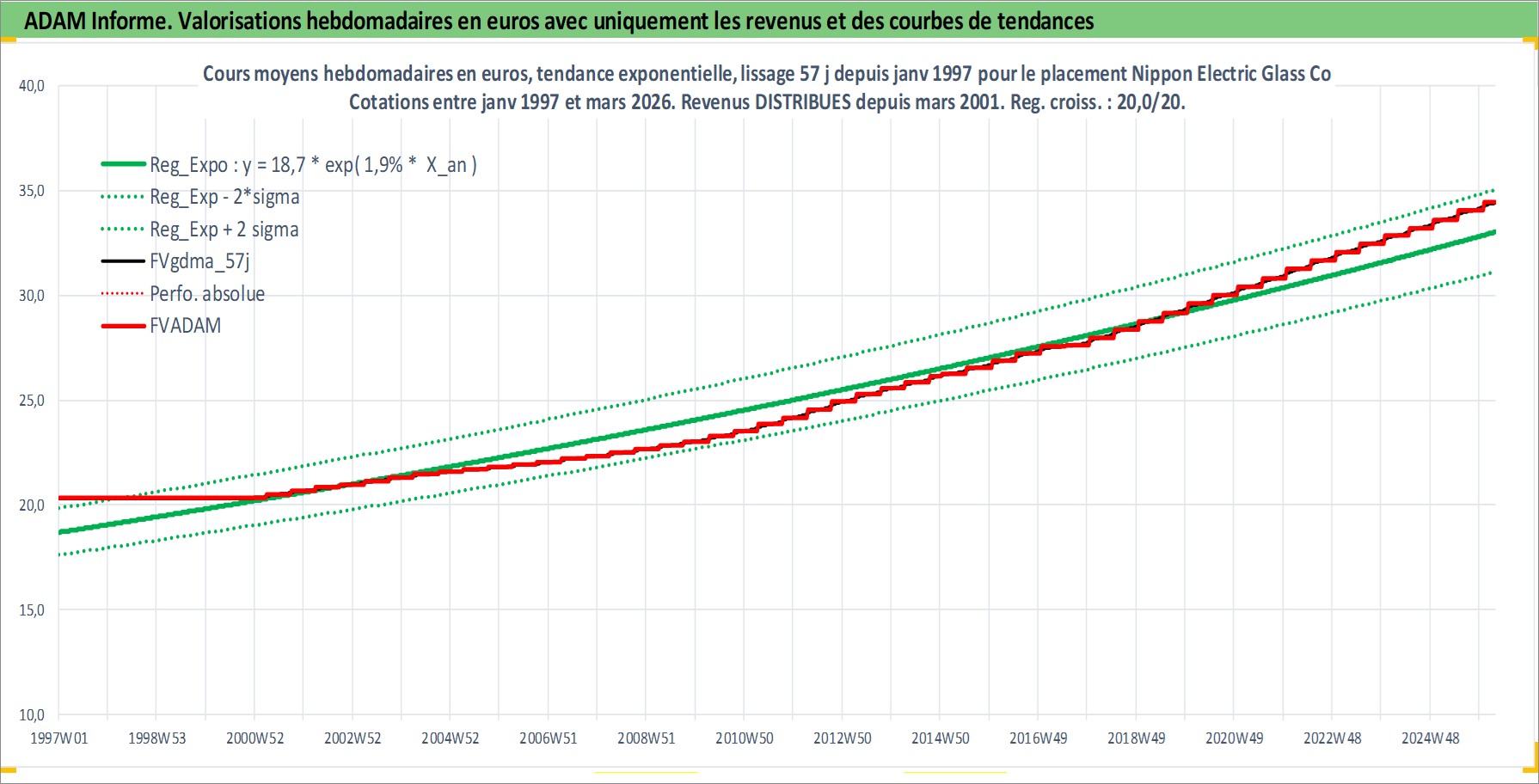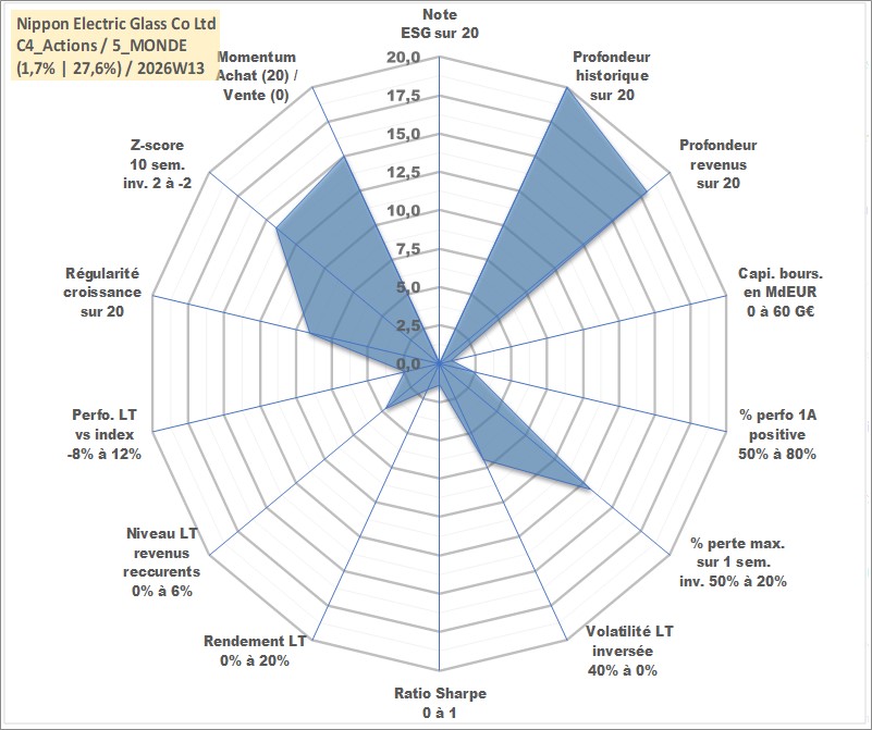 Site dédié aux investisseursPage dédiée sur site financeAnalyse des valorisations hebdomadaires de l'action Nippon Electric Glass Co Ltd. Cet actif est cote en JPY. Les valorisations sont en contrevaleur EURO et couvrent les semaines 1997W01 a 2026W13. Les revenus de cet actif financier sont pris en compte depuis la semaine 2001W13. La note ESG de cet actif n'est pas connue.