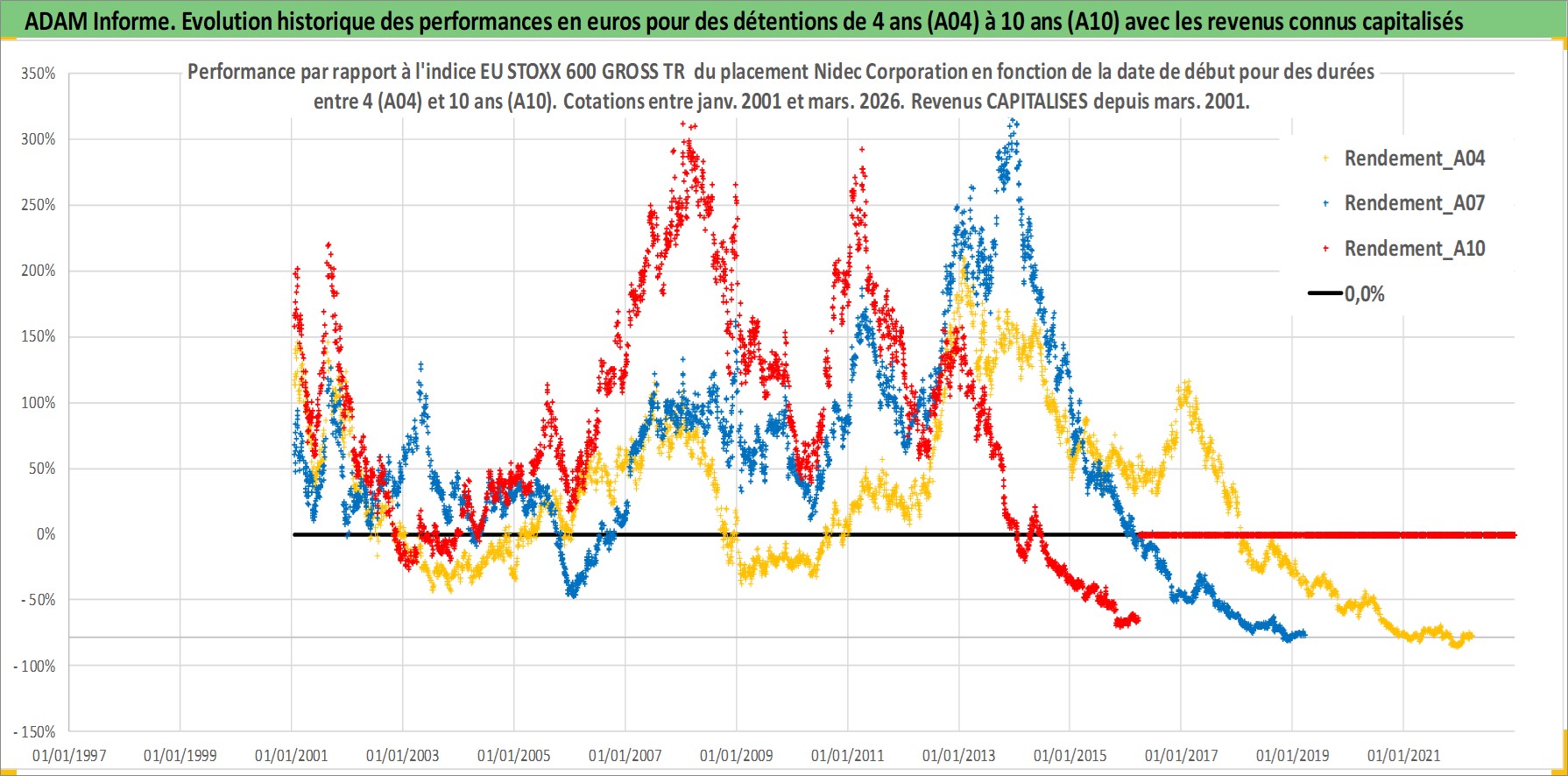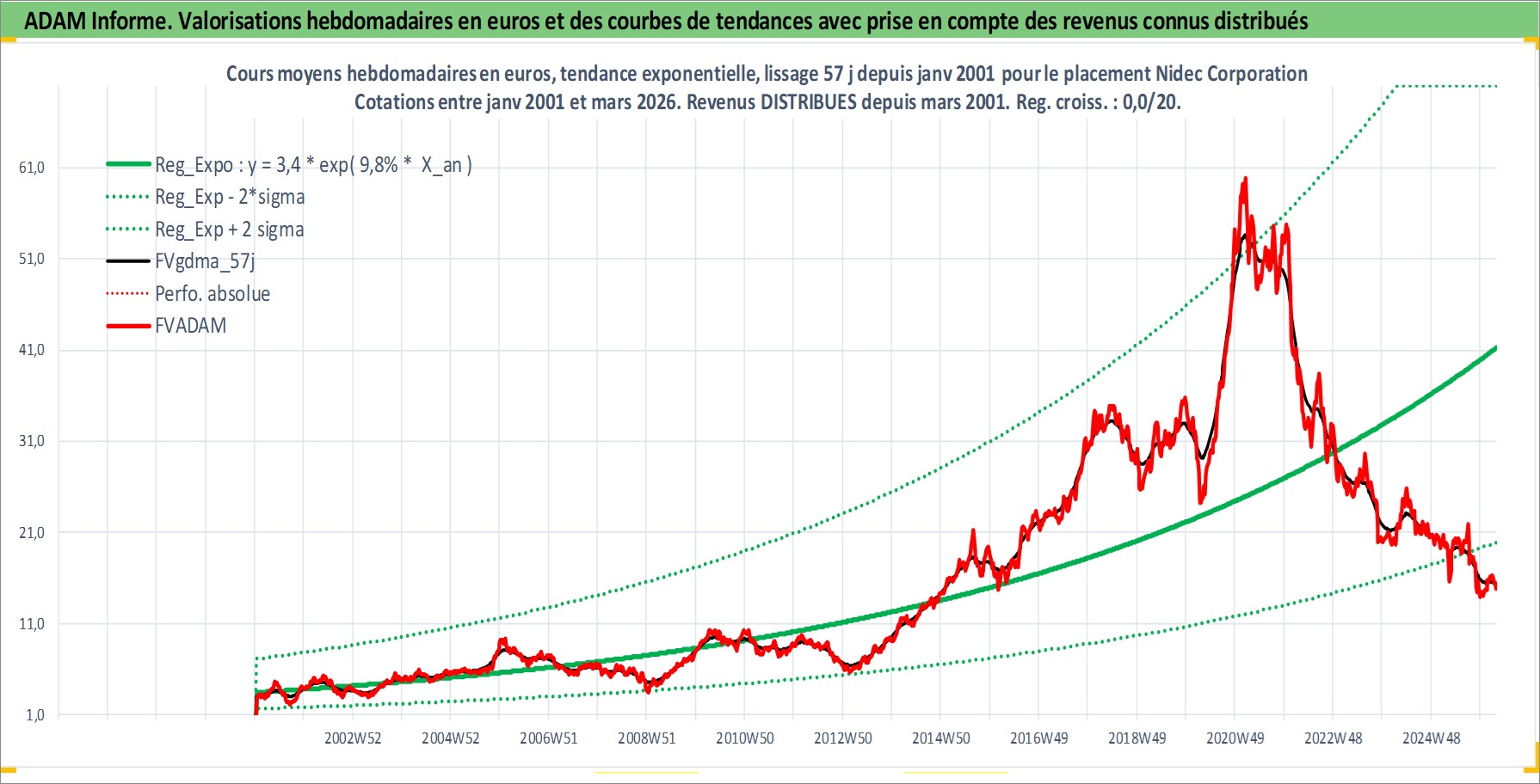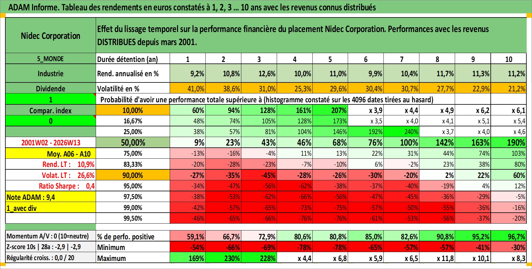 Site dédié aux investisseursPage dédiée sur site financeAnalyse des valorisations hebdomadaires de l'action Nidec Corporation. Cet actif est cote en JPY. Les valorisations sont en contrevaleur EURO et couvrent les semaines 2001W02 a 2026W13. Les revenus de cet actif financier sont pris en compte depuis la semaine 2001W13. La note globale ESG de cet actif est estimee a 8.0 (apres rebasage entre 0 et 20).