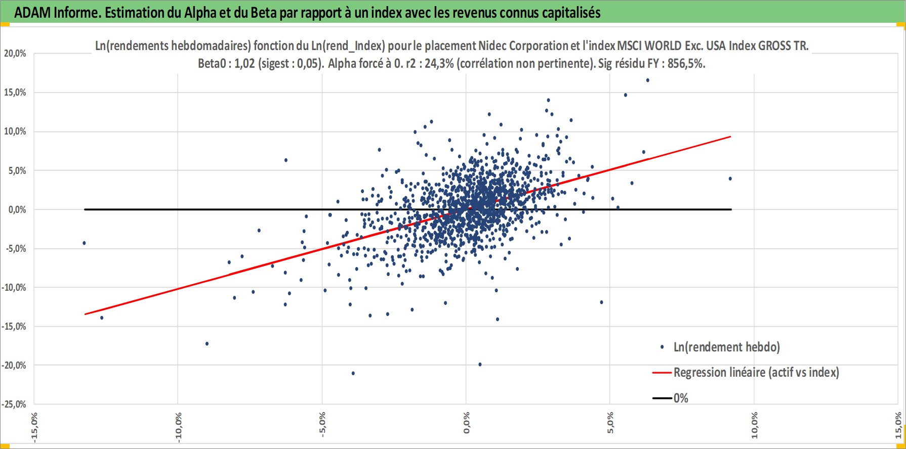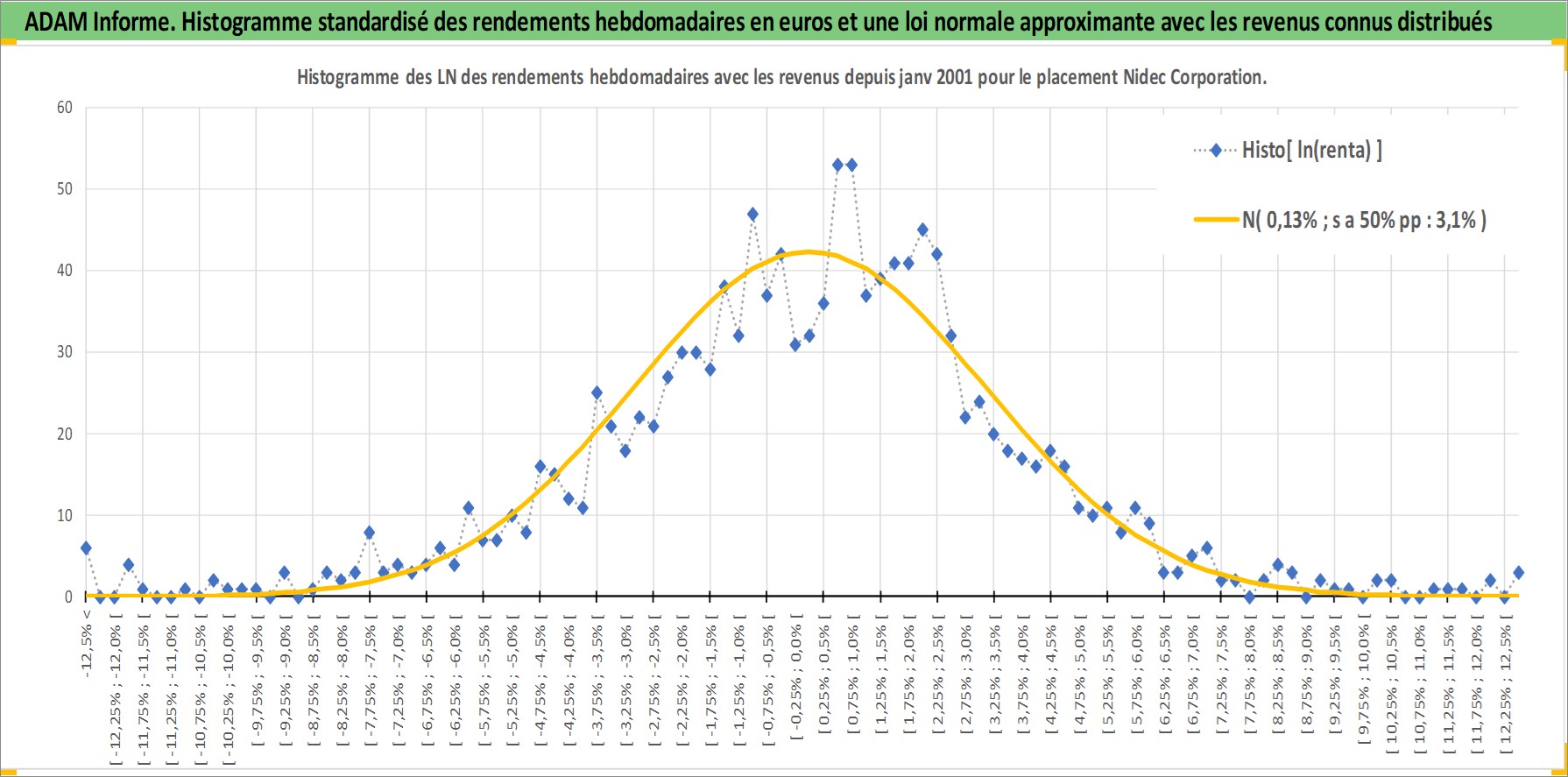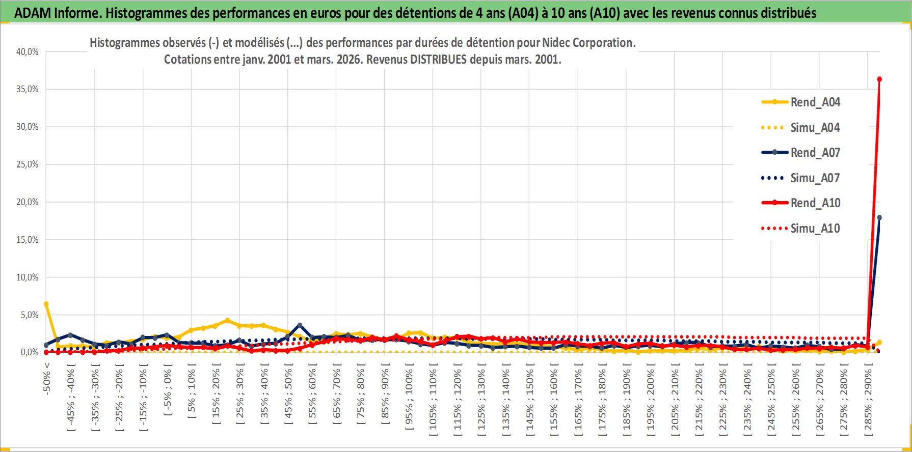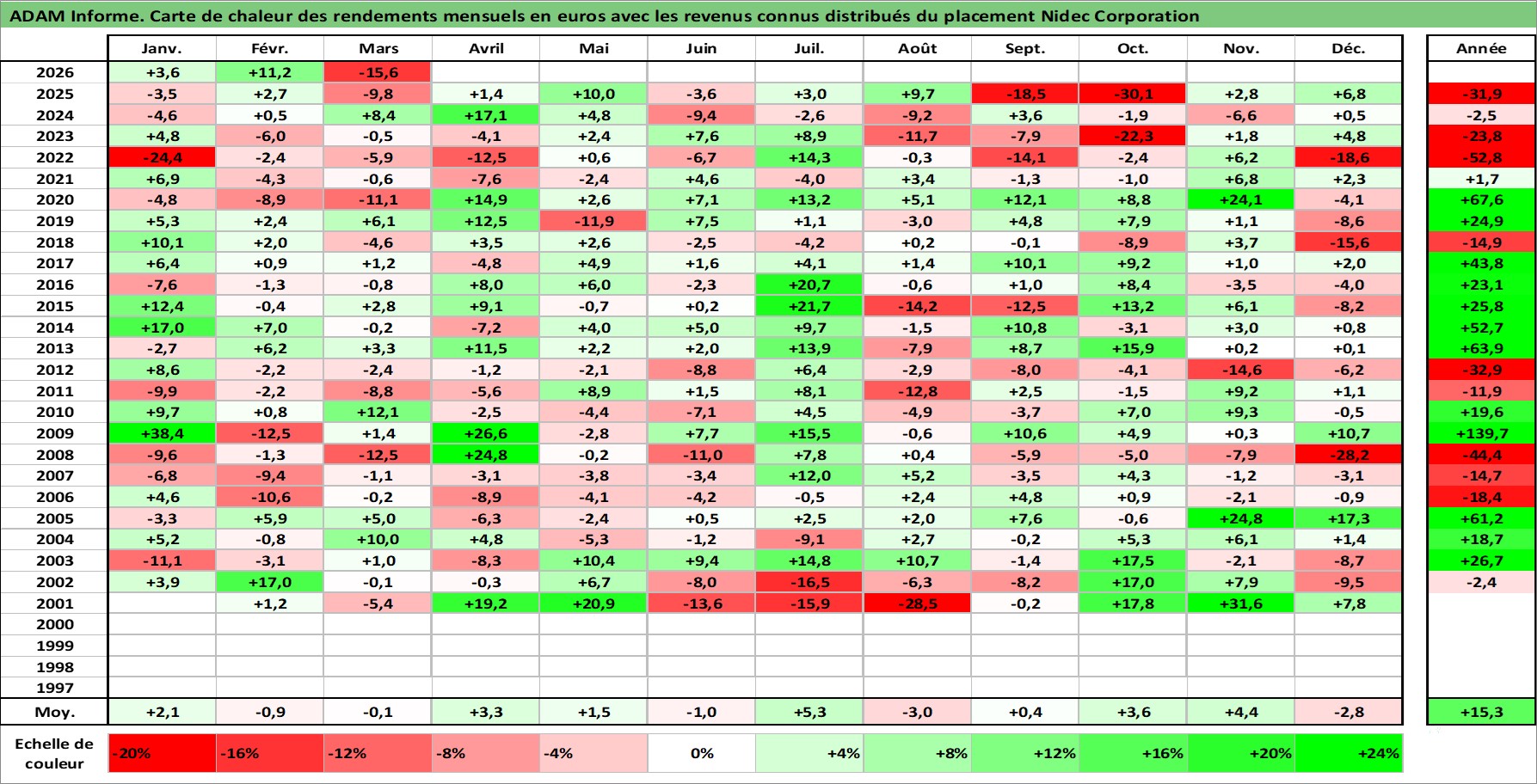 Site dédié aux investisseursPage dédiée sur site financeAnalyse des valorisations hebdomadaires de l'action Nidec Corporation. Cet actif est cote en JPY. Les valorisations sont en contrevaleur EURO et couvrent les semaines 2001W02 a 2026W13. Les revenus de cet actif financier sont pris en compte depuis la semaine 2001W13. La note globale ESG de cet actif est estimee a 8.0 (apres rebasage entre 0 et 20).