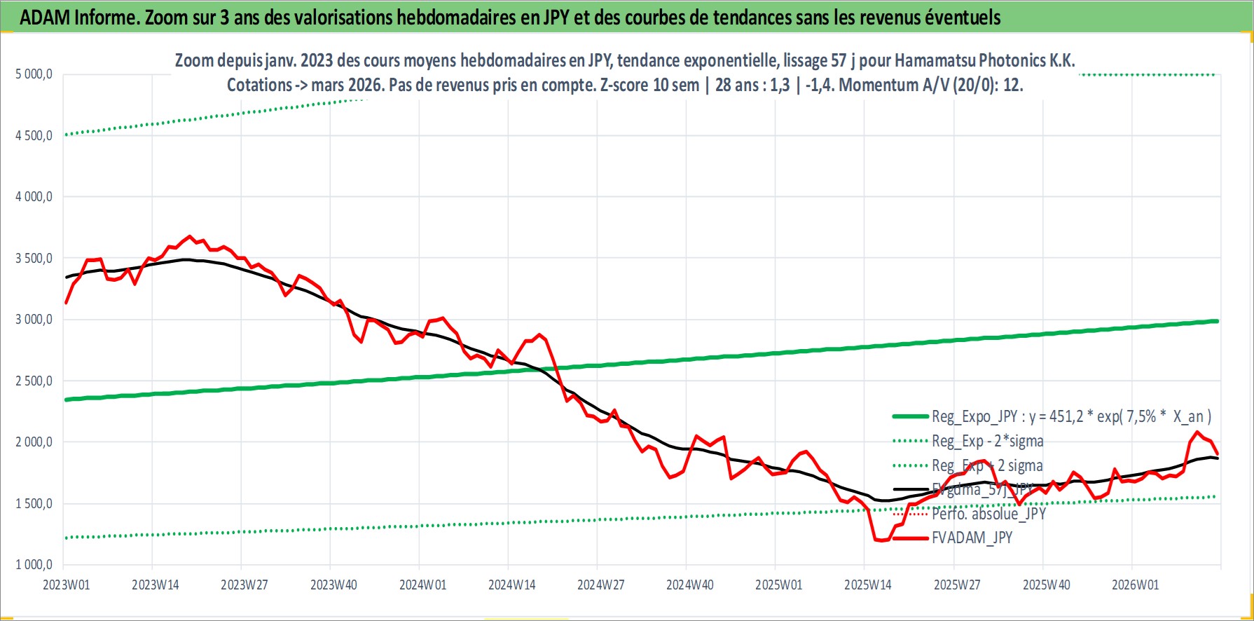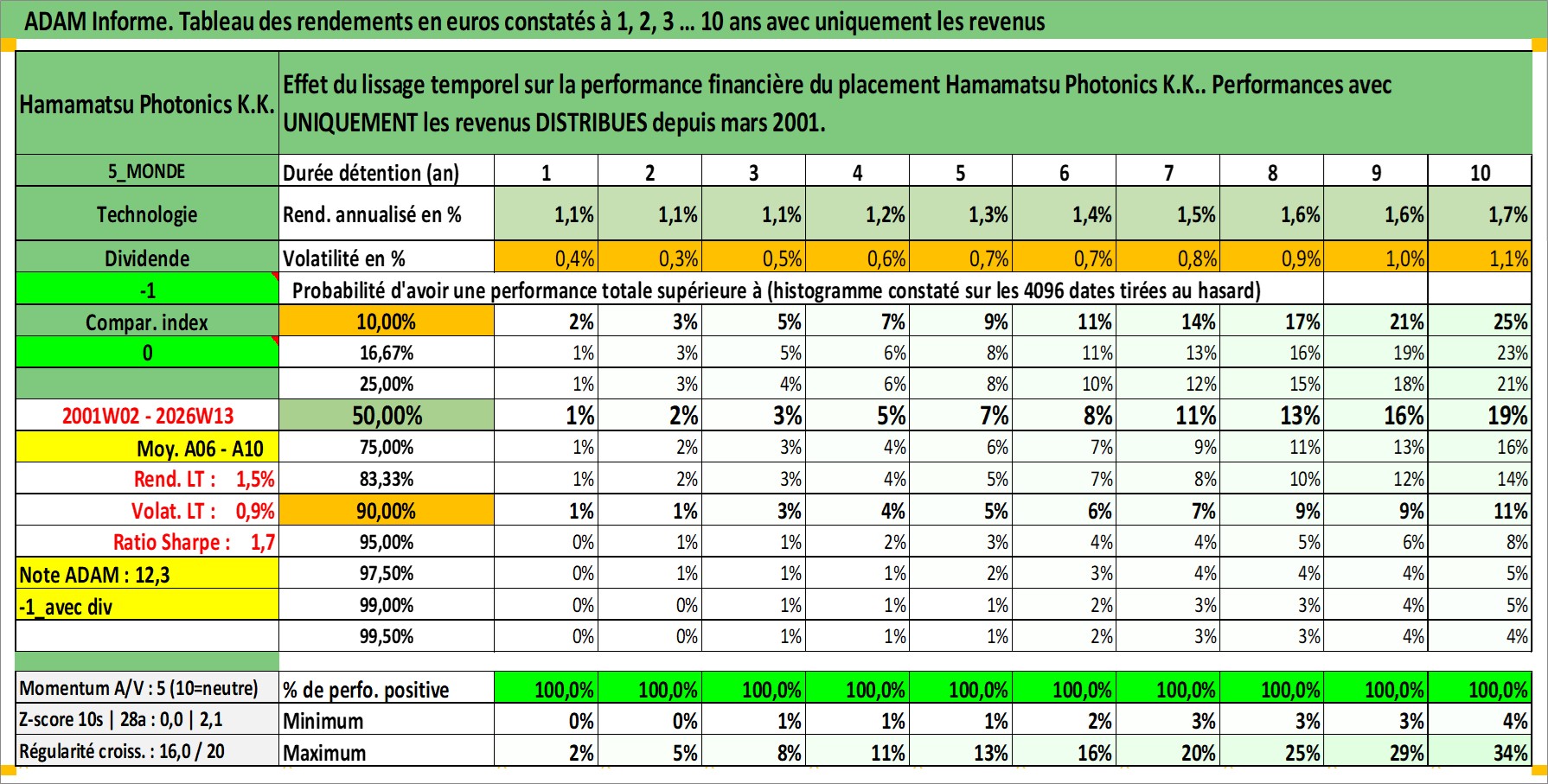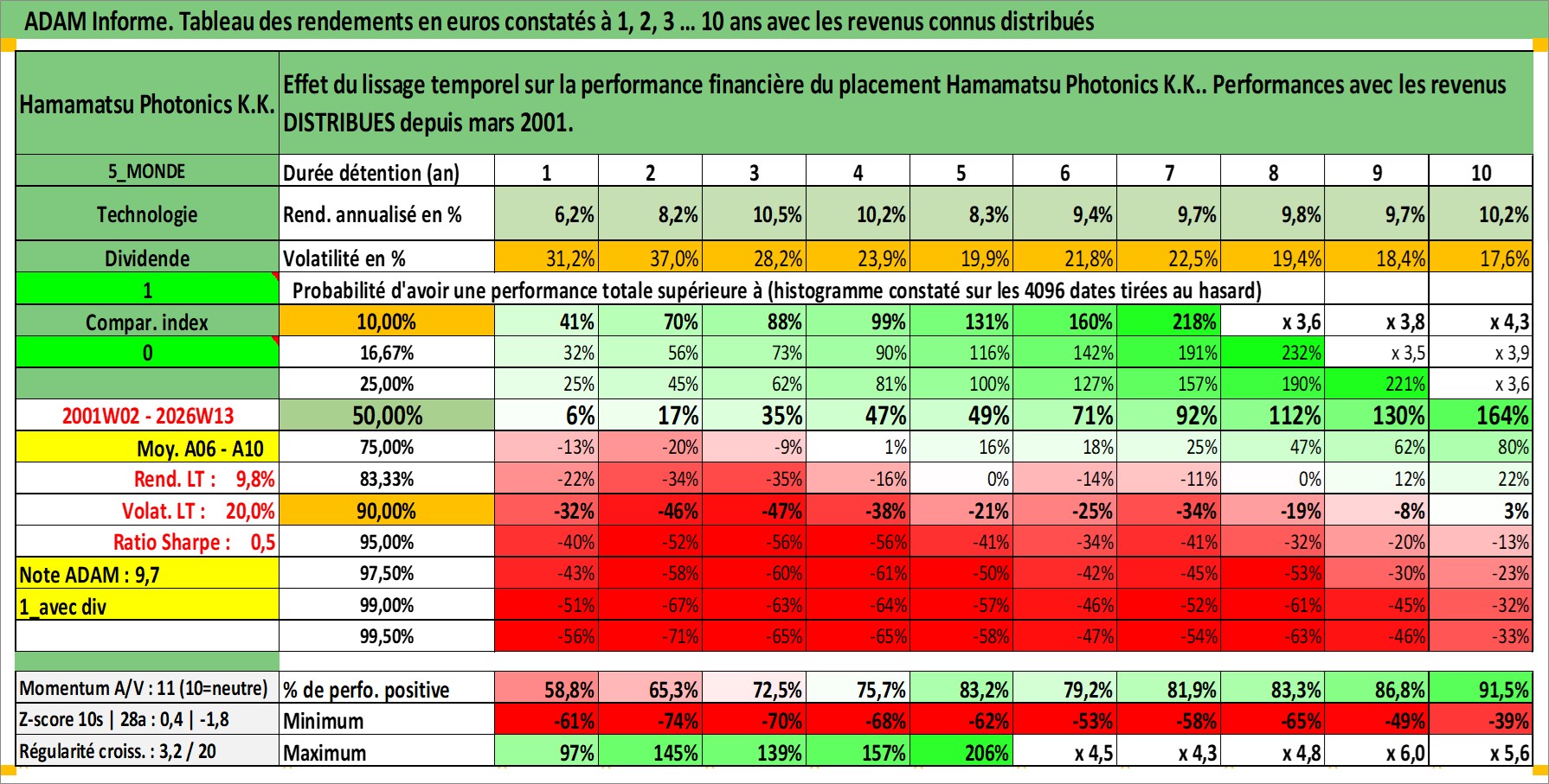 Site dédié aux investisseursPage dédiée sur site financeAnalyse des valorisations hebdomadaires de l'action Hamamatsu Photonics K.K.. Cet actif est cote en JPY. Les valorisations sont en contrevaleur EURO et couvrent les semaines 2001W02 a 2026W13. Les revenus de cet actif financier sont pris en compte depuis la semaine 2001W13. La note ESG de cet actif n'est pas connue.