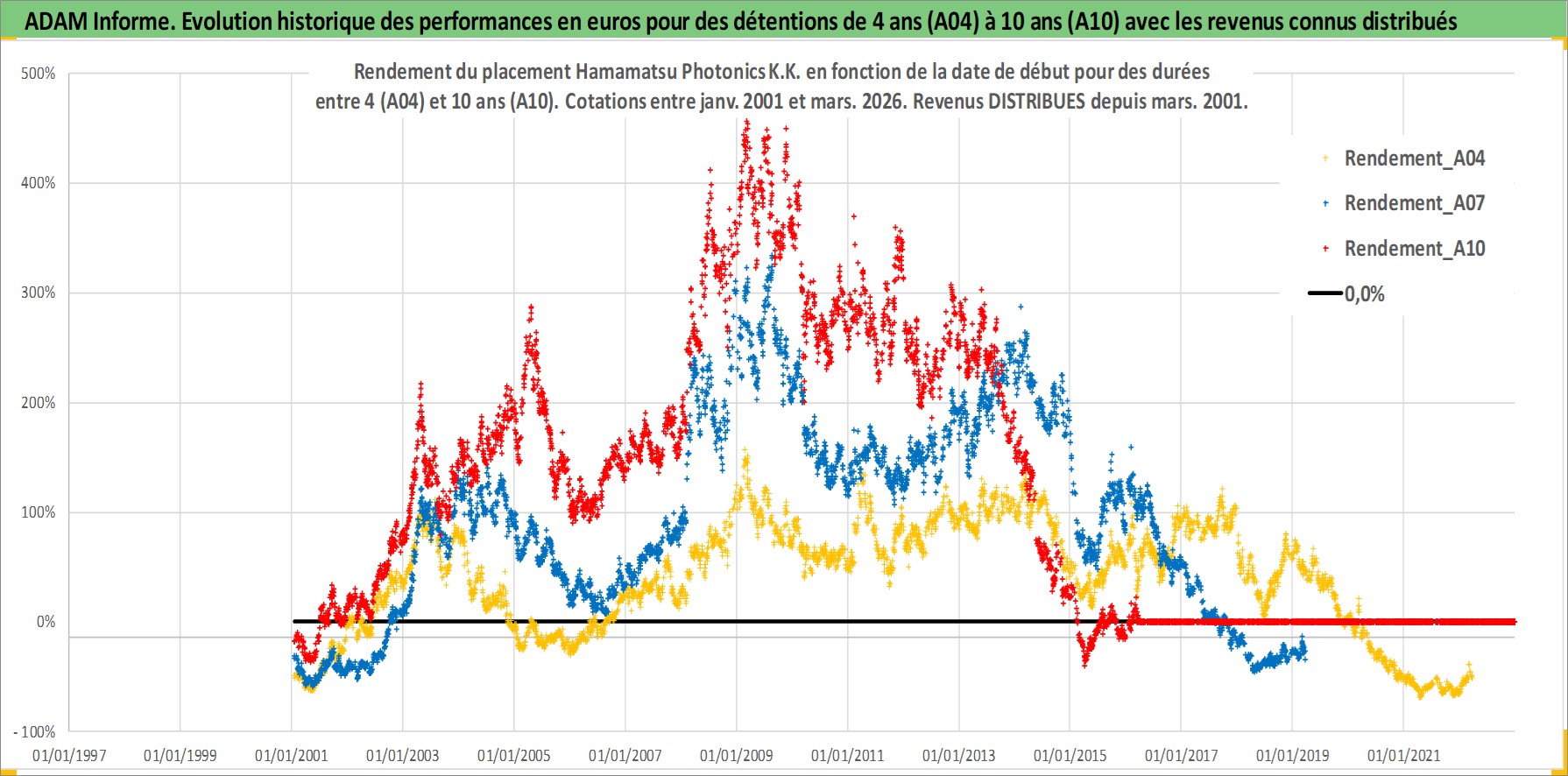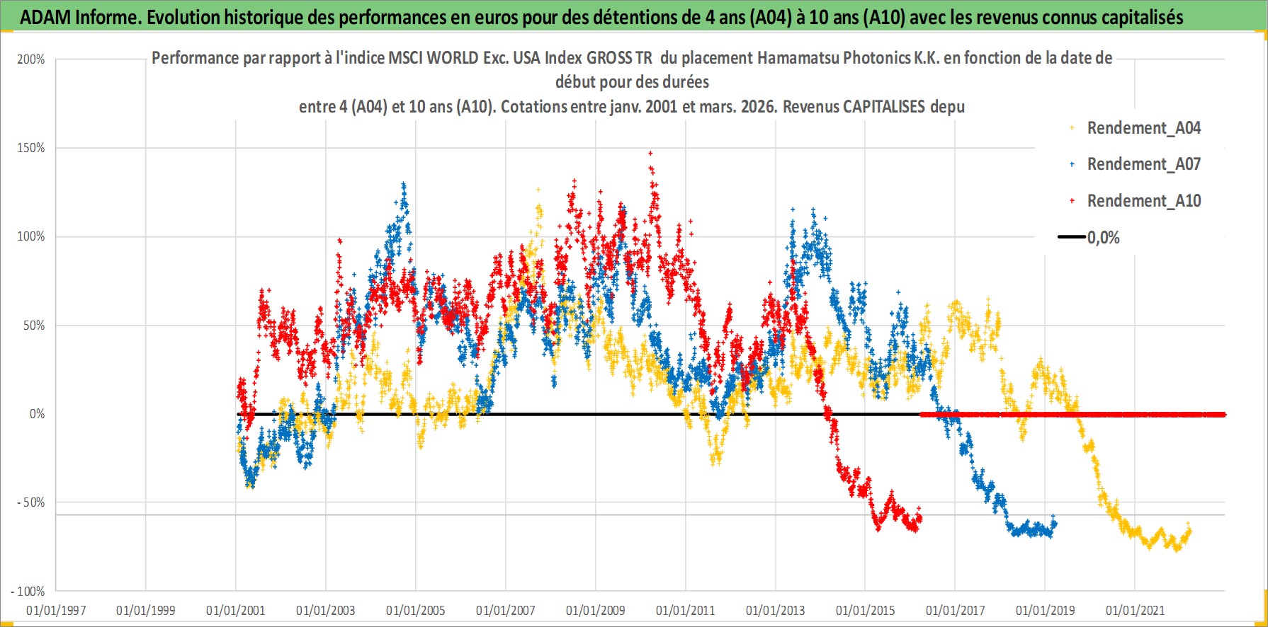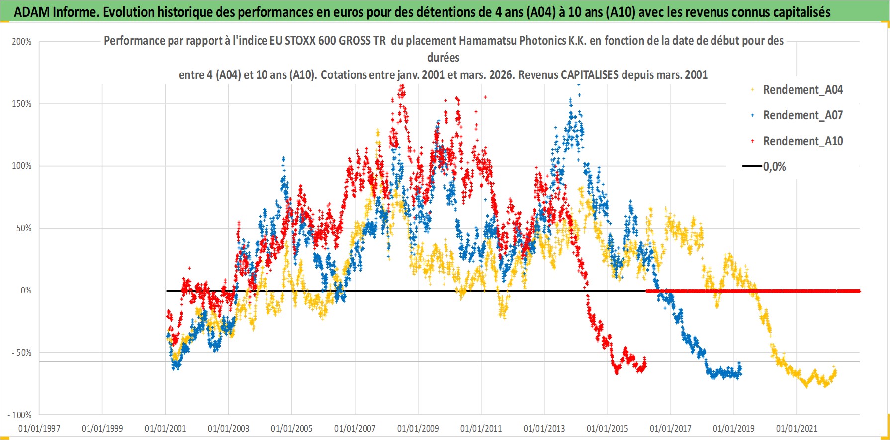 Site dédié aux investisseursPage dédiée sur site financeAnalyse des valorisations hebdomadaires de l'action Hamamatsu Photonics K.K.. Cet actif est cote en JPY. Les valorisations sont en contrevaleur EURO et couvrent les semaines 2001W02 a 2026W13. Les revenus de cet actif financier sont pris en compte depuis la semaine 2001W13. La note ESG de cet actif n'est pas connue.