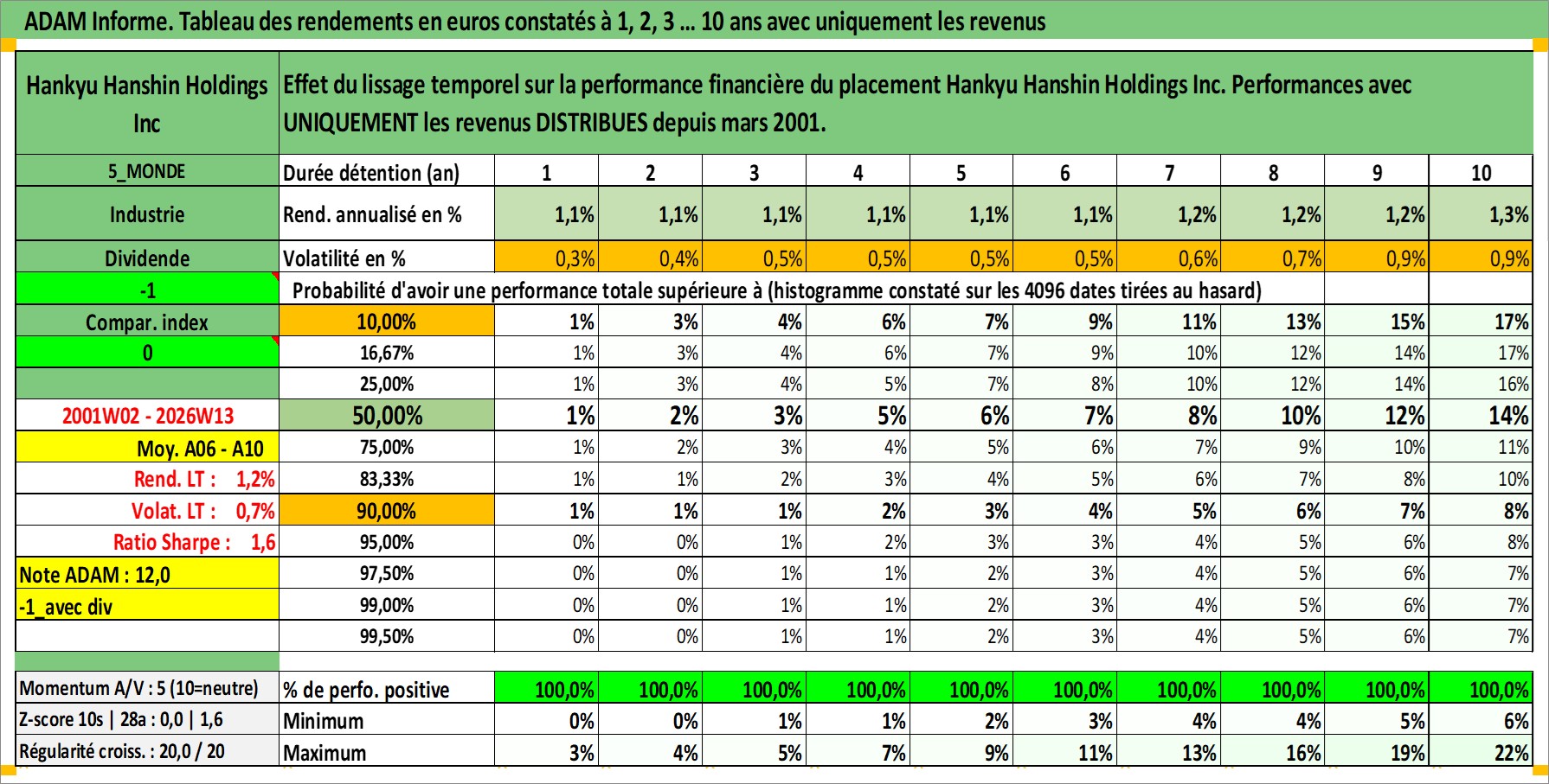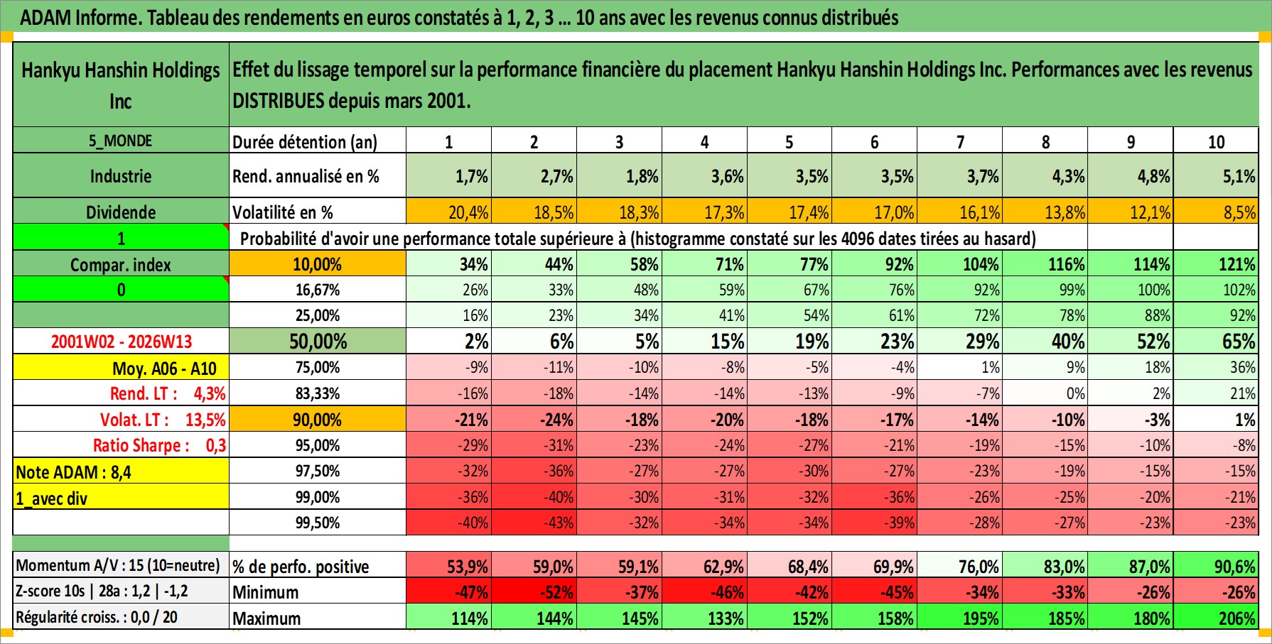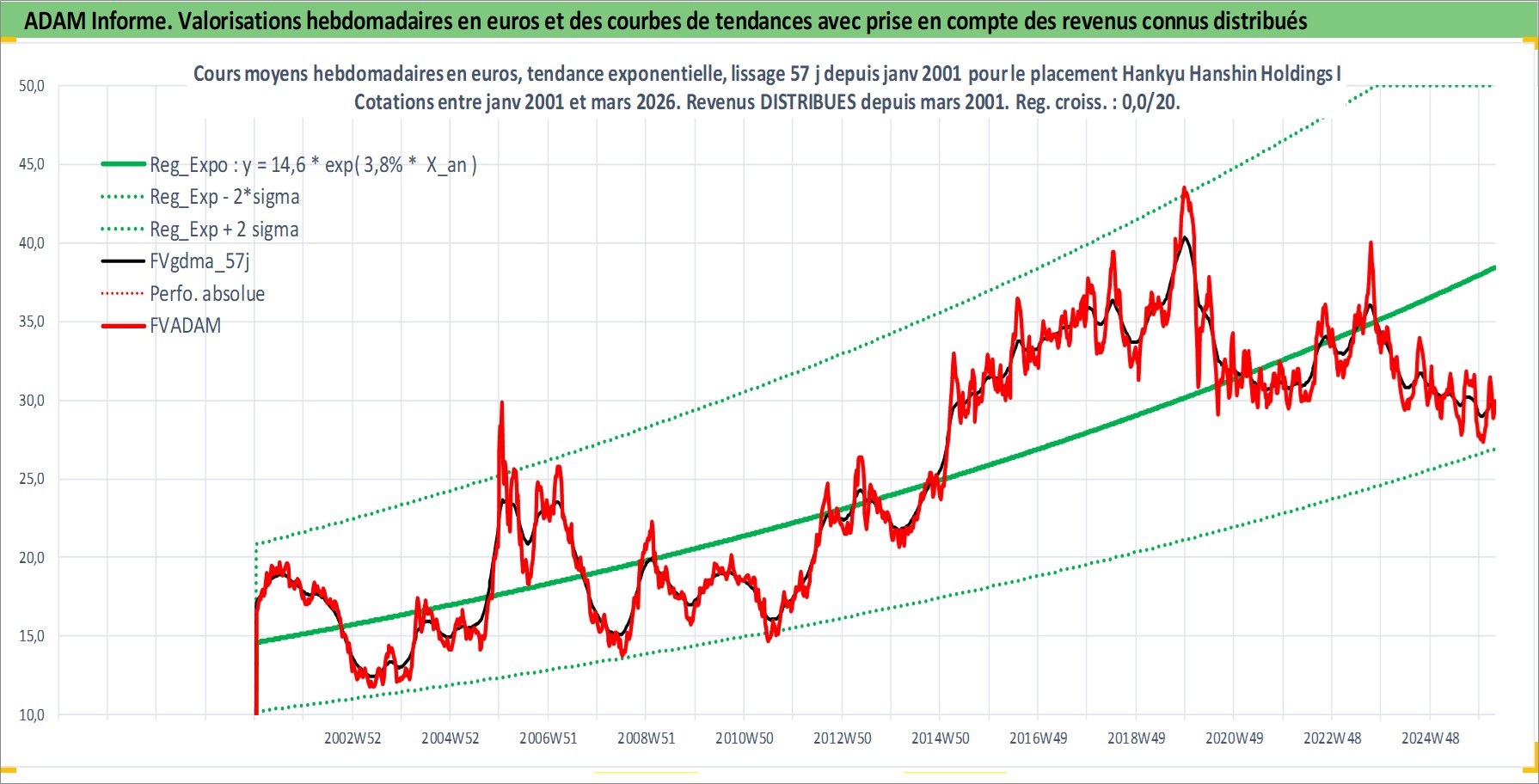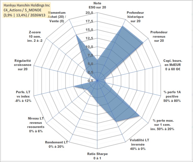 Site dédié aux investisseursPage dédiée sur site financeAnalyse des valorisations hebdomadaires de l'action Hankyu Hanshin Holdings Inc. Cet actif est cote en JPY. Les valorisations sont en contrevaleur EURO et couvrent les semaines 2001W02 a 2026W13. Les revenus de cet actif financier sont pris en compte depuis la semaine 2001W13. La note globale ESG de cet actif est estimee a 6.0 (apres rebasage entre 0 et 20).