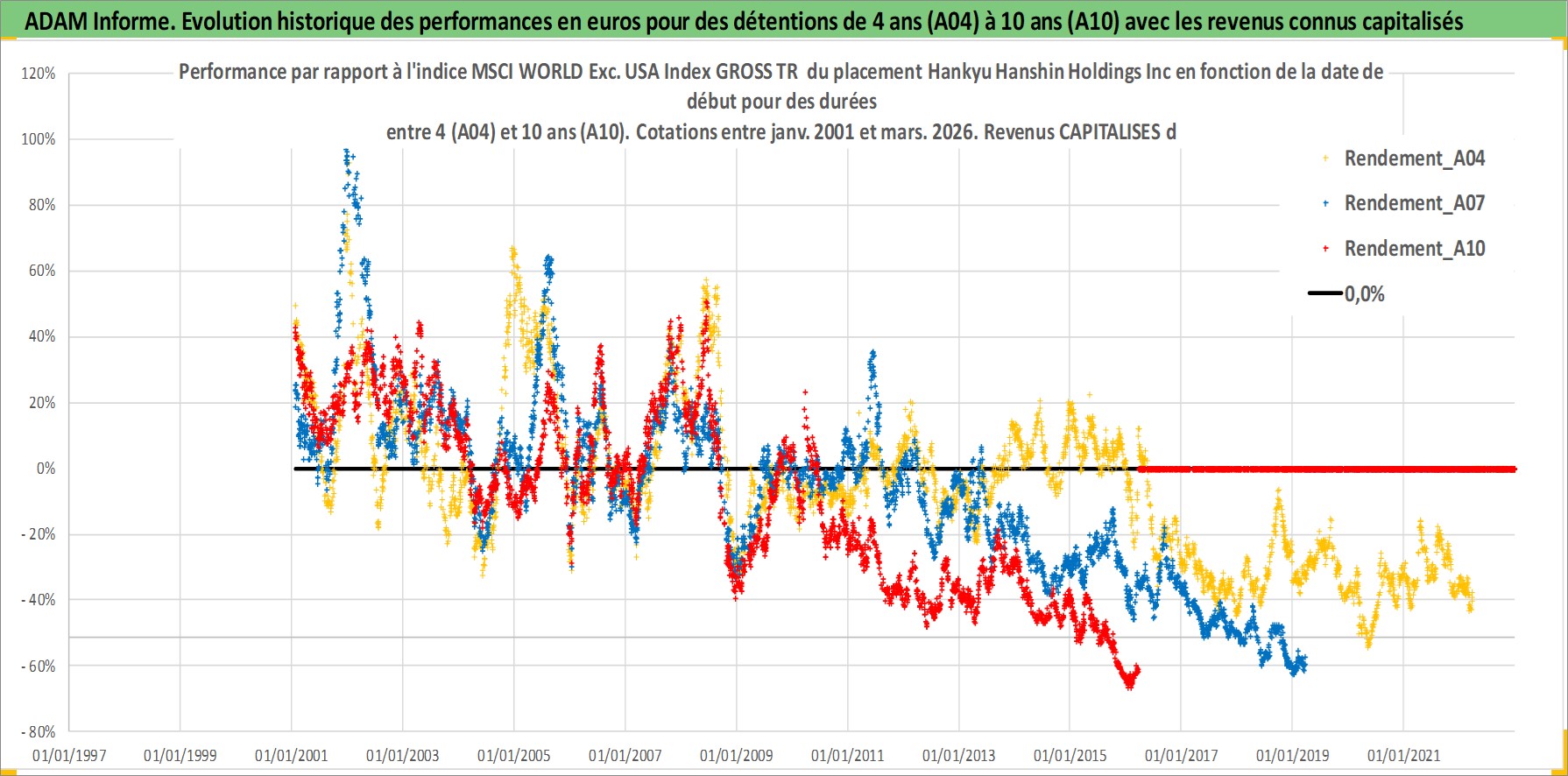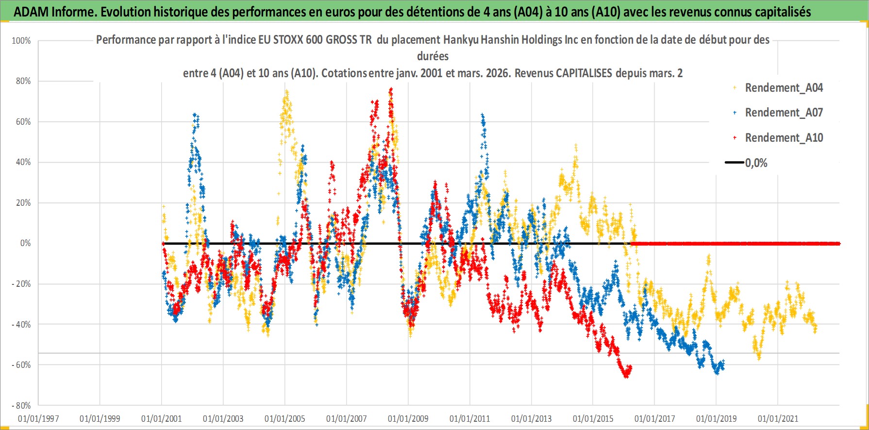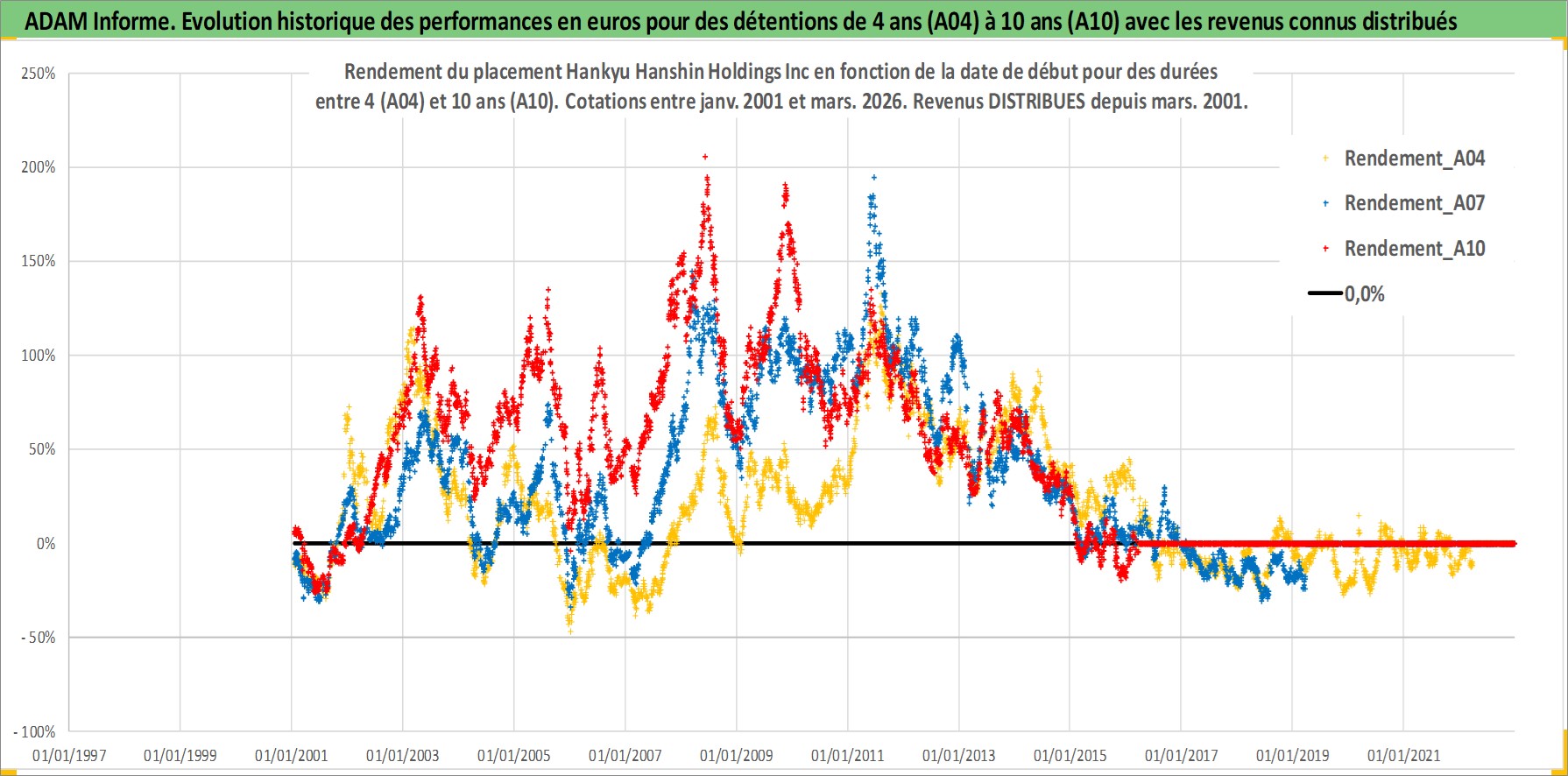 Site dédié aux investisseursPage dédiée sur site financeAnalyse des valorisations hebdomadaires de l'action Hankyu Hanshin Holdings Inc. Cet actif est cote en JPY. Les valorisations sont en contrevaleur EURO et couvrent les semaines 2001W02 a 2026W13. Les revenus de cet actif financier sont pris en compte depuis la semaine 2001W13. La note globale ESG de cet actif est estimee a 6.0 (apres rebasage entre 0 et 20).