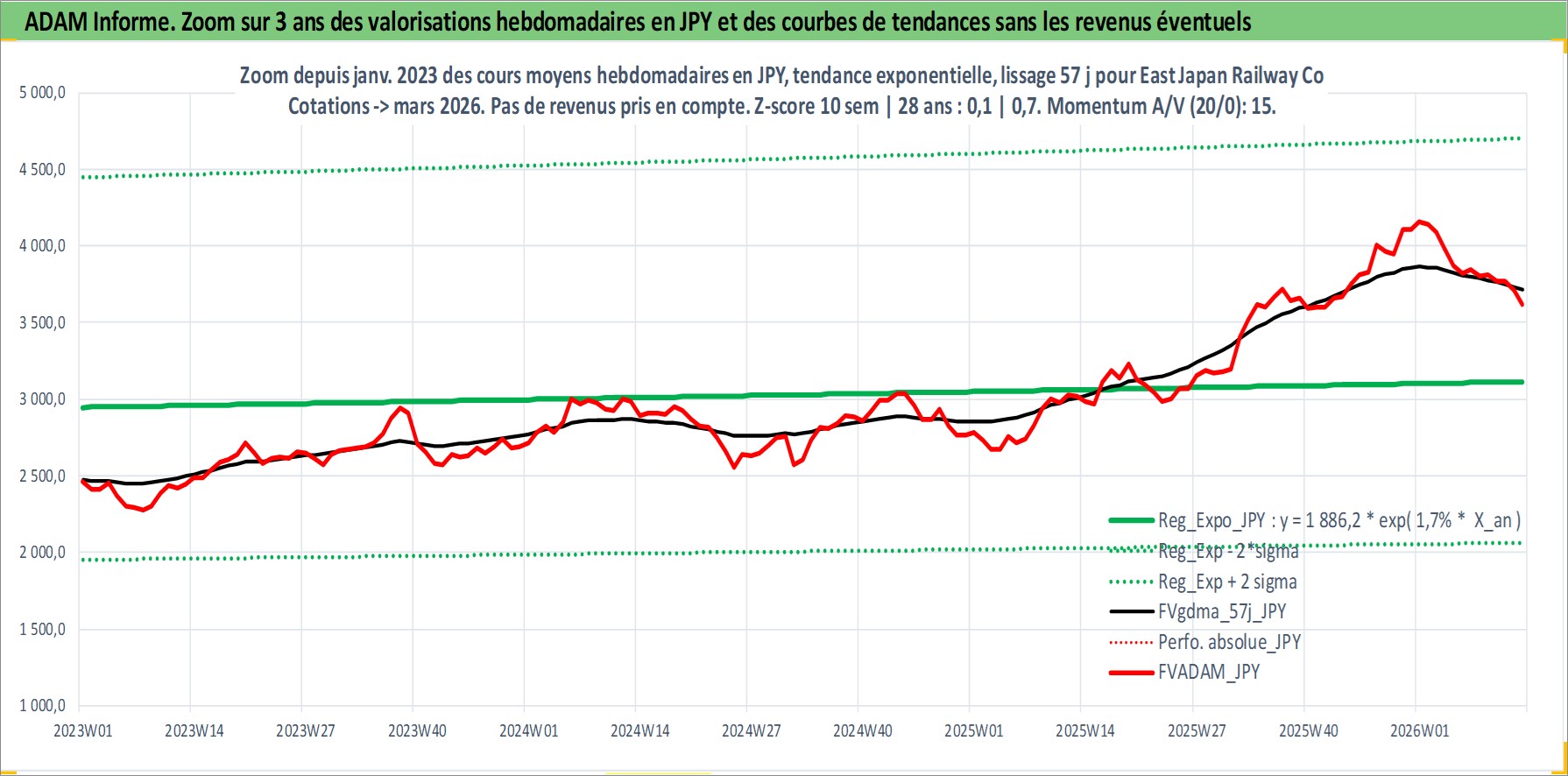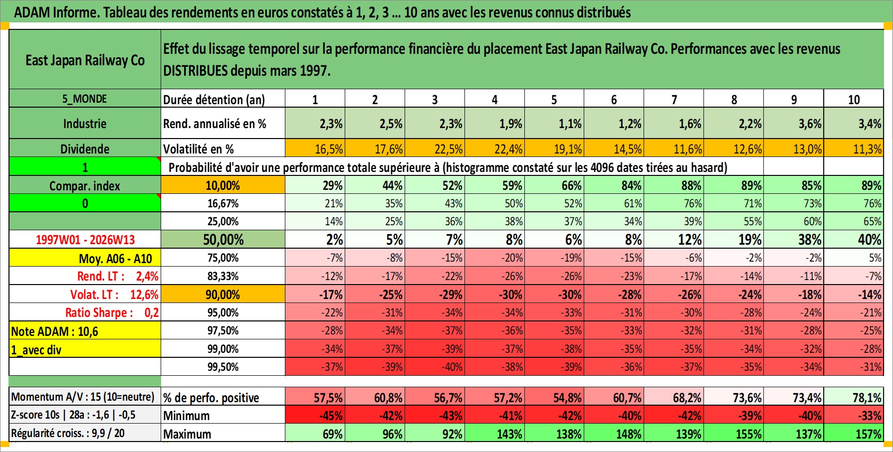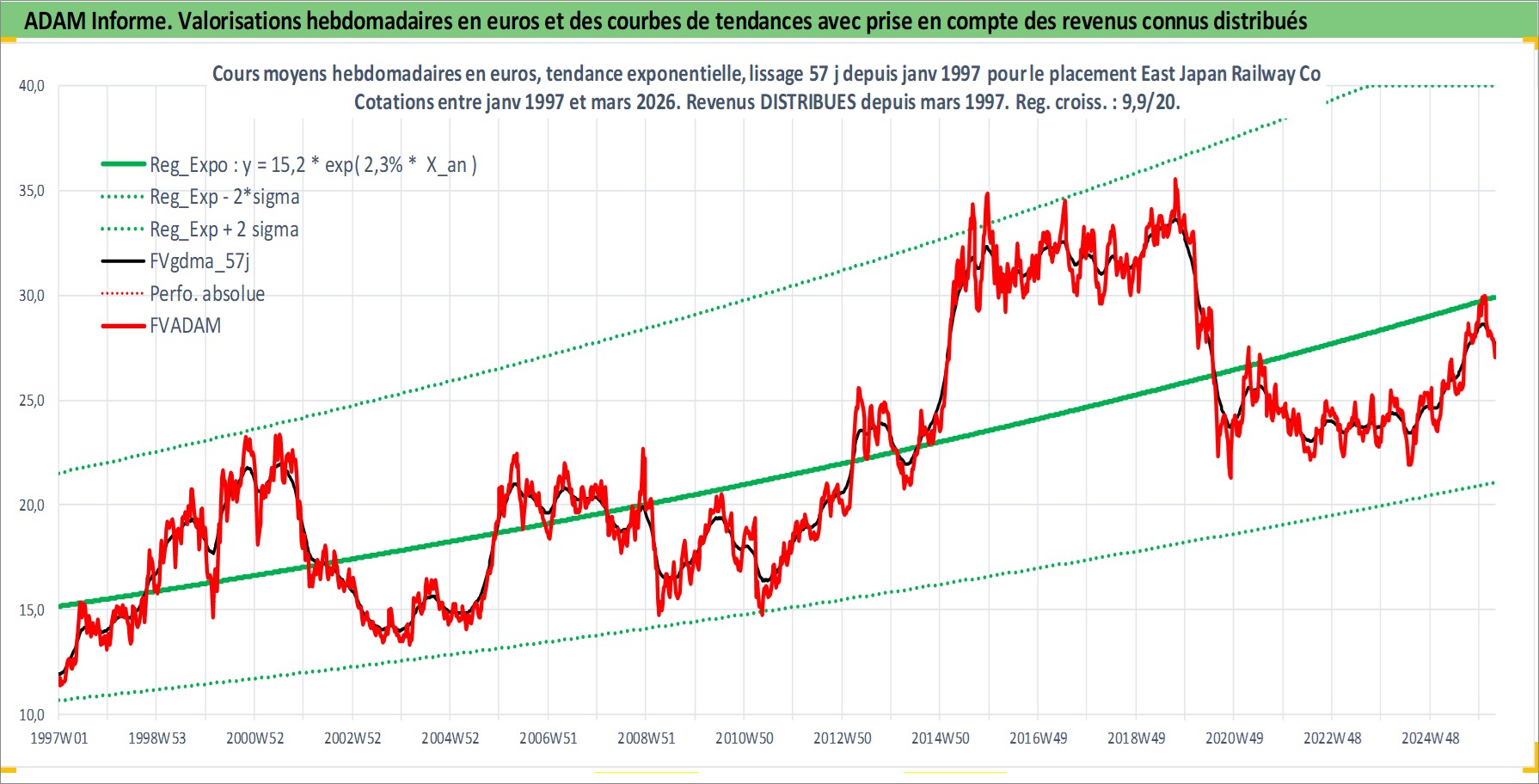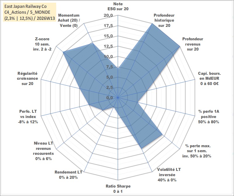 Site dédié aux investisseursPage dédiée sur site financeAnalyse des valorisations hebdomadaires de l'action East Japan Railway Co. Cet actif est cote en JPY. Les valorisations sont en contrevaleur EURO et couvrent les semaines 1997W01 a 2026W13. Les revenus de cet actif financier sont pris en compte depuis la semaine 1997W13. La note globale ESG de cet actif est estimee a 7.0 (apres rebasage entre 0 et 20).