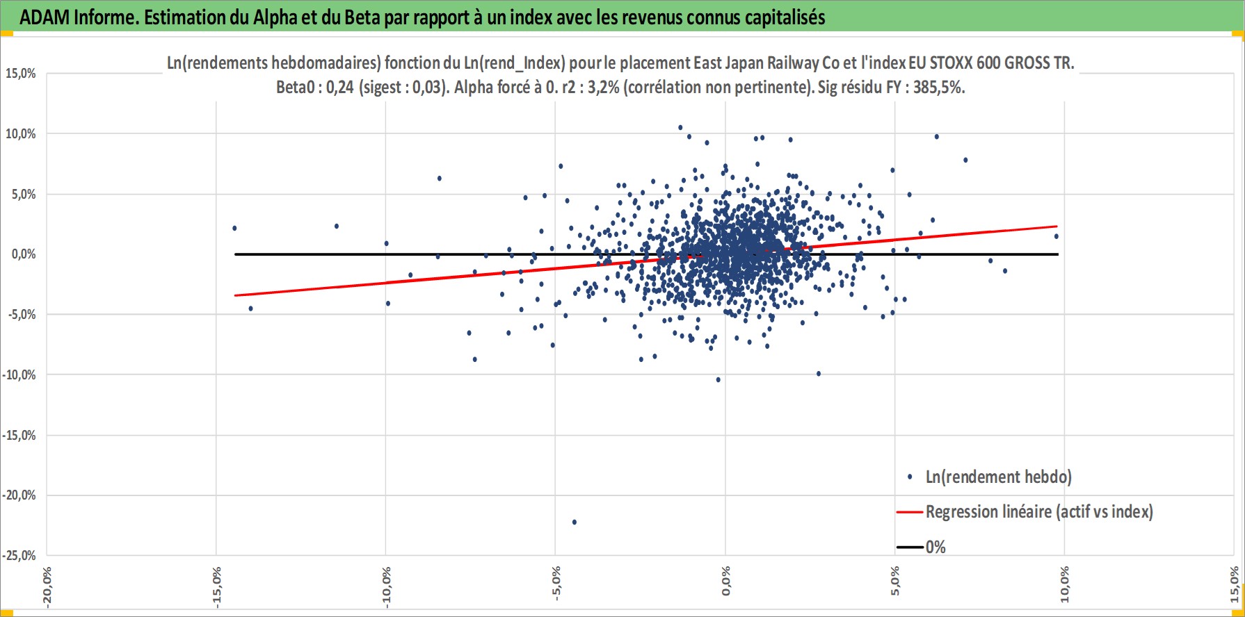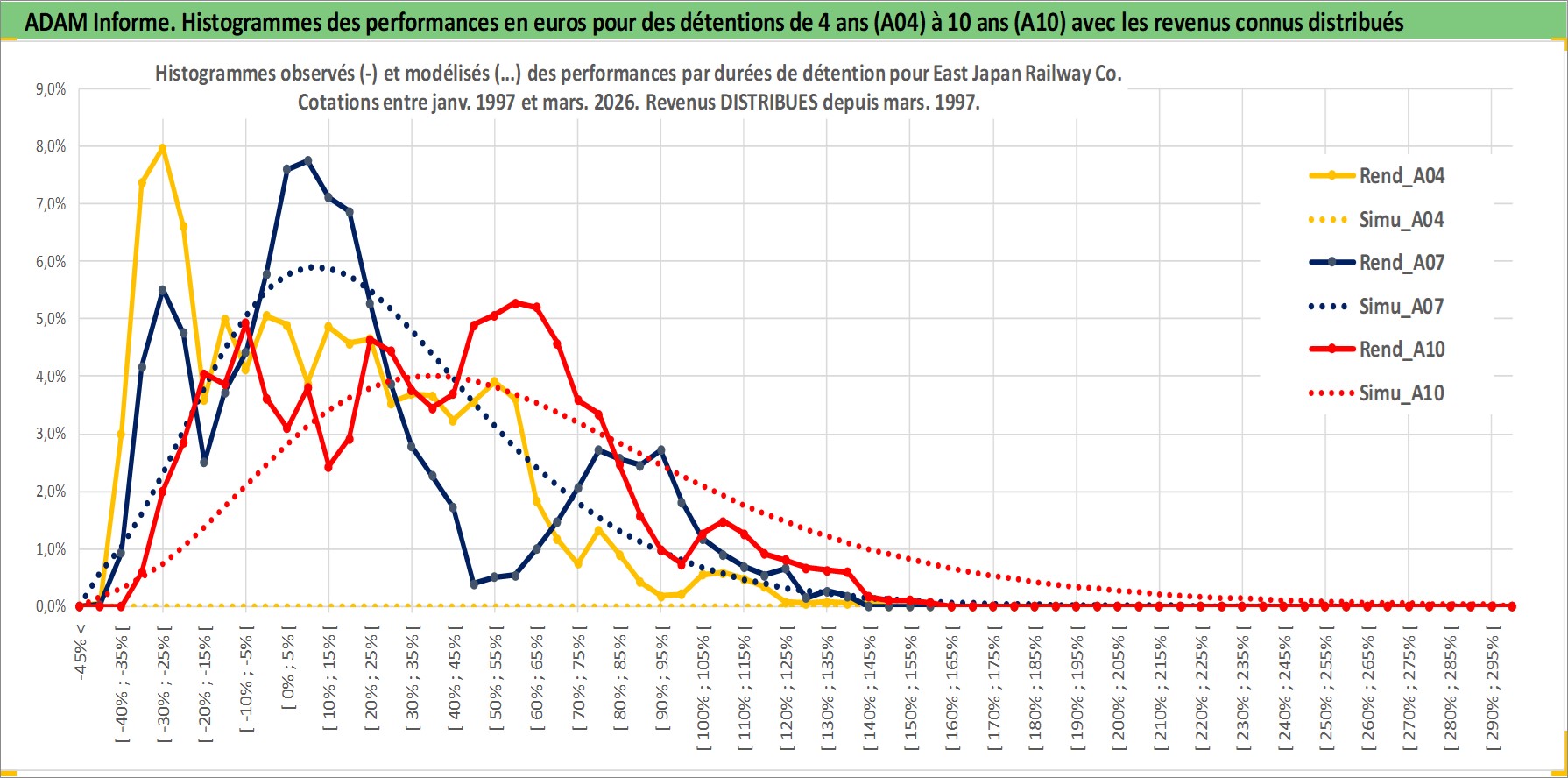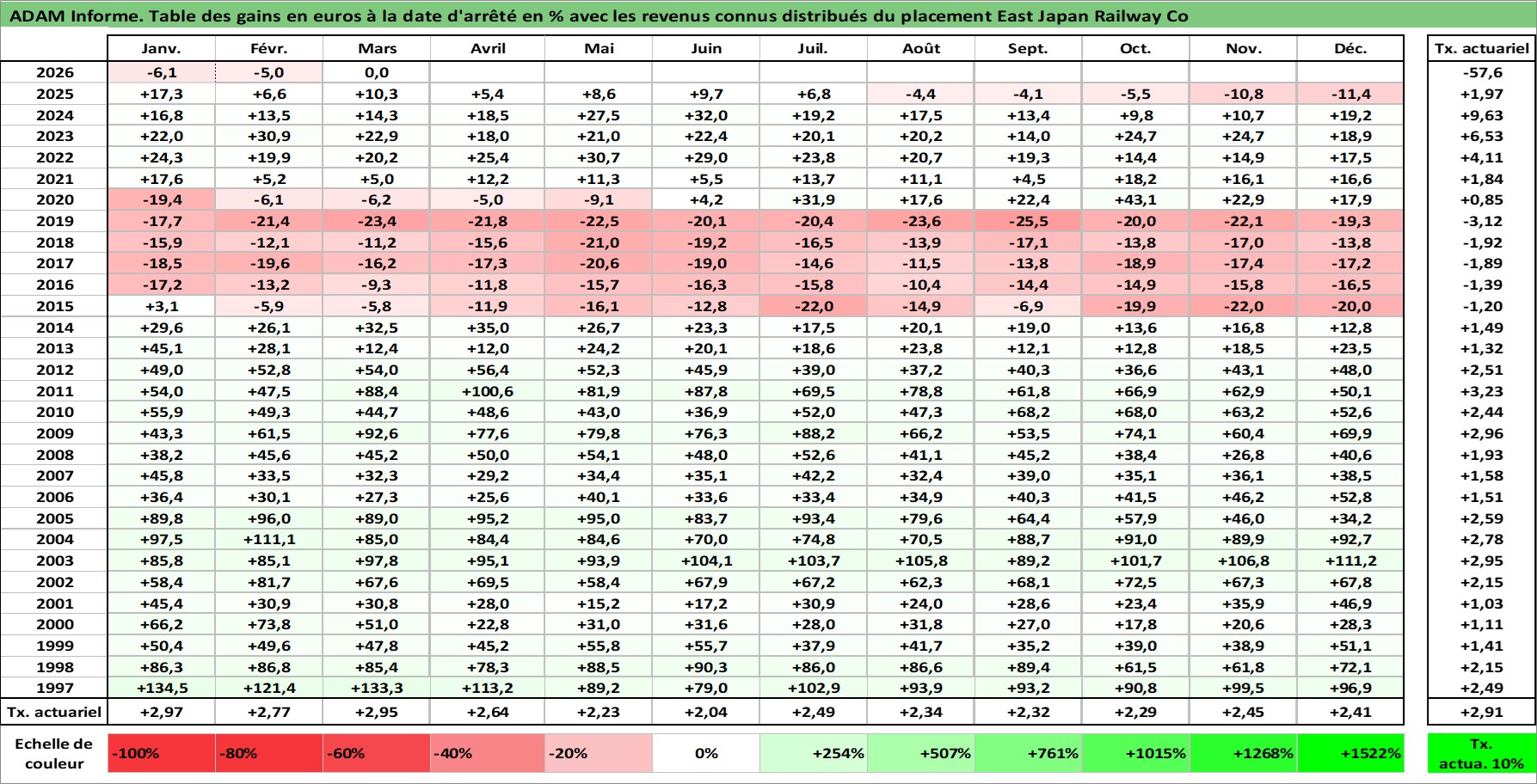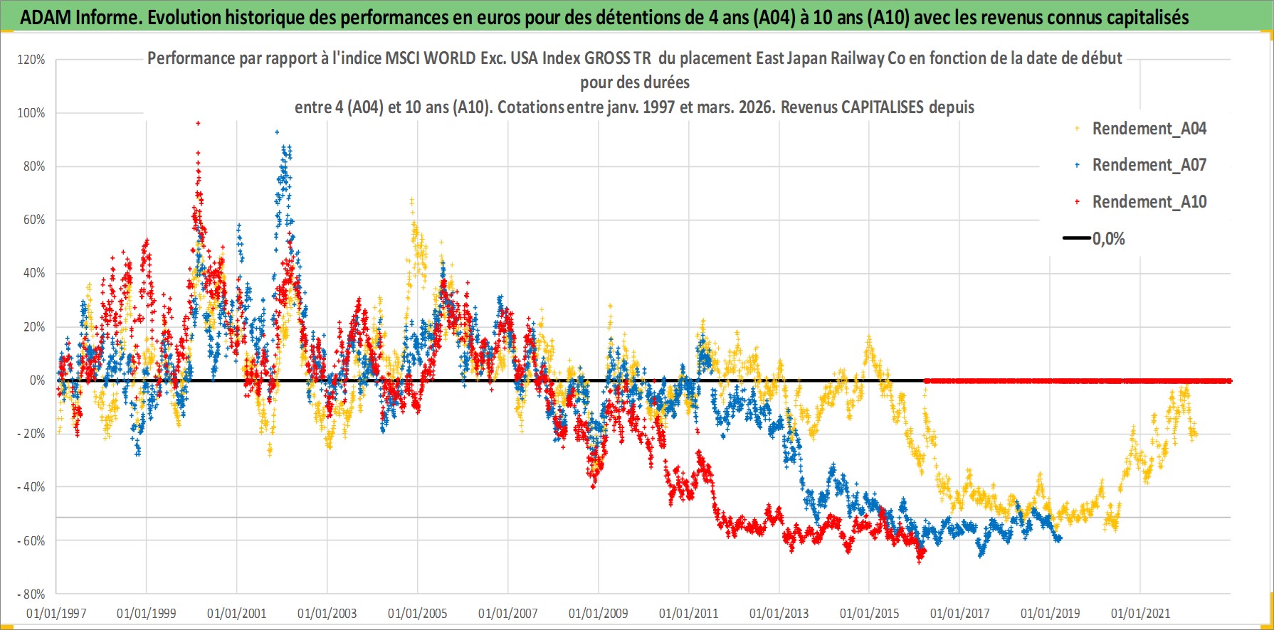 Site dédié aux investisseursPage dédiée sur site financeAnalyse des valorisations hebdomadaires de l'action East Japan Railway Co. Cet actif est cote en JPY. Les valorisations sont en contrevaleur EURO et couvrent les semaines 1997W01 a 2026W13. Les revenus de cet actif financier sont pris en compte depuis la semaine 1997W13. La note globale ESG de cet actif est estimee a 7.0 (apres rebasage entre 0 et 20).