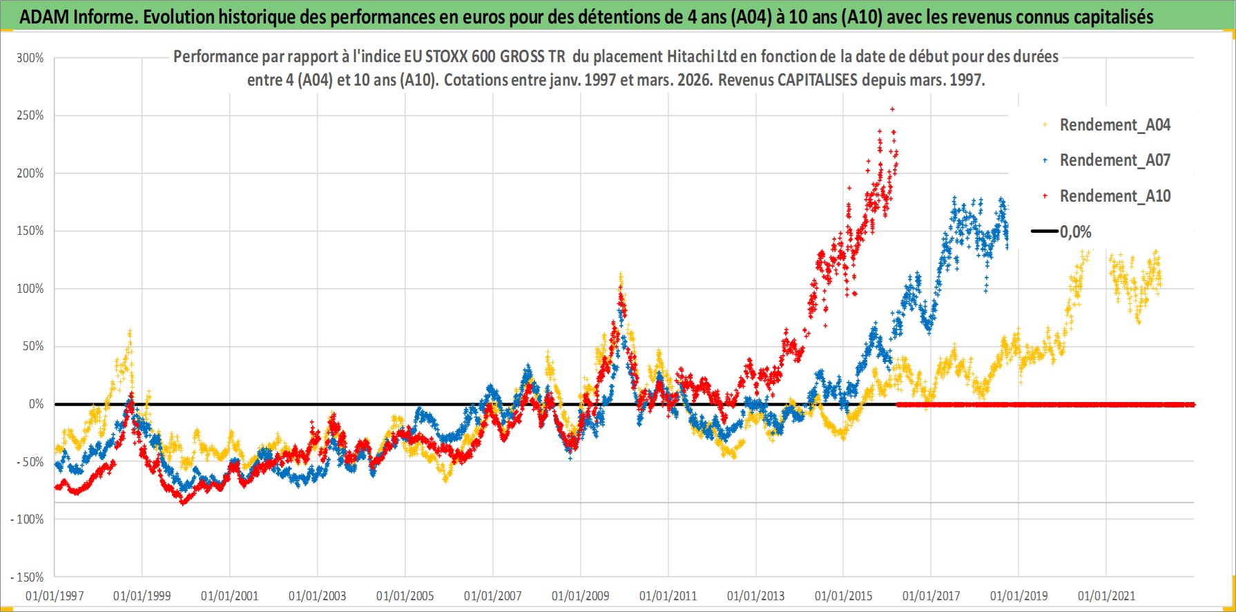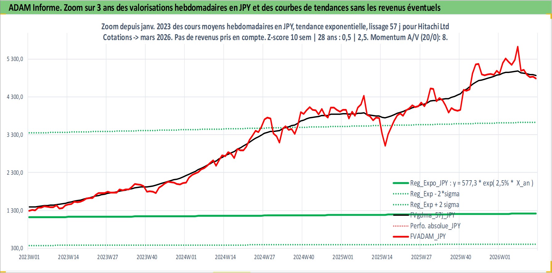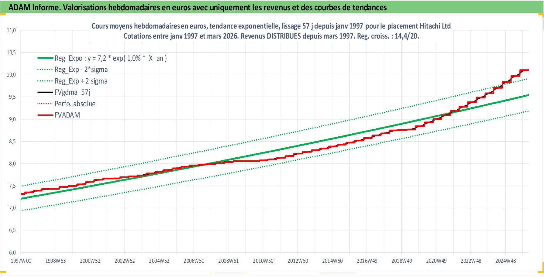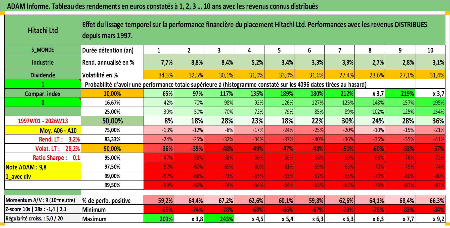 Site dédié aux investisseursPage dédiée sur site financeAnalyse des valorisations hebdomadaires de l'action Hitachi Ltd. Cet actif est cote en JPY. Les valorisations sont en contrevaleur EURO et couvrent les semaines 1997W01 a 2026W13. Les revenus de cet actif financier sont pris en compte depuis la semaine 1997W13. La note globale ESG de cet actif est estimee a 4.0 (apres rebasage entre 0 et 20).