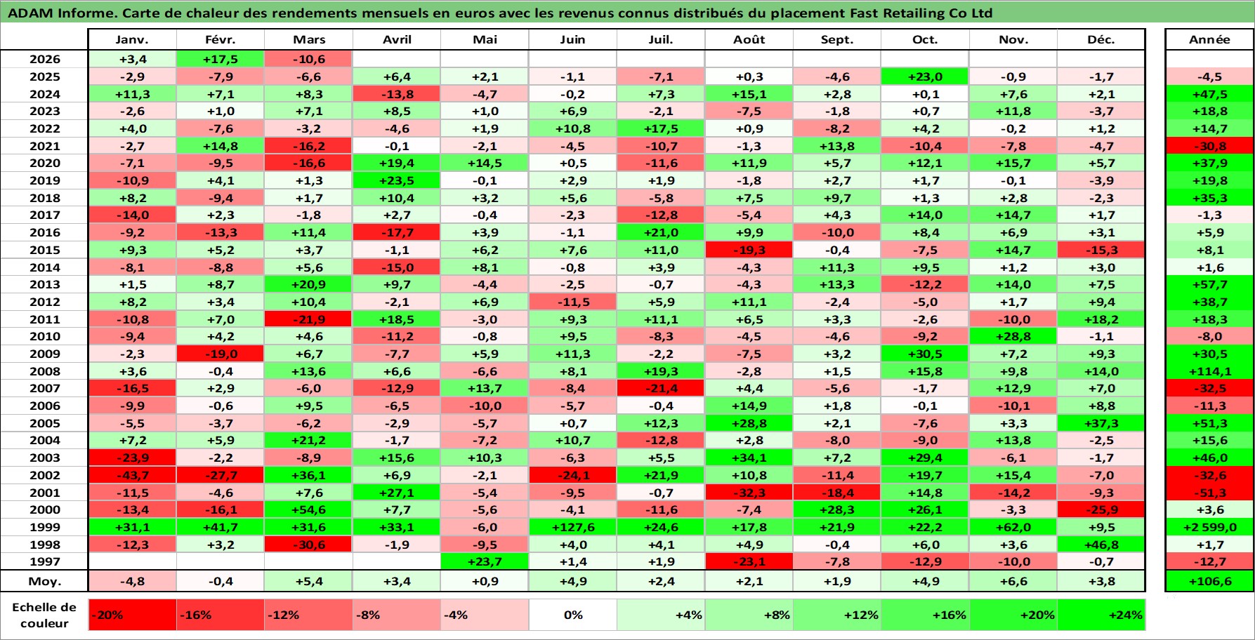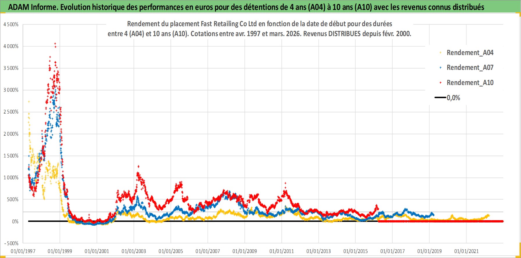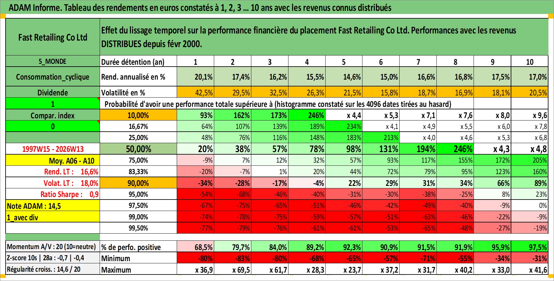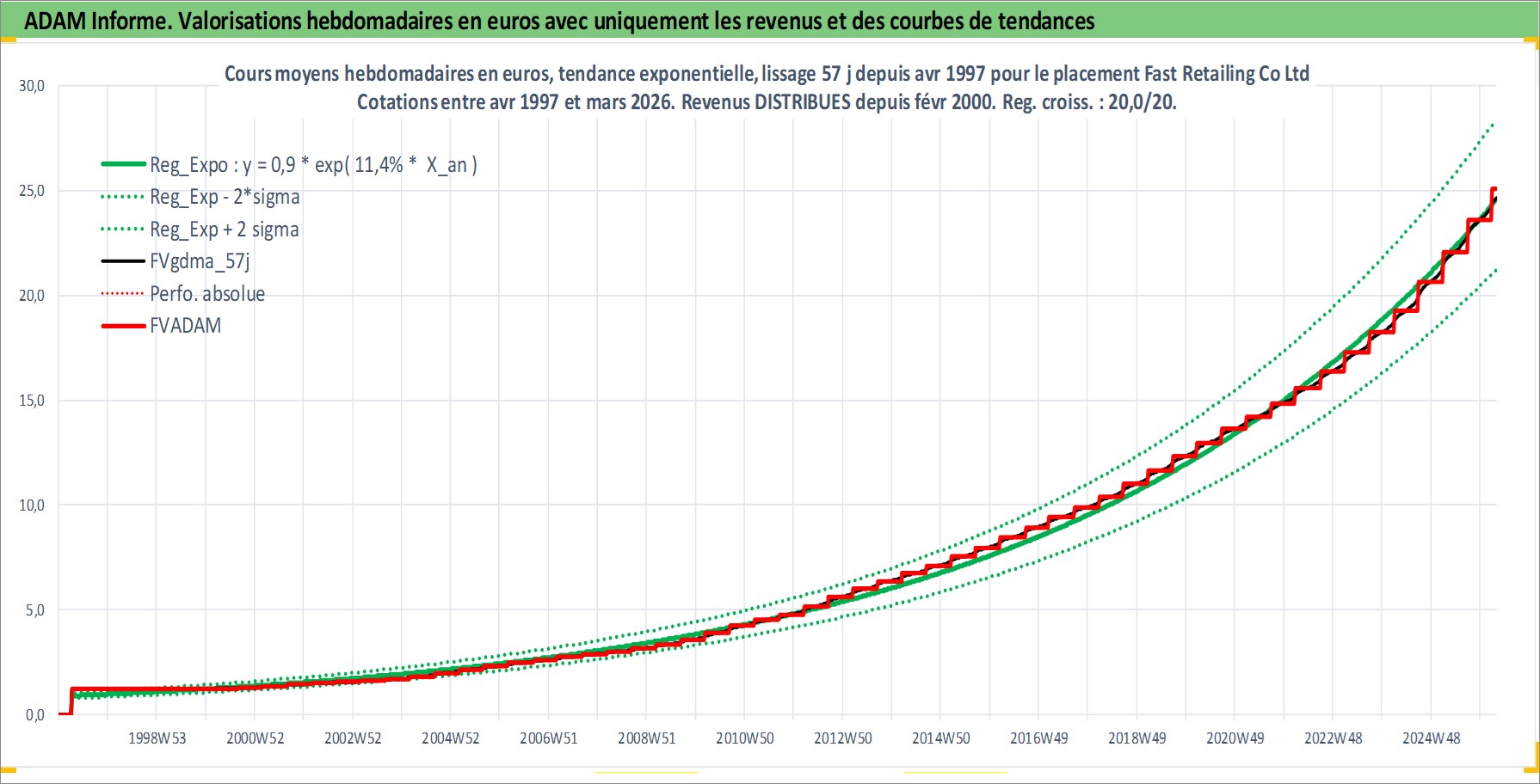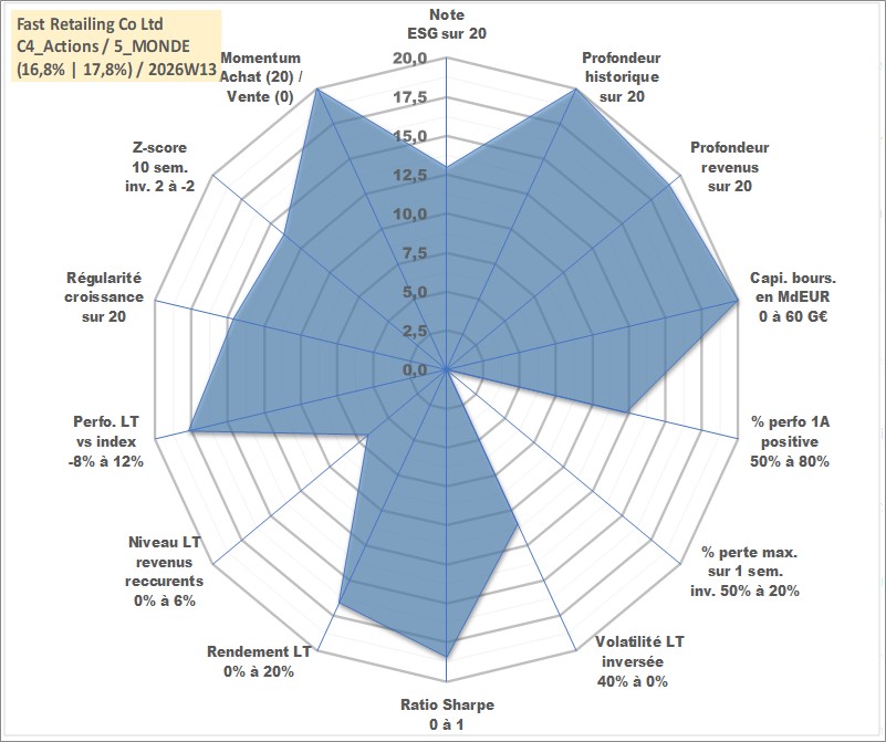 Site dédié aux investisseursPage dédiée sur site financeAnalyse des valorisations hebdomadaires de l'action Fast Retailing Co Ltd. Cet actif est cote en JPY. Les valorisations sont en contrevaleur EURO et couvrent les semaines 1997W15 a 2026W13. Les revenus de cet actif financier sont pris en compte depuis la semaine 2000W08. La note globale ESG de cet actif est estimee a 13.0 (apres rebasage entre 0 et 20).