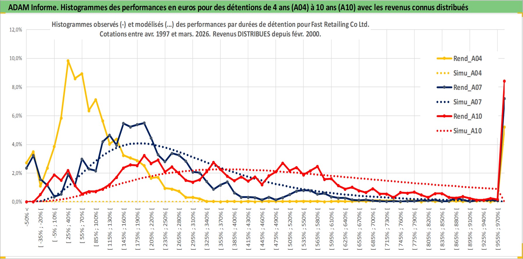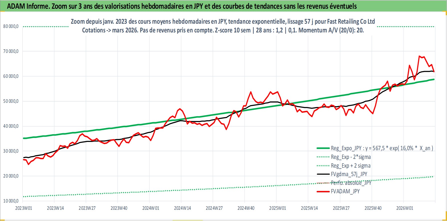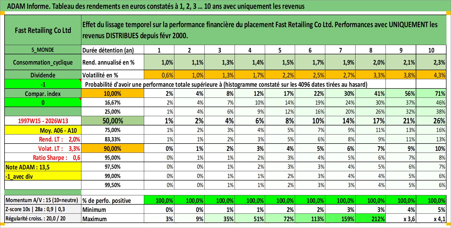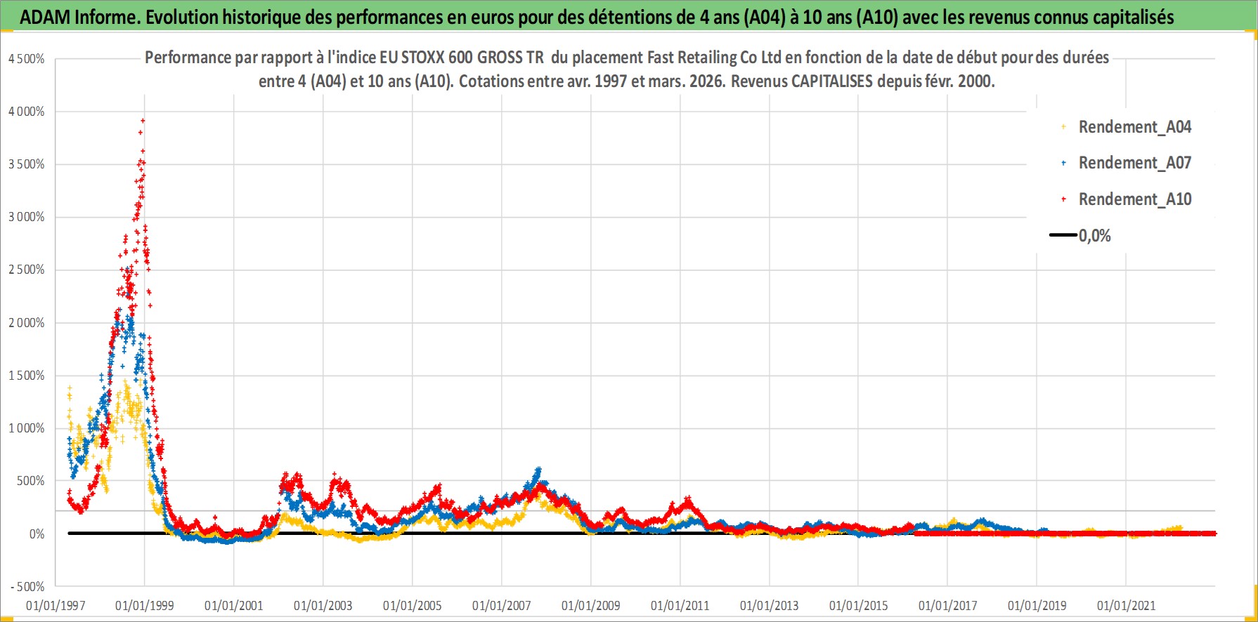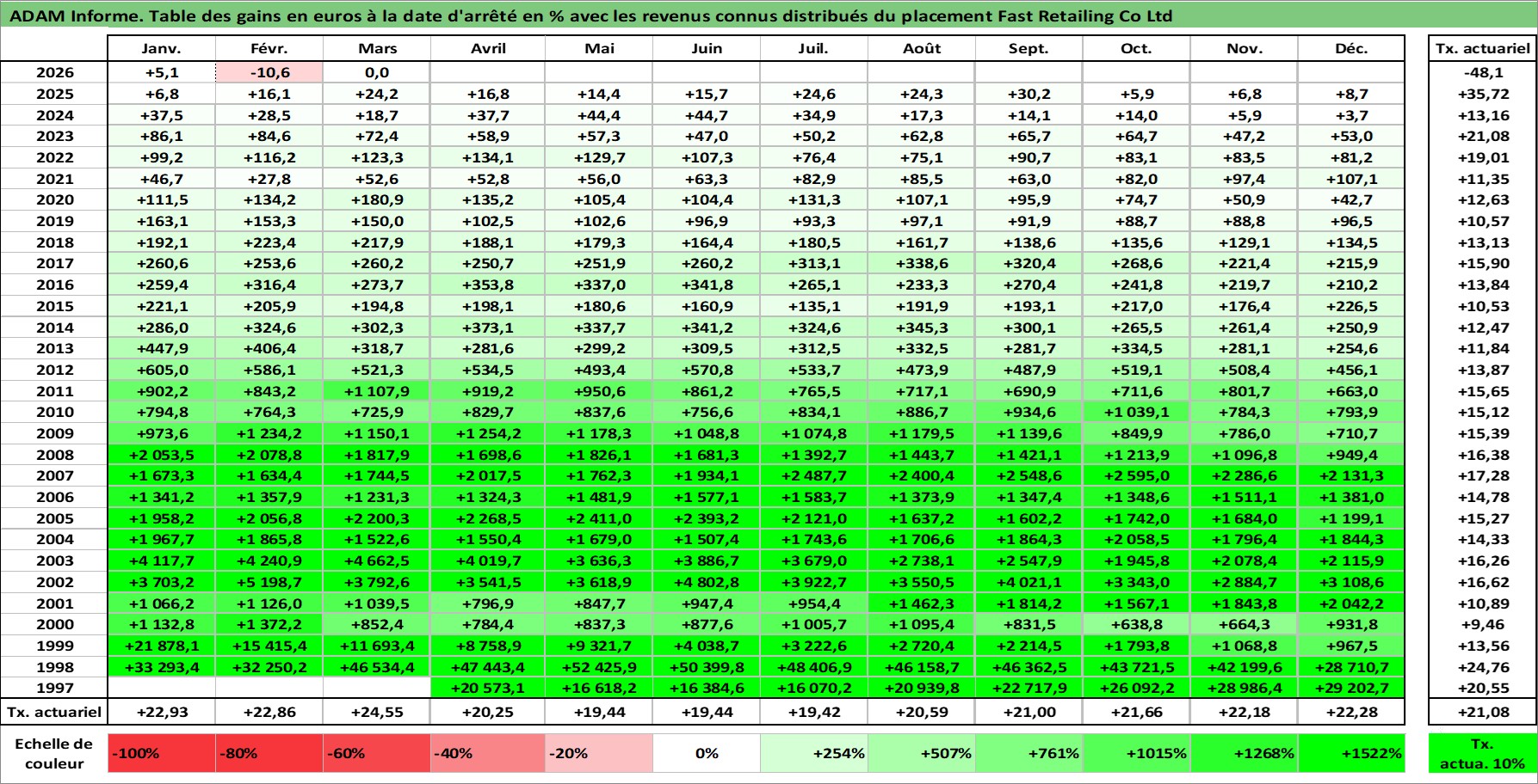 Site dédié aux investisseursPage dédiée sur site financeAnalyse des valorisations hebdomadaires de l'action Fast Retailing Co Ltd. Cet actif est cote en JPY. Les valorisations sont en contrevaleur EURO et couvrent les semaines 1997W15 a 2026W13. Les revenus de cet actif financier sont pris en compte depuis la semaine 2000W08. La note globale ESG de cet actif est estimee a 13.0 (apres rebasage entre 0 et 20).