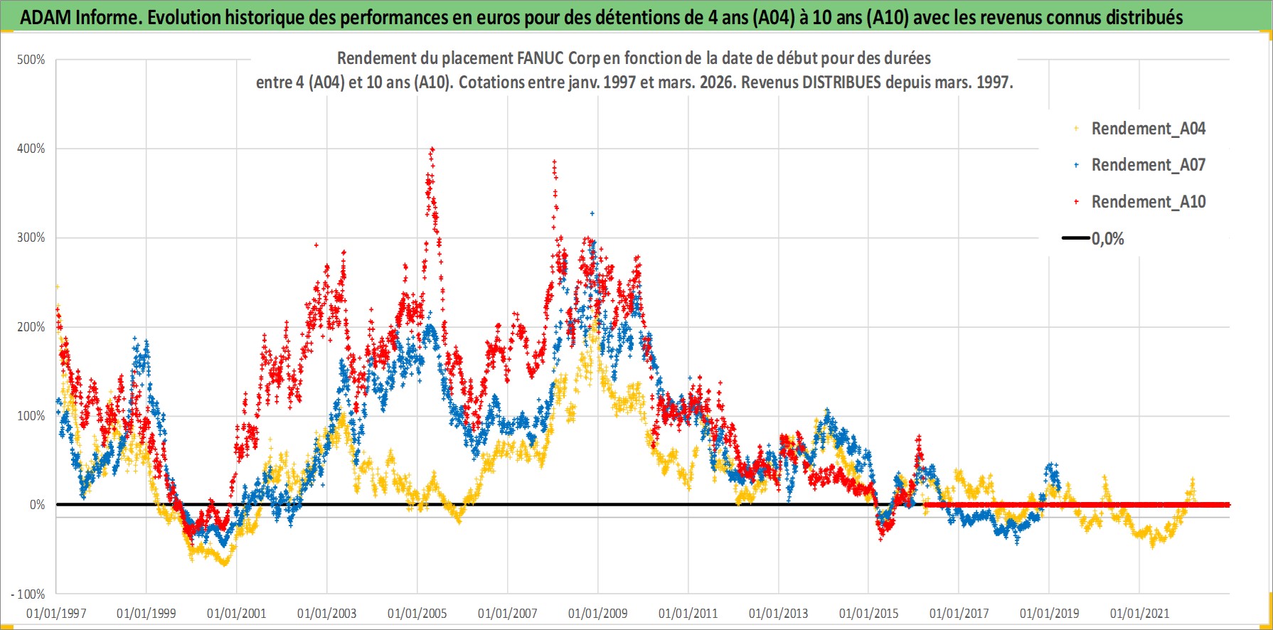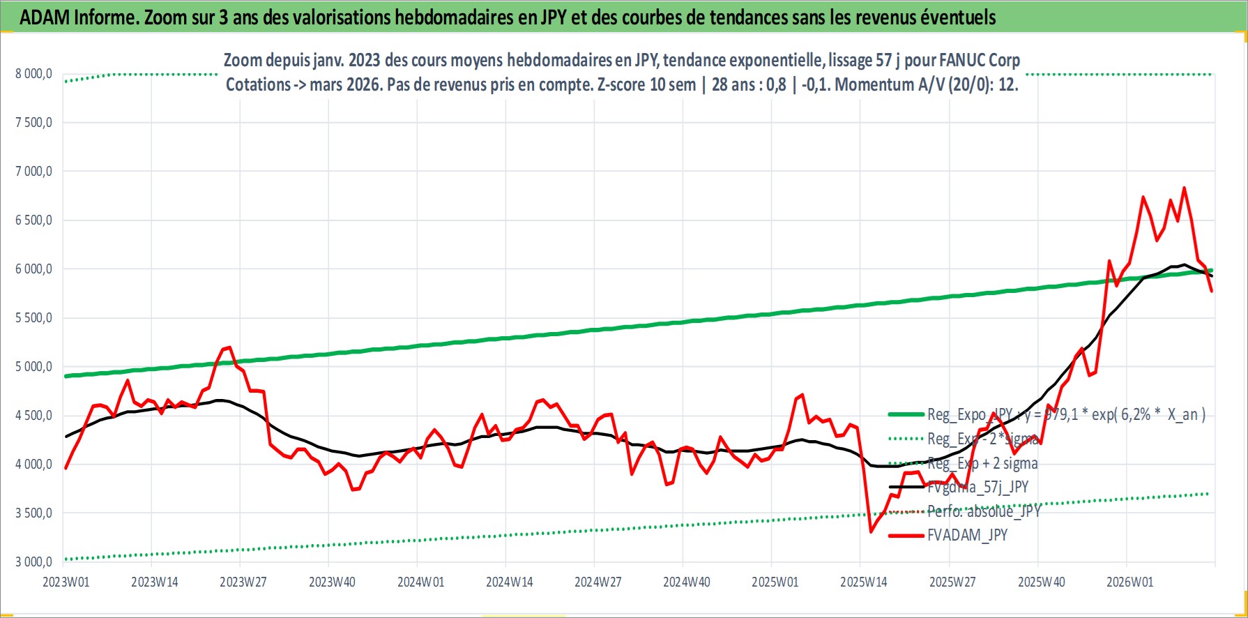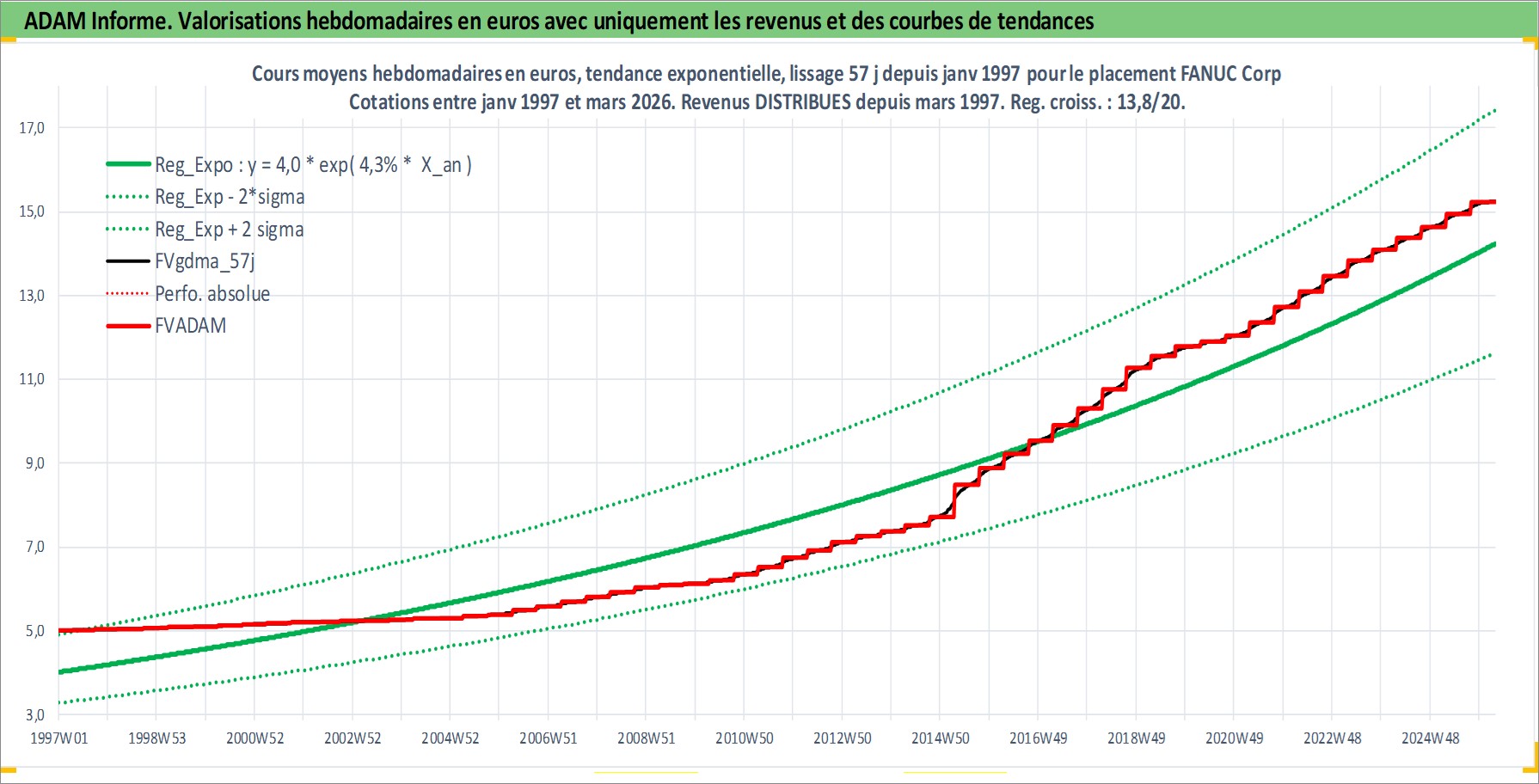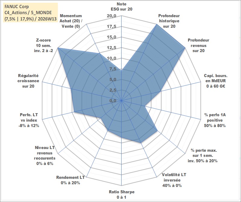 Site dédié aux investisseursPage dédiée sur site financeAnalyse des valorisations hebdomadaires de l'action FANUC Corp. Cet actif est cote en JPY. Les valorisations sont en contrevaleur EURO et couvrent les semaines 1997W01 a 2026W13. Les revenus de cet actif financier sont pris en compte depuis la semaine 1997W13. La note globale ESG de cet actif est estimee a 7.0 (apres rebasage entre 0 et 20).