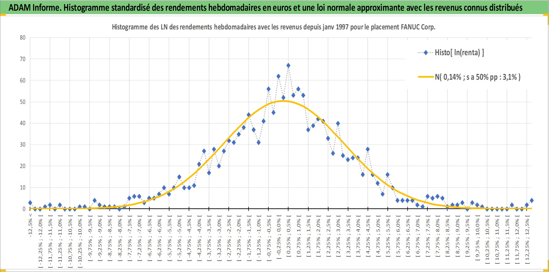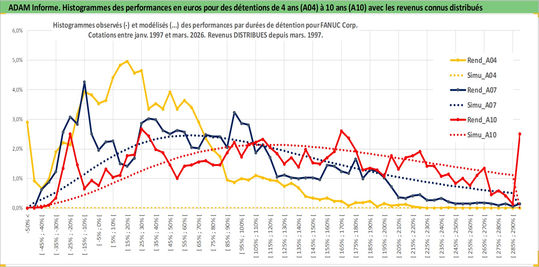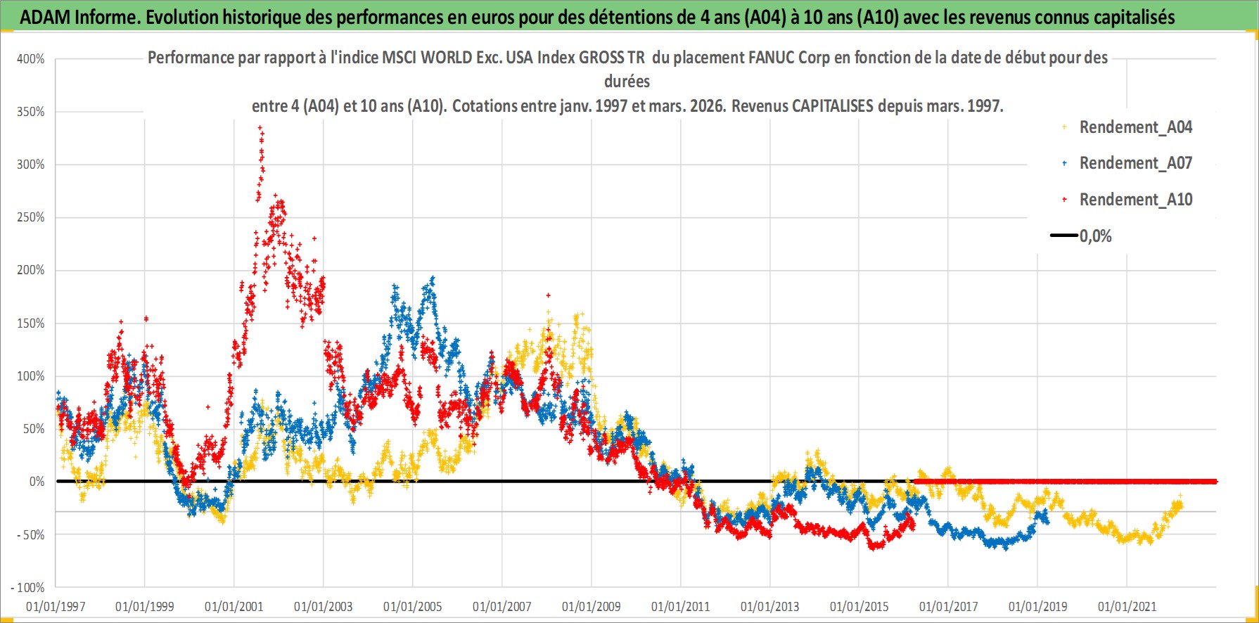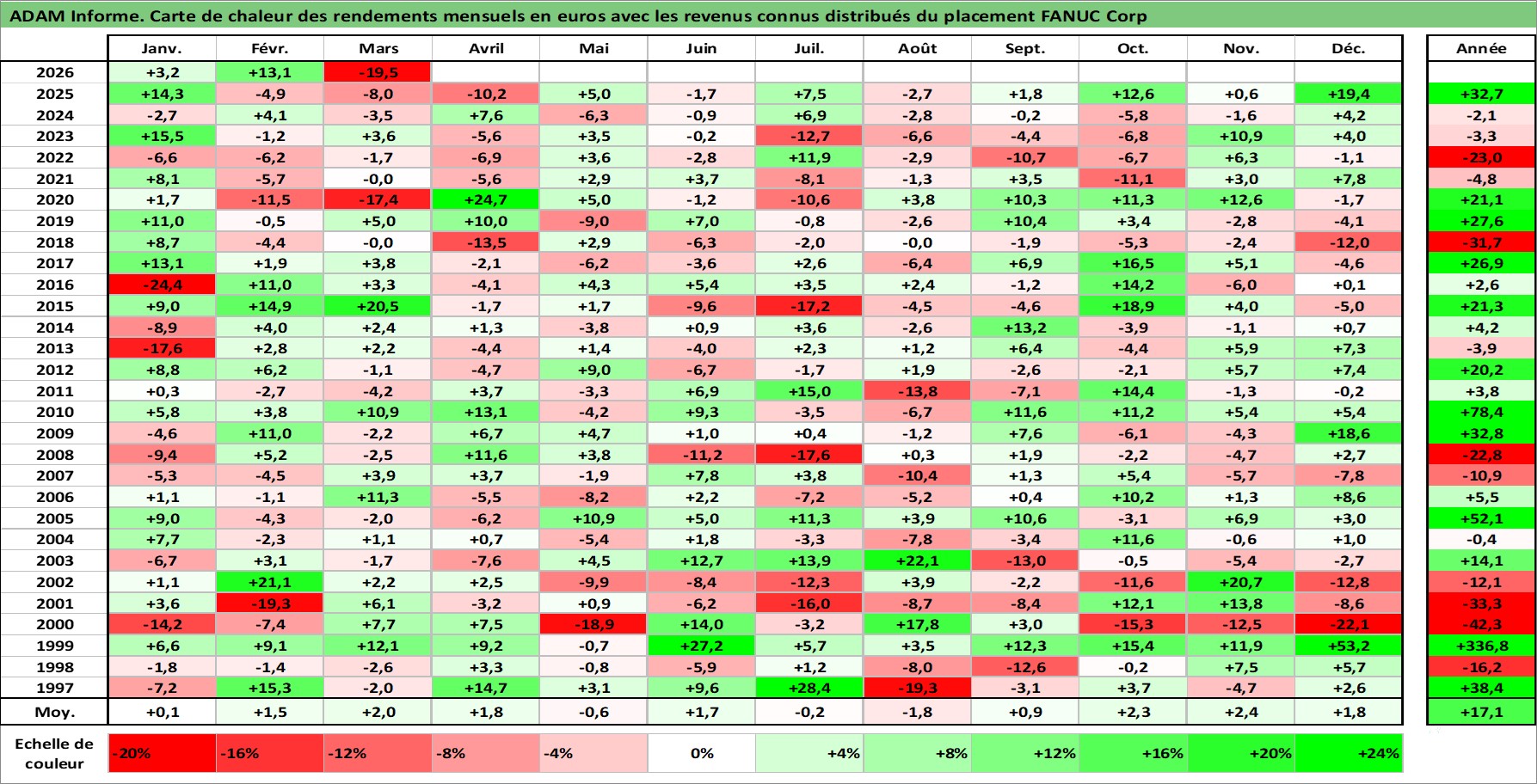 Site dédié aux investisseursPage dédiée sur site financeAnalyse des valorisations hebdomadaires de l'action FANUC Corp. Cet actif est cote en JPY. Les valorisations sont en contrevaleur EURO et couvrent les semaines 1997W01 a 2026W13. Les revenus de cet actif financier sont pris en compte depuis la semaine 1997W13. La note globale ESG de cet actif est estimee a 7.0 (apres rebasage entre 0 et 20).