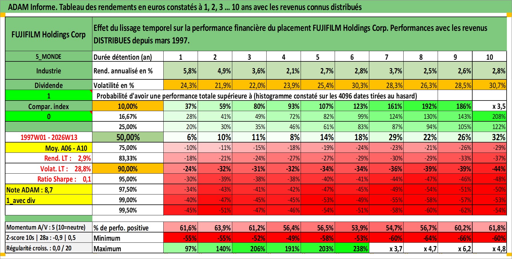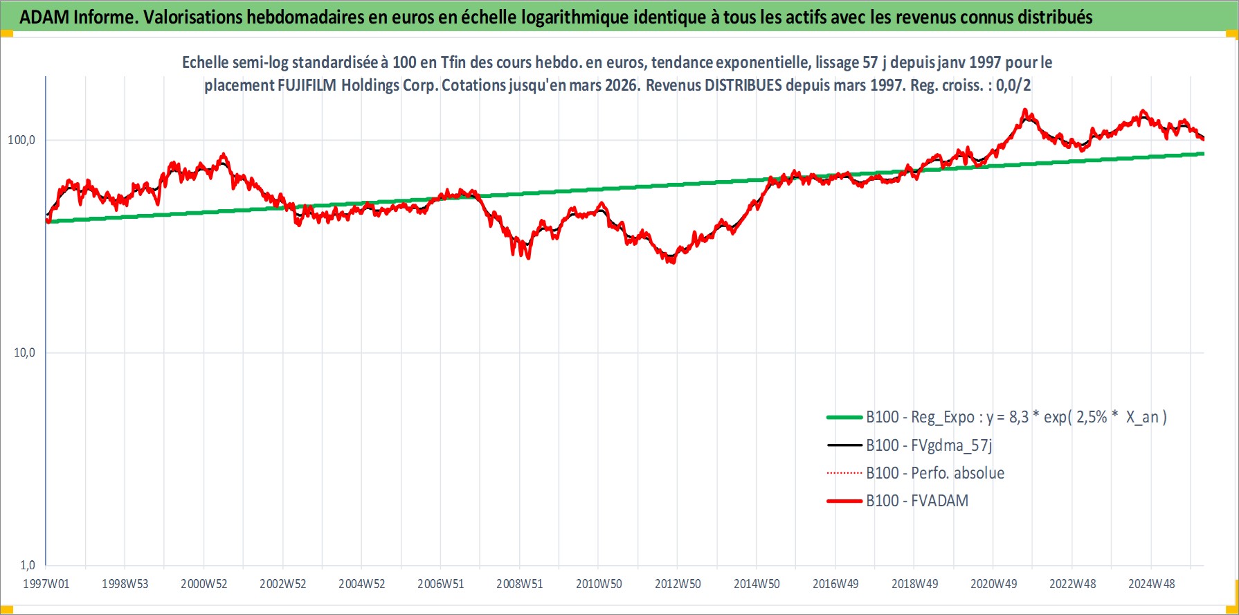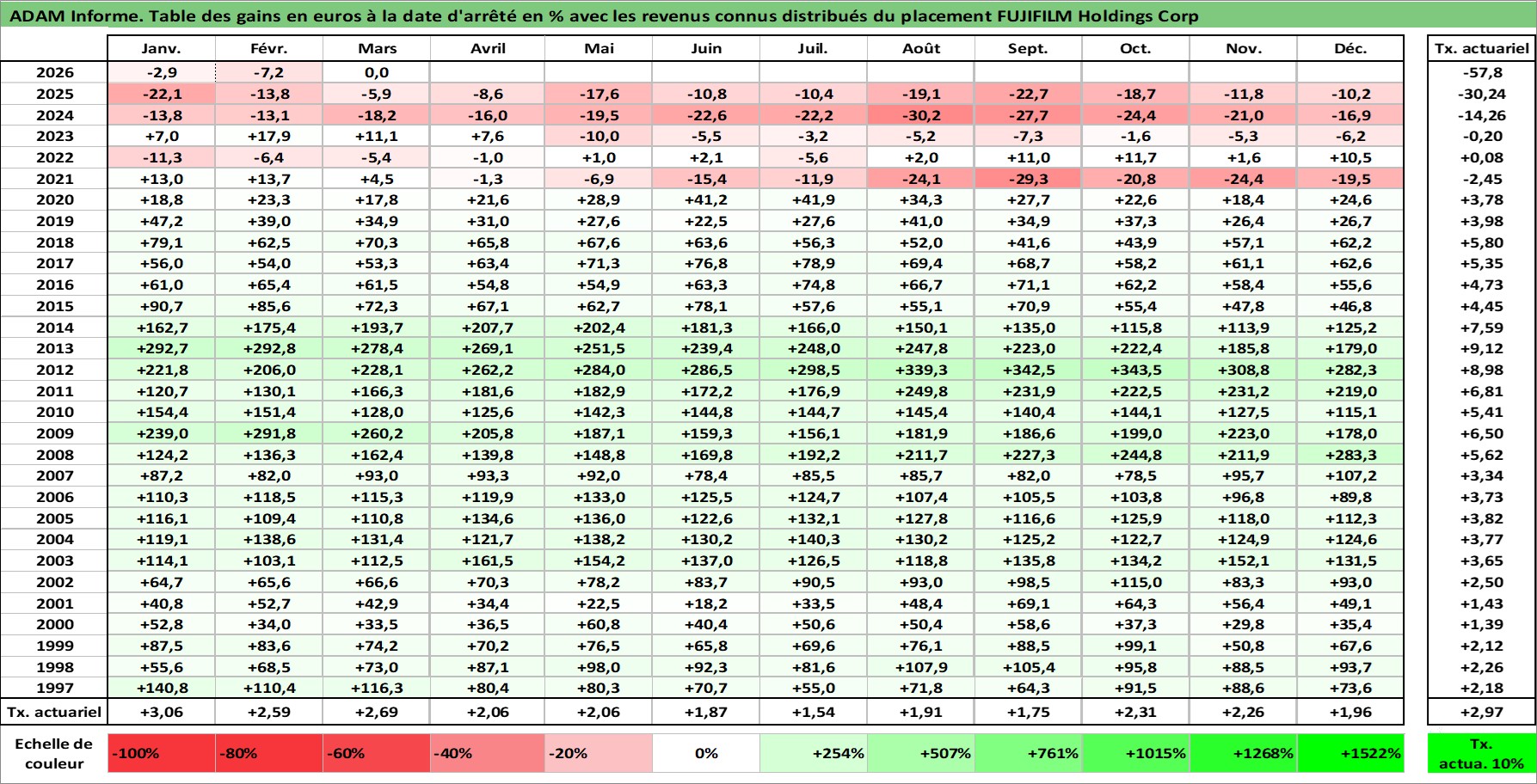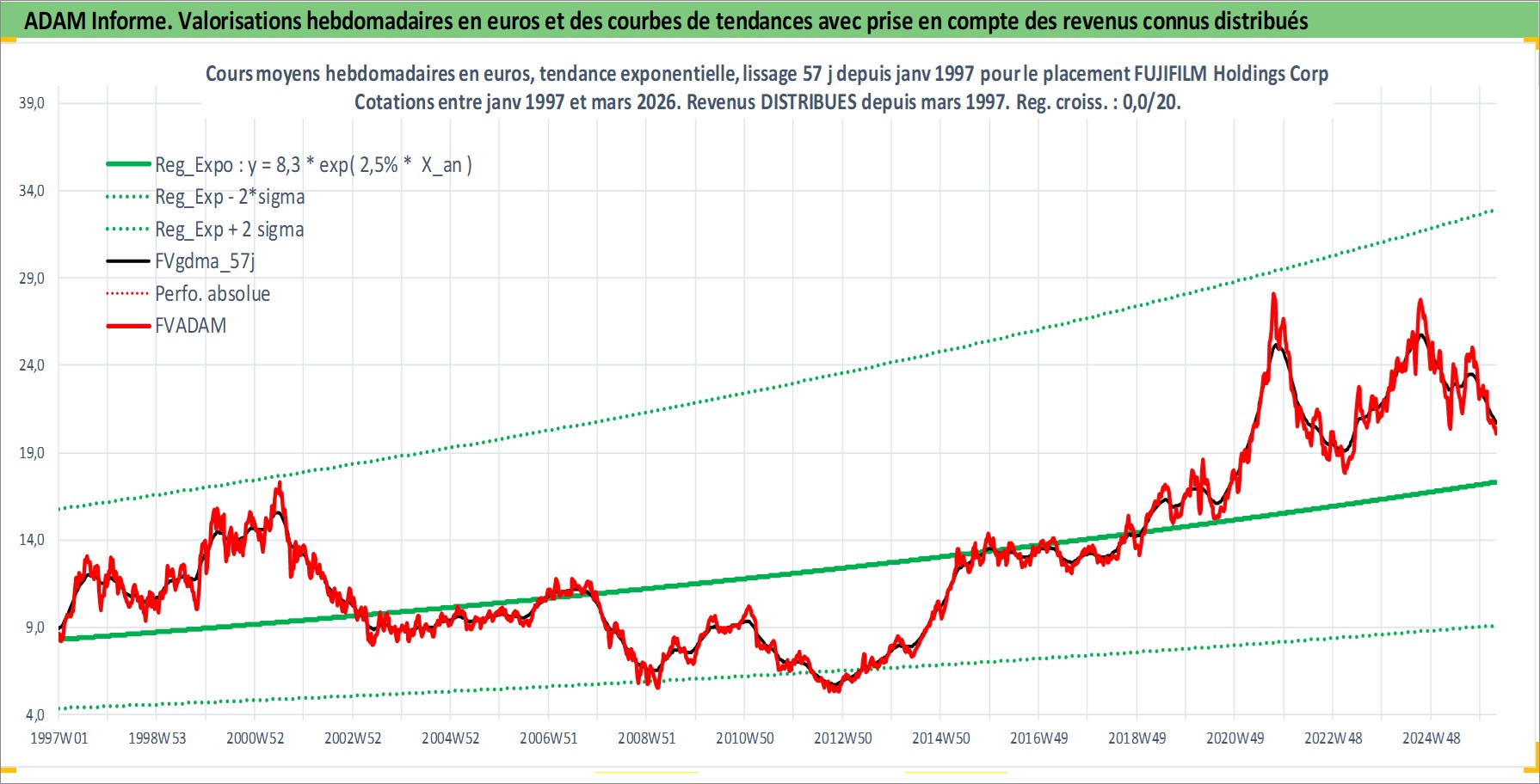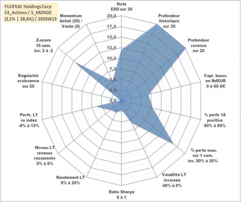 Site dédié aux investisseursPage dédiée sur site financeAnalyse des valorisations hebdomadaires de l'action FUJIFILM Holdings Corp. Cet actif est cote en JPY. Les valorisations sont en contrevaleur EURO et couvrent les semaines 1997W01 a 2026W13. Les revenus de cet actif financier sont pris en compte depuis la semaine 1997W13. La note globale ESG de cet actif est estimee a 12.0 (apres rebasage entre 0 et 20).
