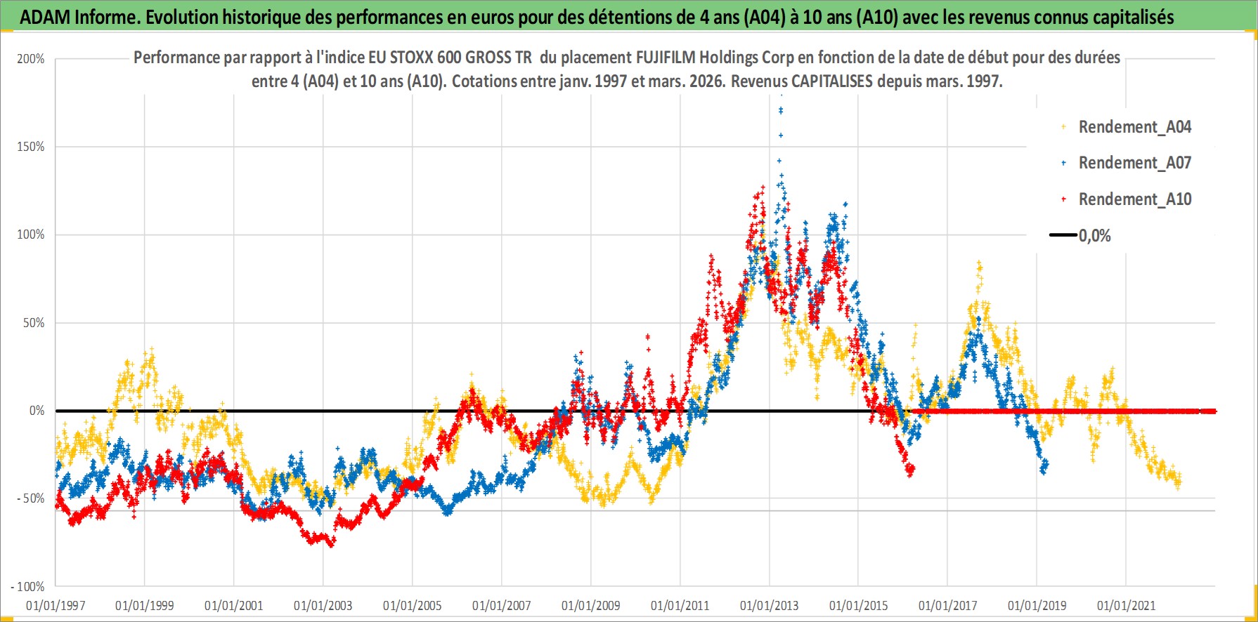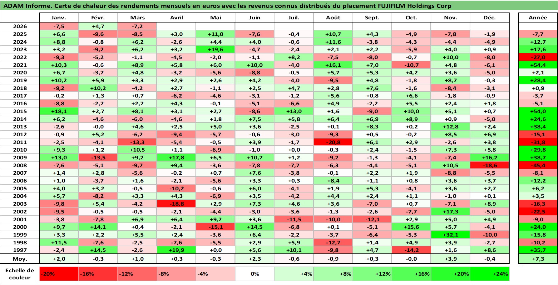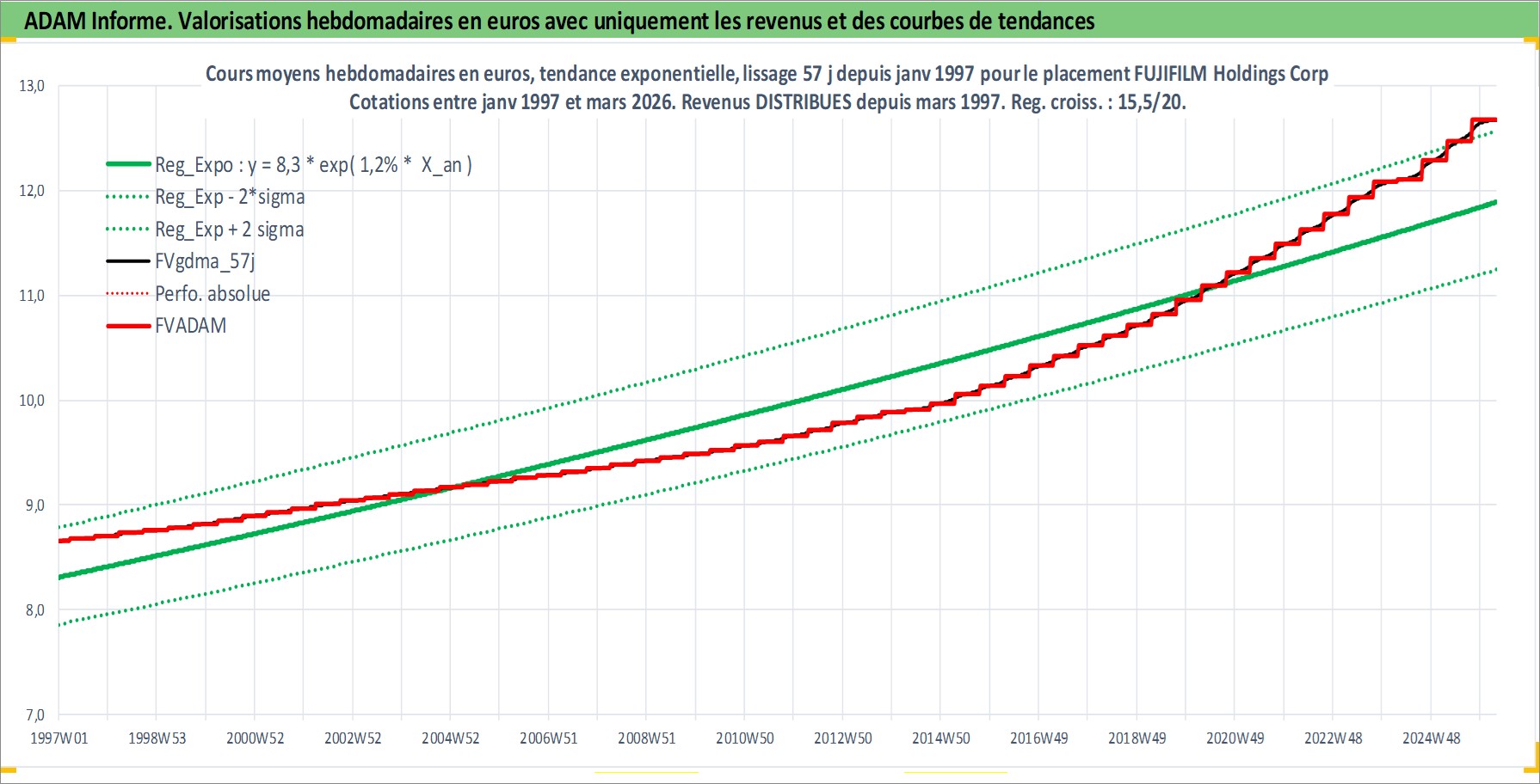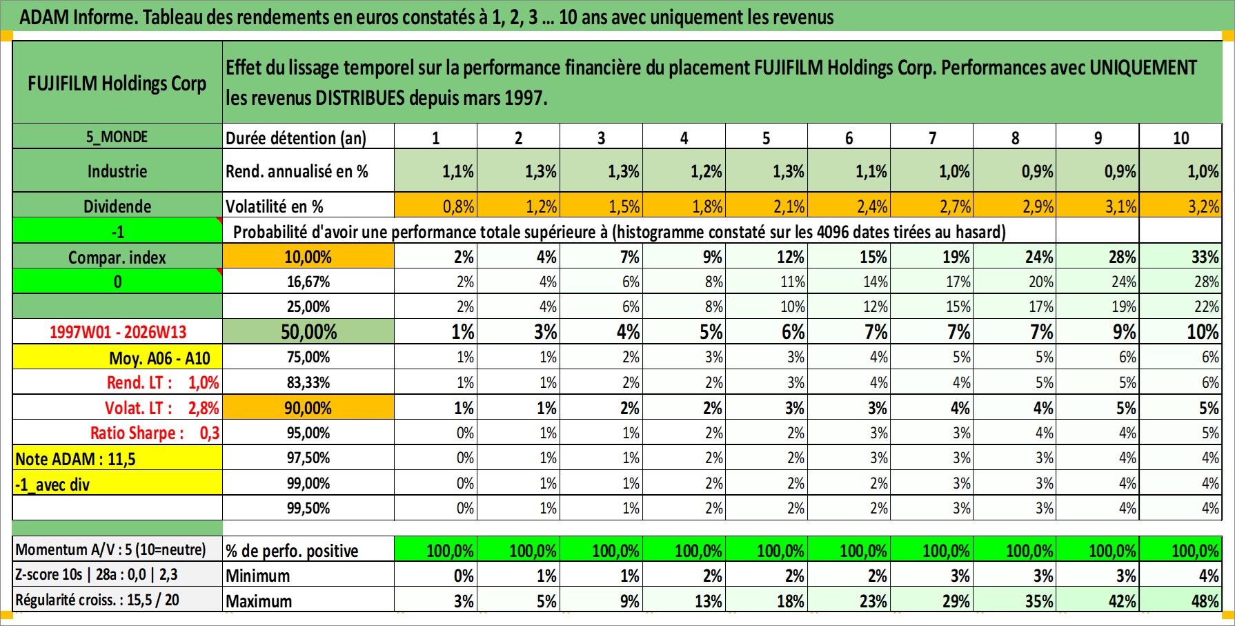 Site dédié aux investisseursPage dédiée sur site financeAnalyse des valorisations hebdomadaires de l'action FUJIFILM Holdings Corp. Cet actif est cote en JPY. Les valorisations sont en contrevaleur EURO et couvrent les semaines 1997W01 a 2026W13. Les revenus de cet actif financier sont pris en compte depuis la semaine 1997W13. La note globale ESG de cet actif est estimee a 12.0 (apres rebasage entre 0 et 20).