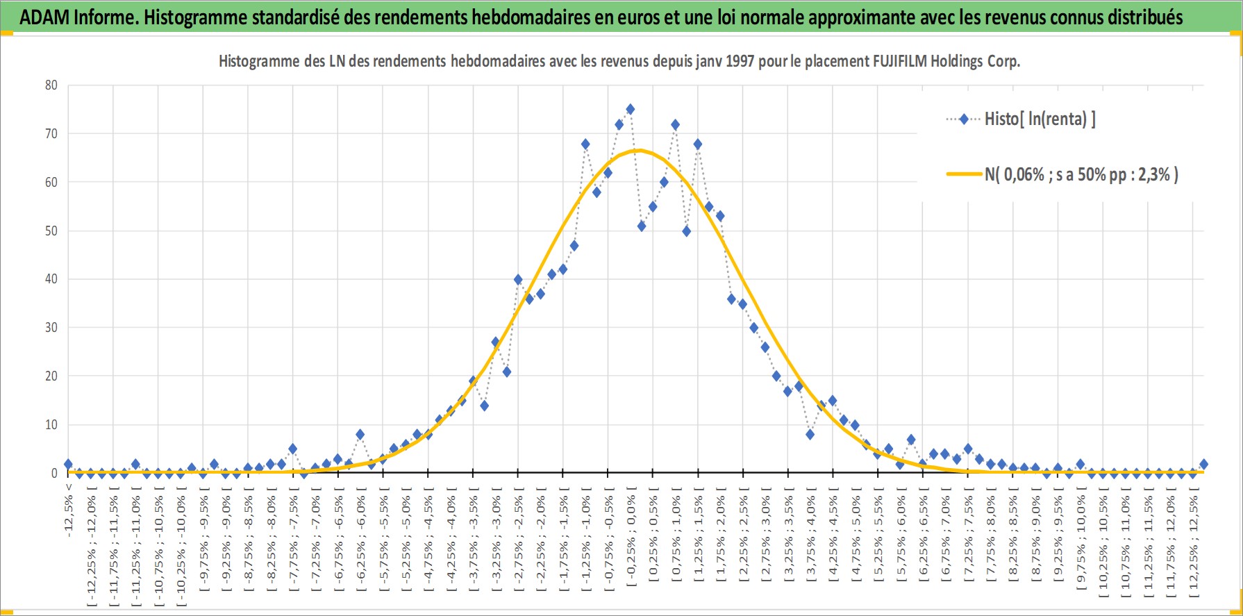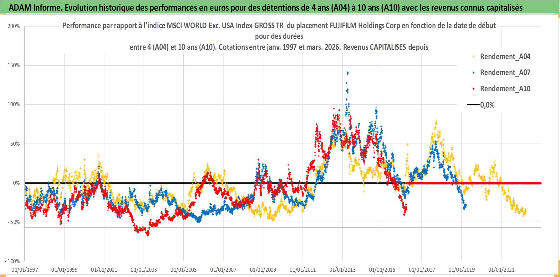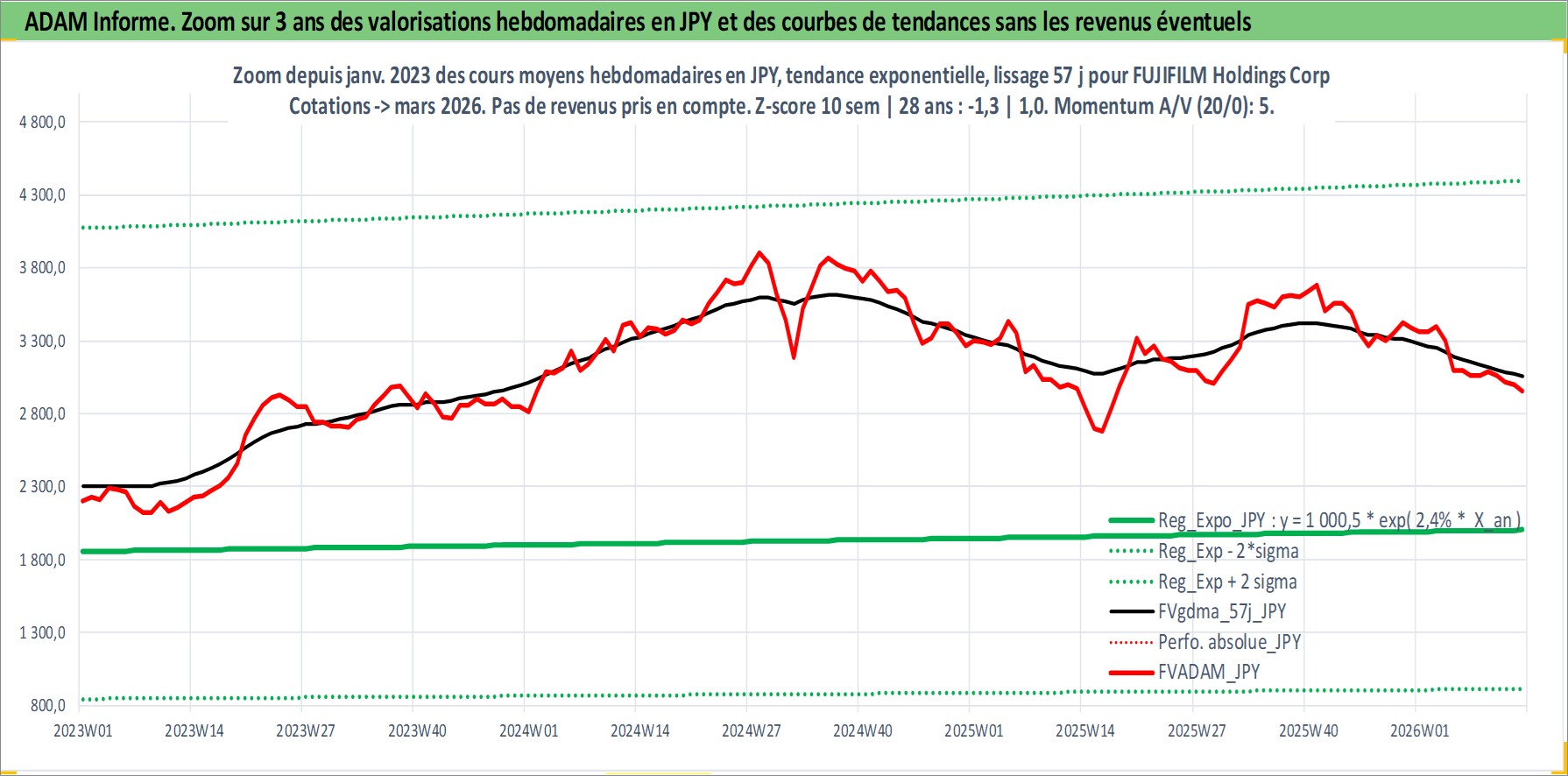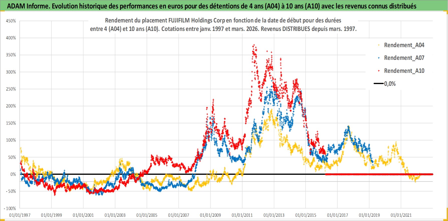 Site dédié aux investisseursPage dédiée sur site financeAnalyse des valorisations hebdomadaires de l'action FUJIFILM Holdings Corp. Cet actif est cote en JPY. Les valorisations sont en contrevaleur EURO et couvrent les semaines 1997W01 a 2026W13. Les revenus de cet actif financier sont pris en compte depuis la semaine 1997W13. La note globale ESG de cet actif est estimee a 12.0 (apres rebasage entre 0 et 20).