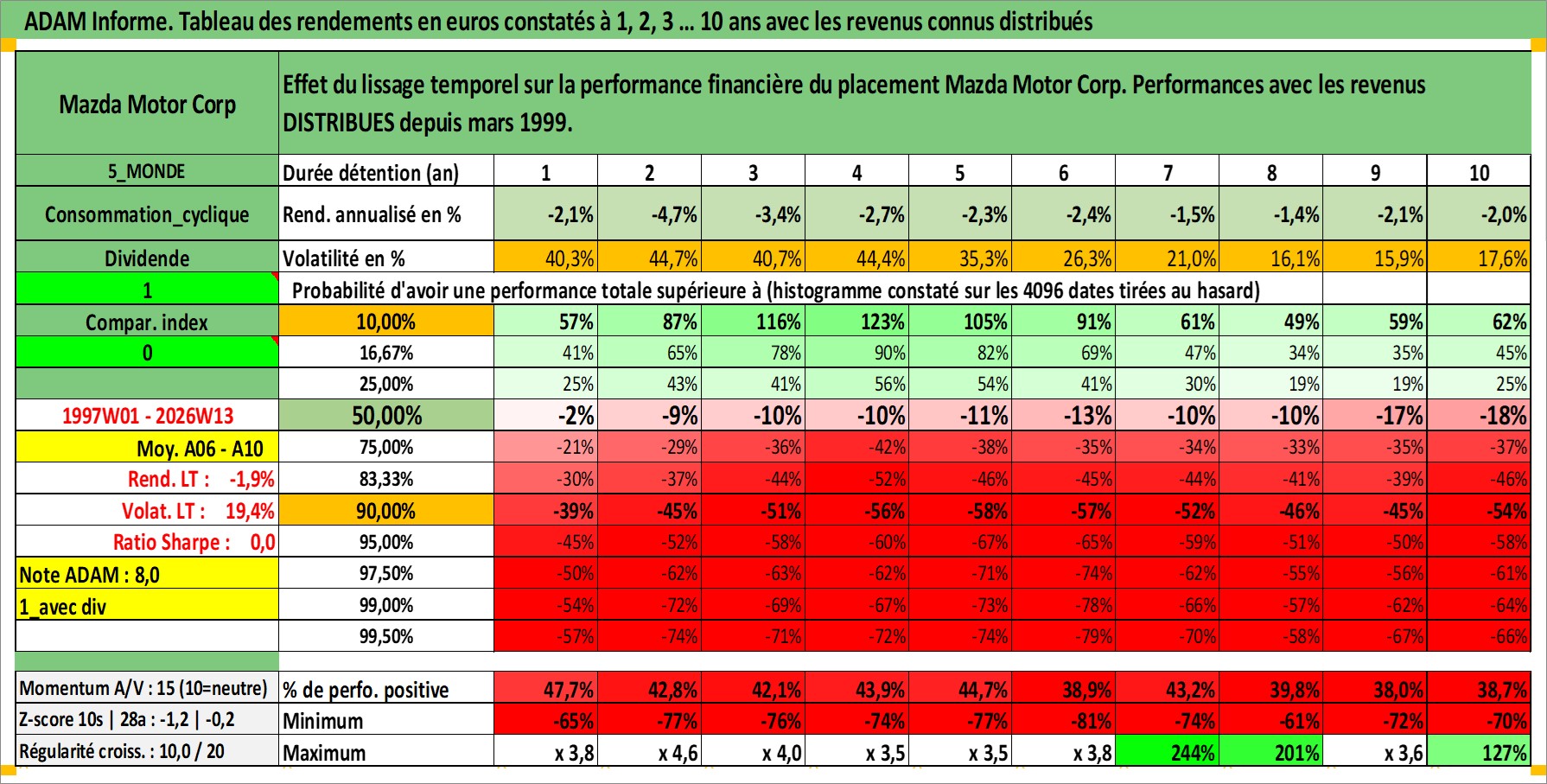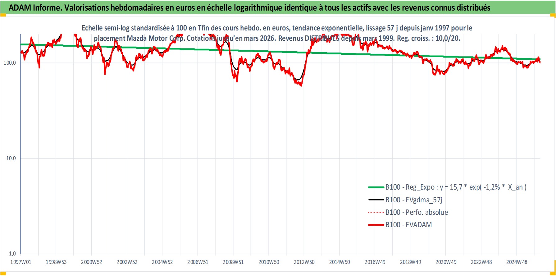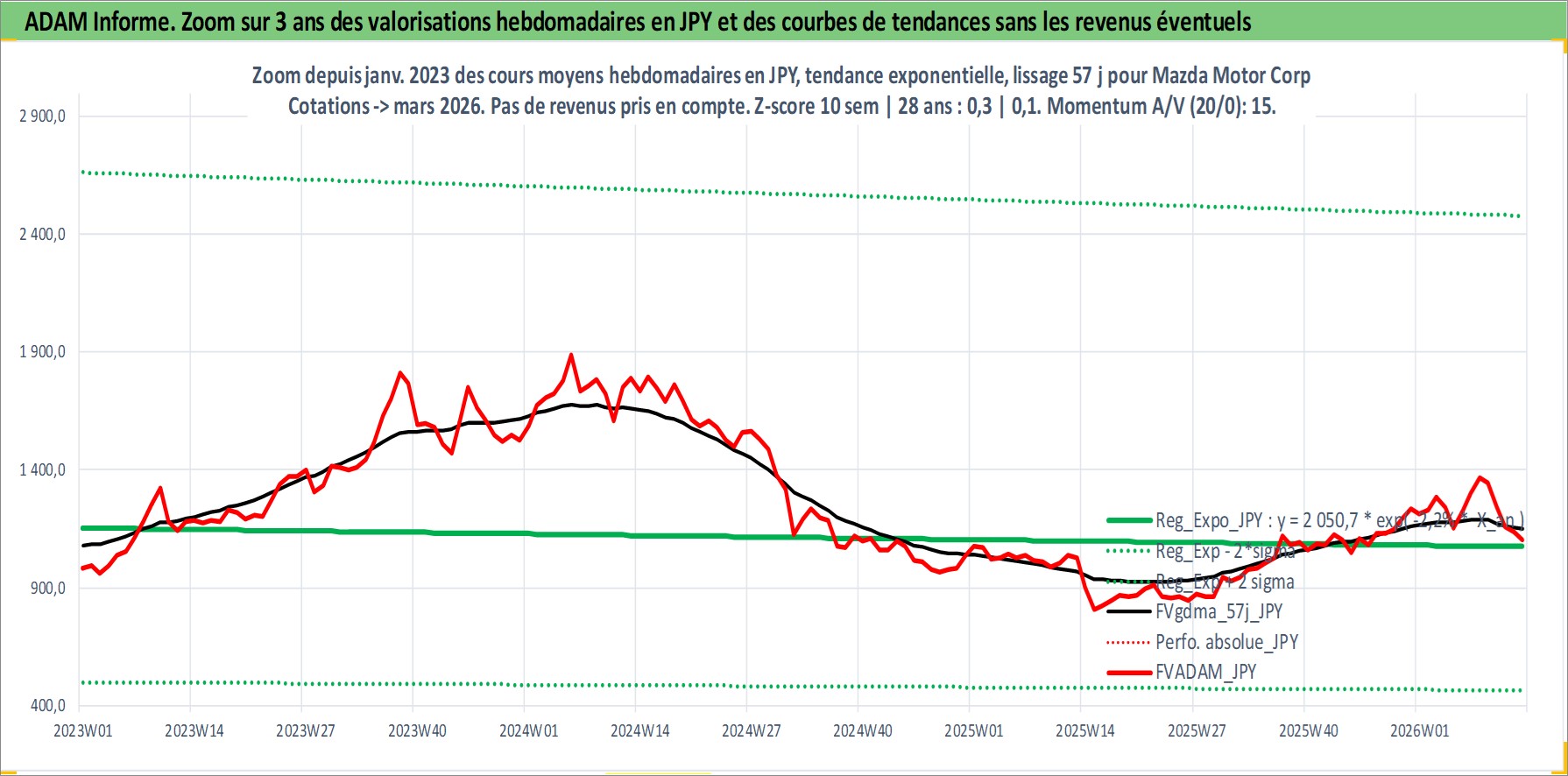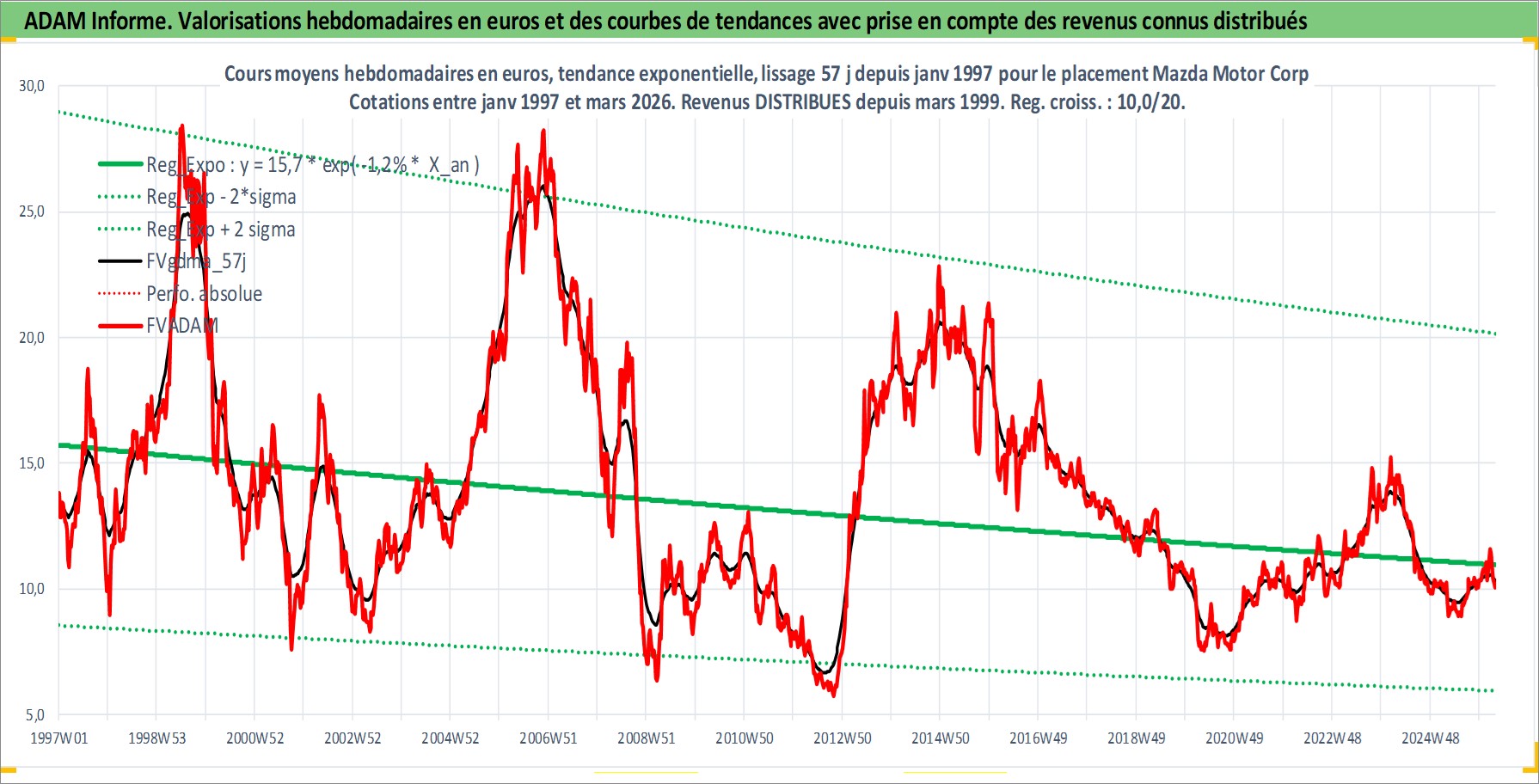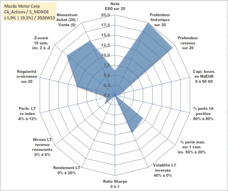 Site dédié aux investisseursPage dédiée sur site financeAnalyse des valorisations hebdomadaires de l'action Mazda Motor Corp. Cet actif est cote en JPY. Les valorisations sont en contrevaleur EURO et couvrent les semaines 1997W01 a 2026W13. Les revenus de cet actif financier sont pris en compte depuis la semaine 1999W12. La note globale ESG de cet actif est estimee a 6.0 (apres rebasage entre 0 et 20).