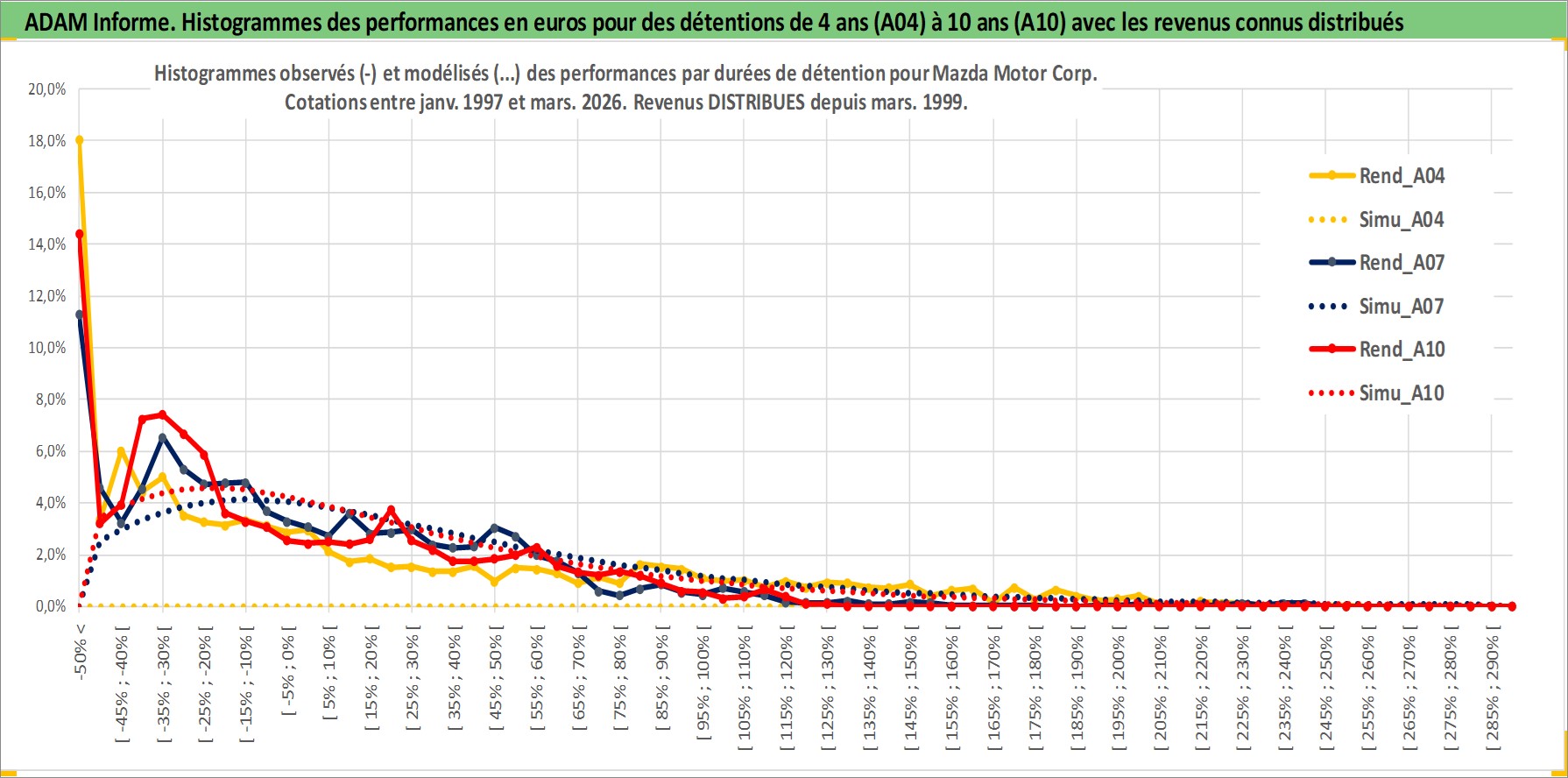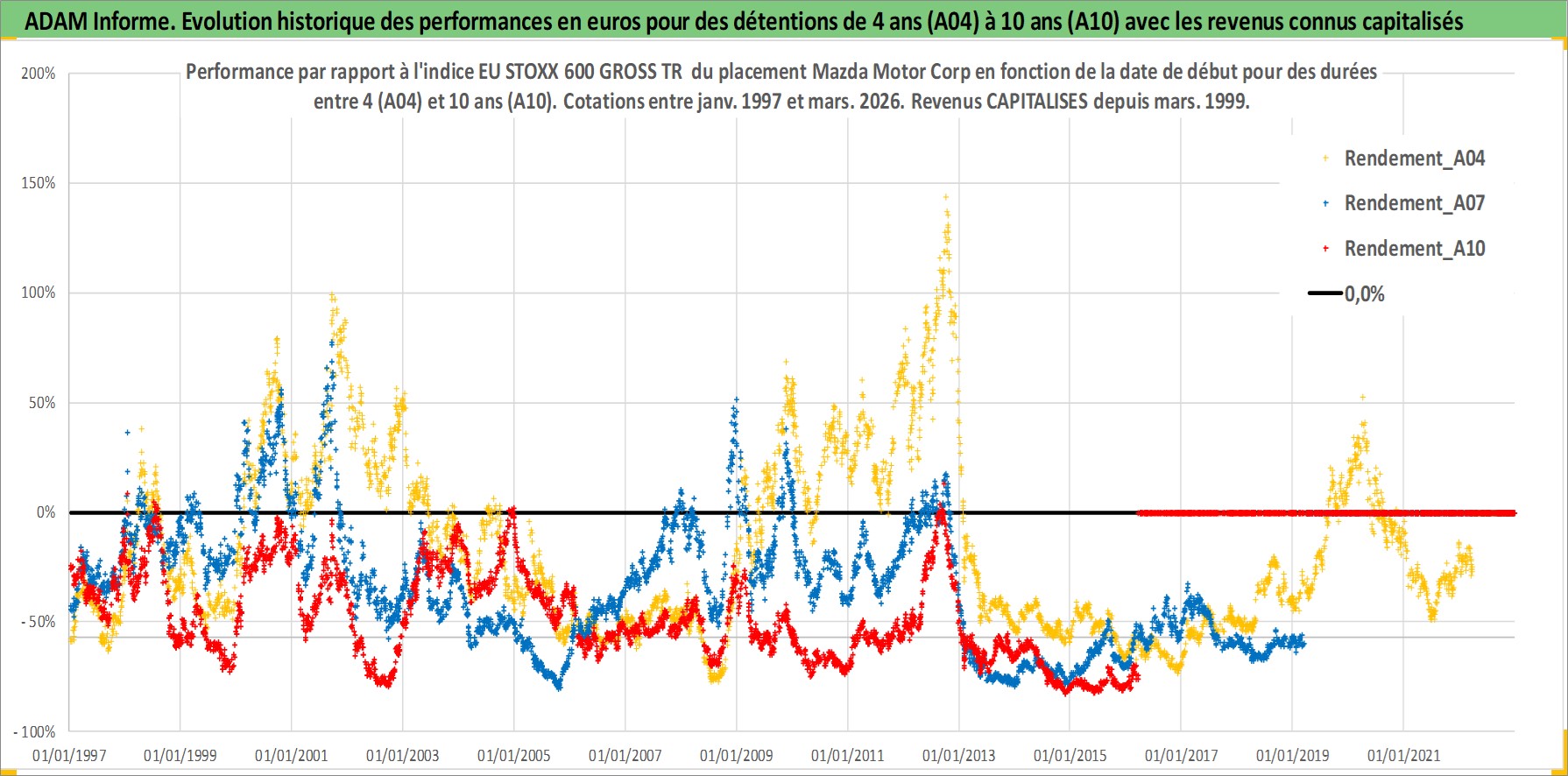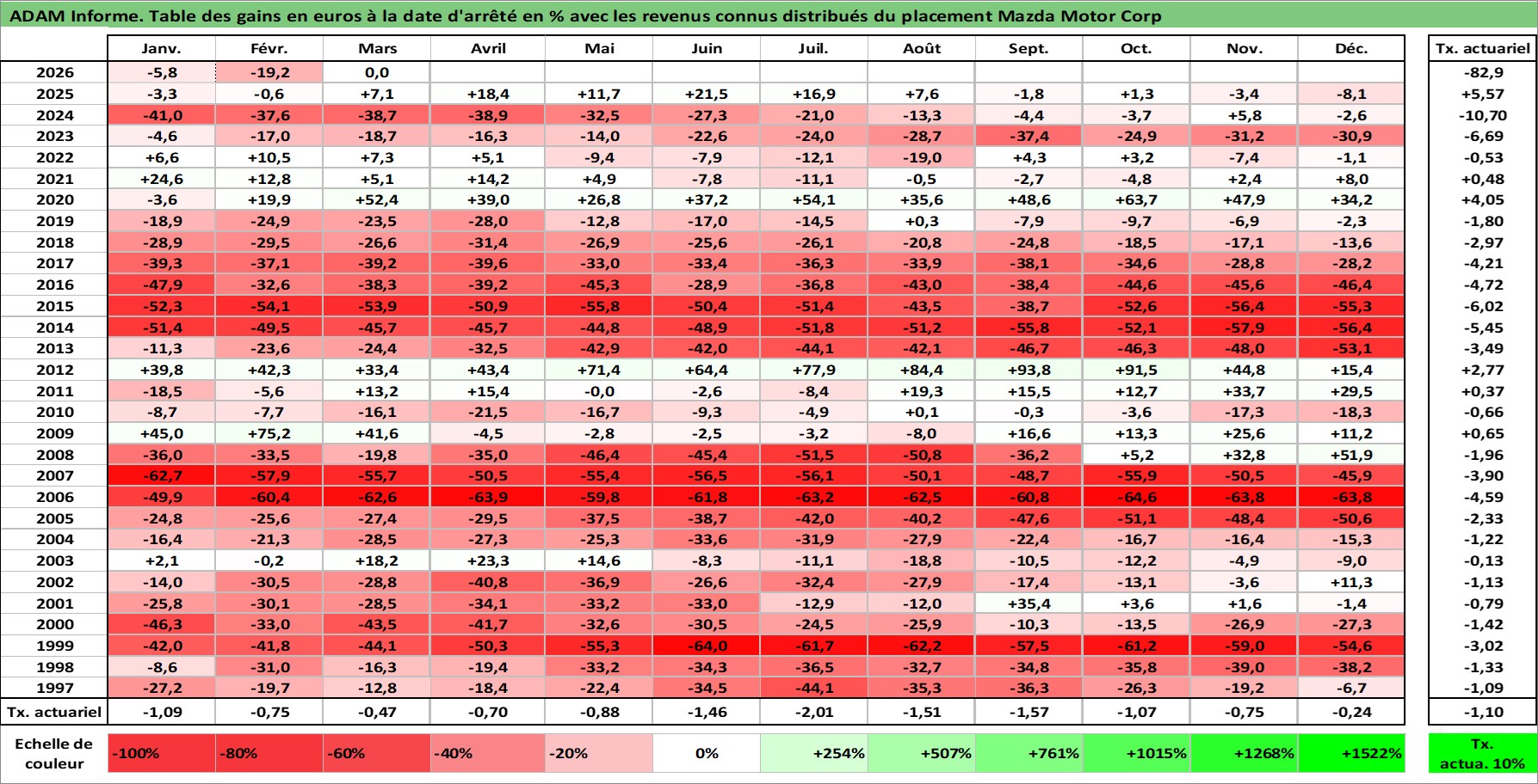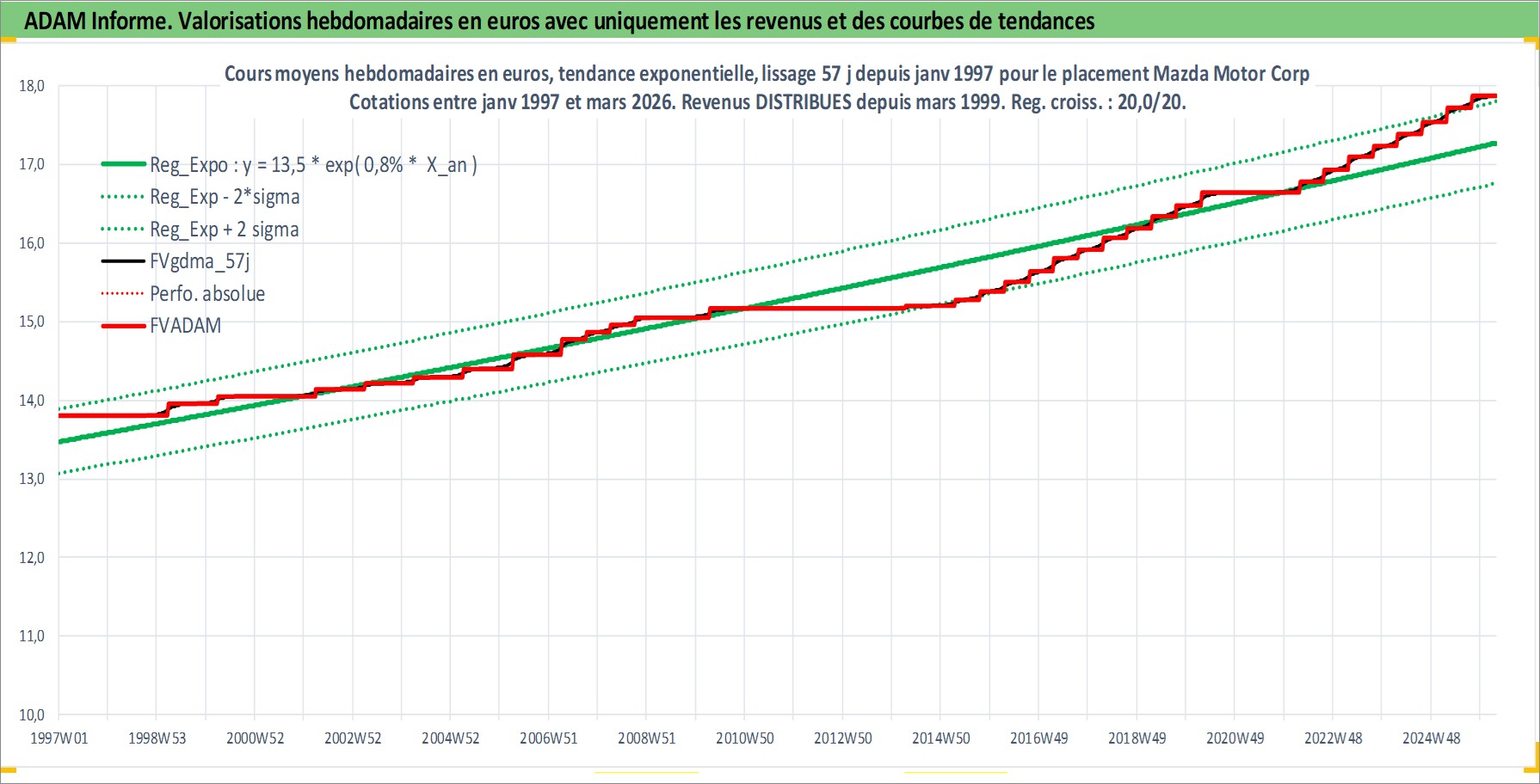 Site dédié aux investisseursPage dédiée sur site financeAnalyse des valorisations hebdomadaires de l'action Mazda Motor Corp. Cet actif est cote en JPY. Les valorisations sont en contrevaleur EURO et couvrent les semaines 1997W01 a 2026W13. Les revenus de cet actif financier sont pris en compte depuis la semaine 1999W12. La note globale ESG de cet actif est estimee a 6.0 (apres rebasage entre 0 et 20).
