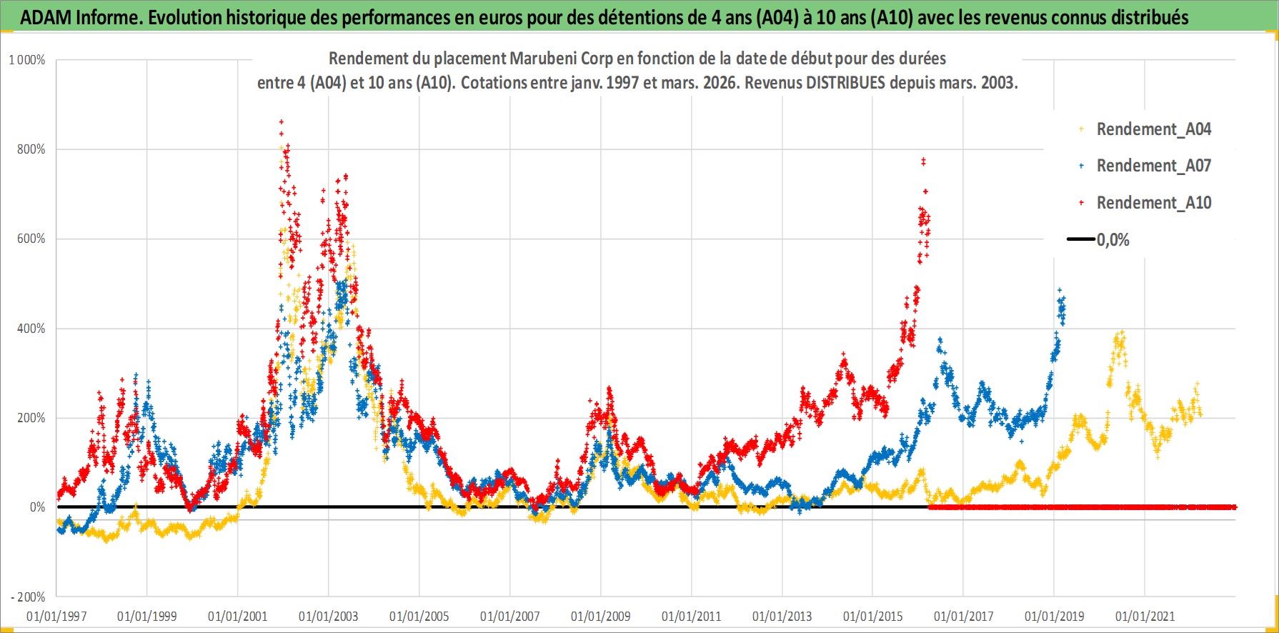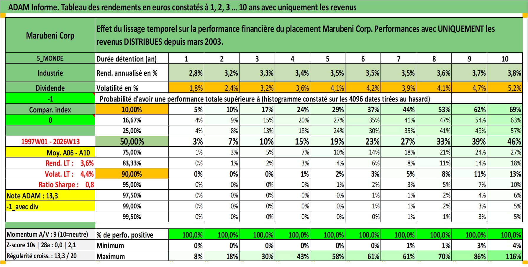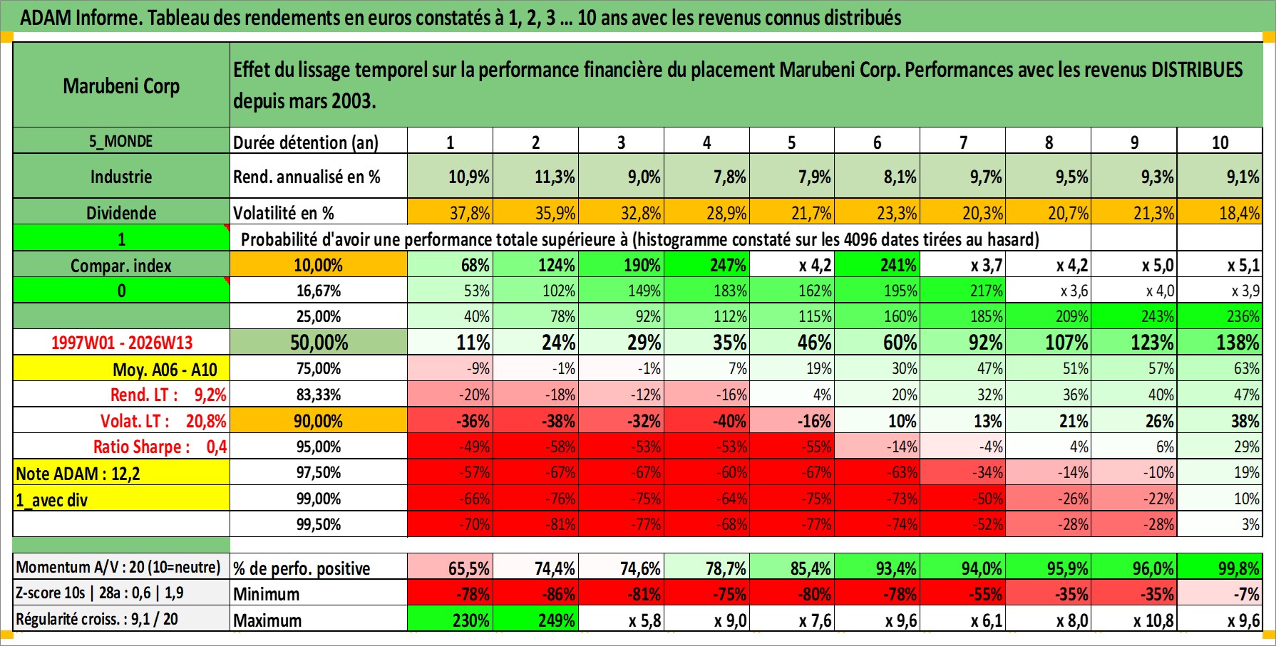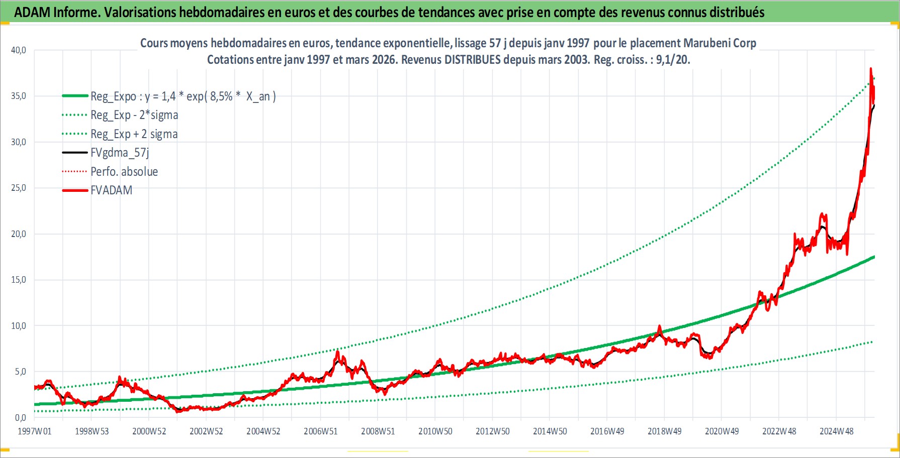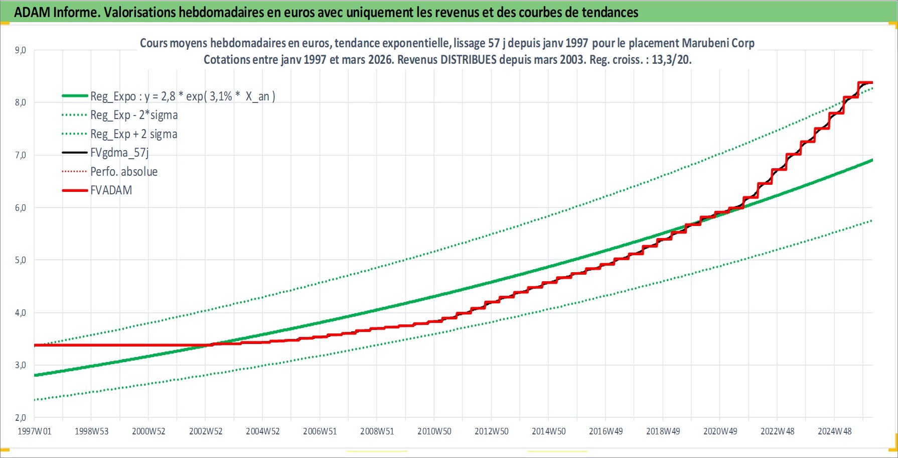 Site dédié aux investisseursPage dédiée sur site financeAnalyse des valorisations hebdomadaires de l'action Marubeni Corp. Cet actif est cote en JPY. Les valorisations sont en contrevaleur EURO et couvrent les semaines 1997W01 a 2026W13. Les revenus de cet actif financier sont pris en compte depuis la semaine 2003W13. La note globale ESG de cet actif est estimee a 7.0 (apres rebasage entre 0 et 20).
