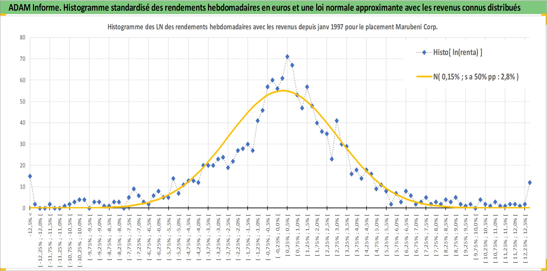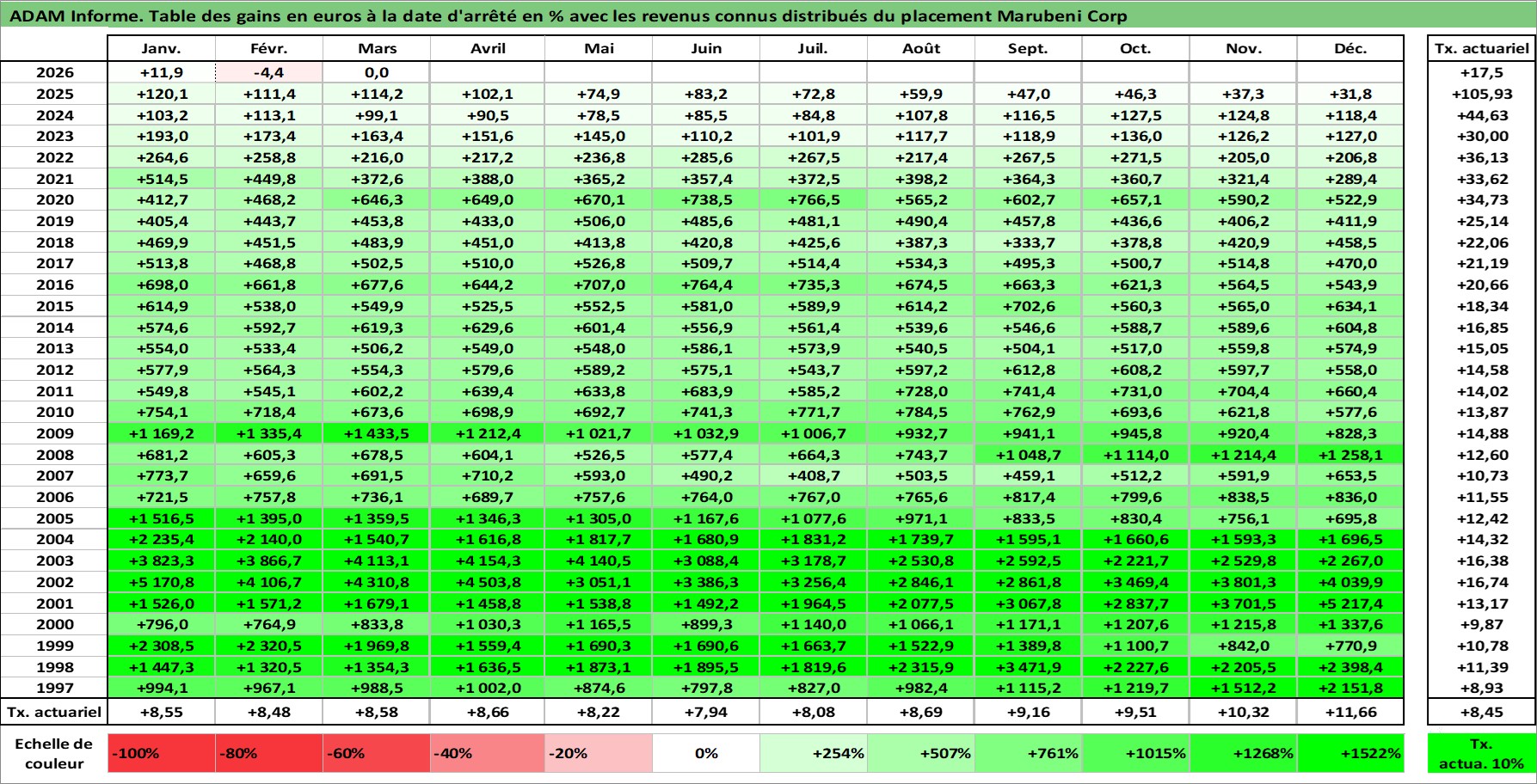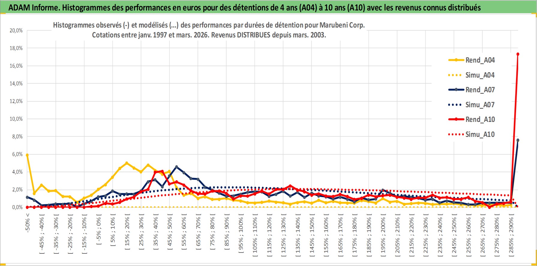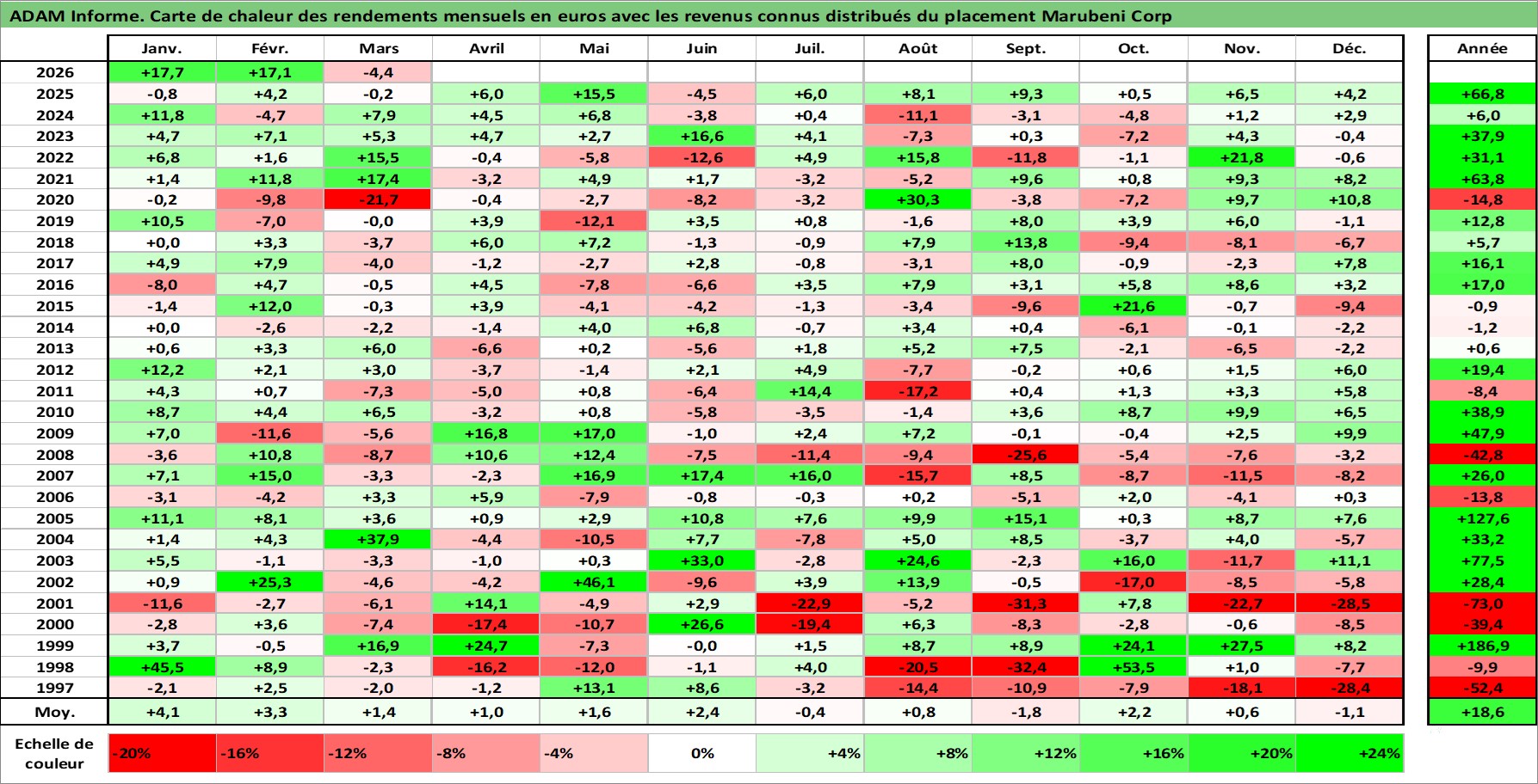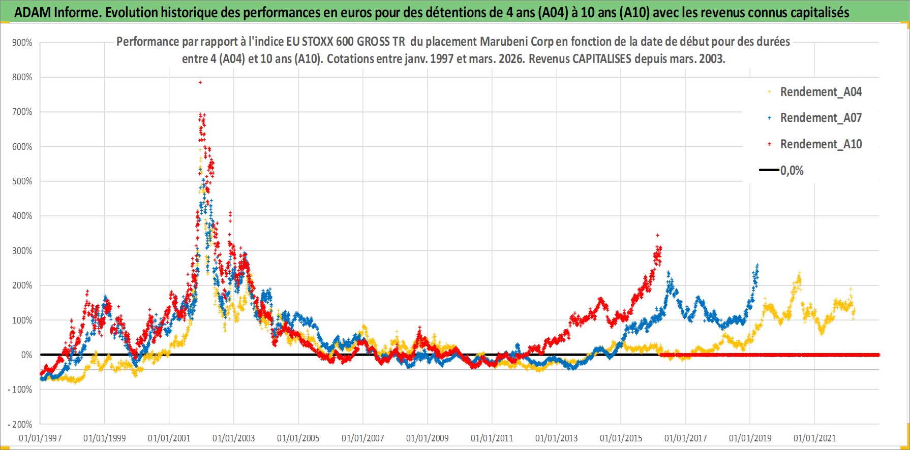 Site dédié aux investisseursPage dédiée sur site financeAnalyse des valorisations hebdomadaires de l'action Marubeni Corp. Cet actif est cote en JPY. Les valorisations sont en contrevaleur EURO et couvrent les semaines 1997W01 a 2026W13. Les revenus de cet actif financier sont pris en compte depuis la semaine 2003W13. La note globale ESG de cet actif est estimee a 7.0 (apres rebasage entre 0 et 20).