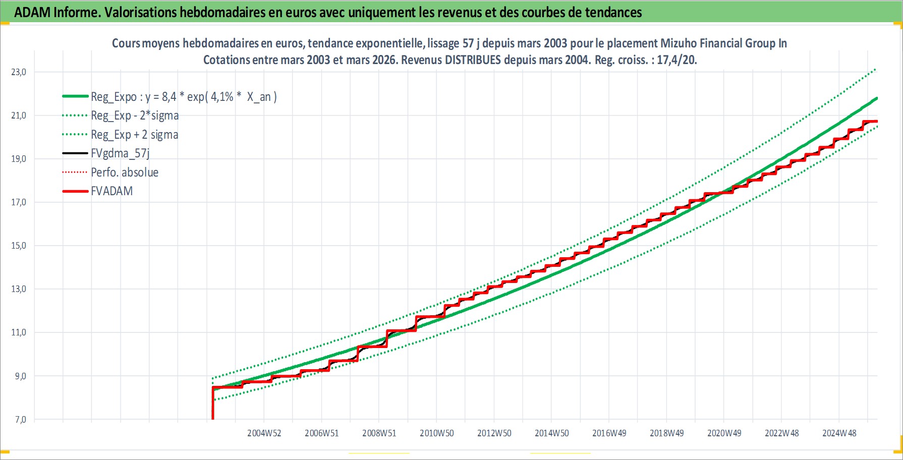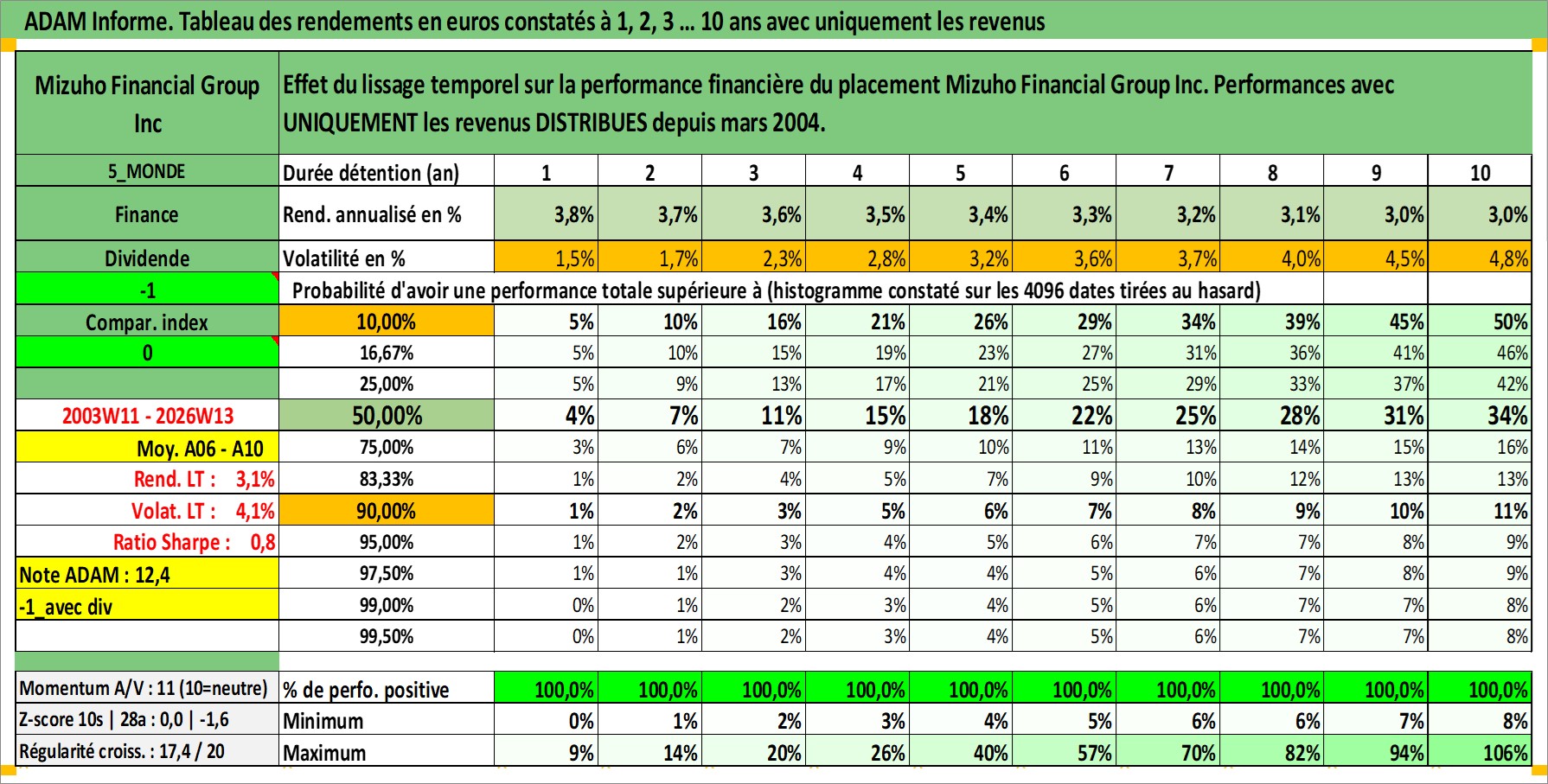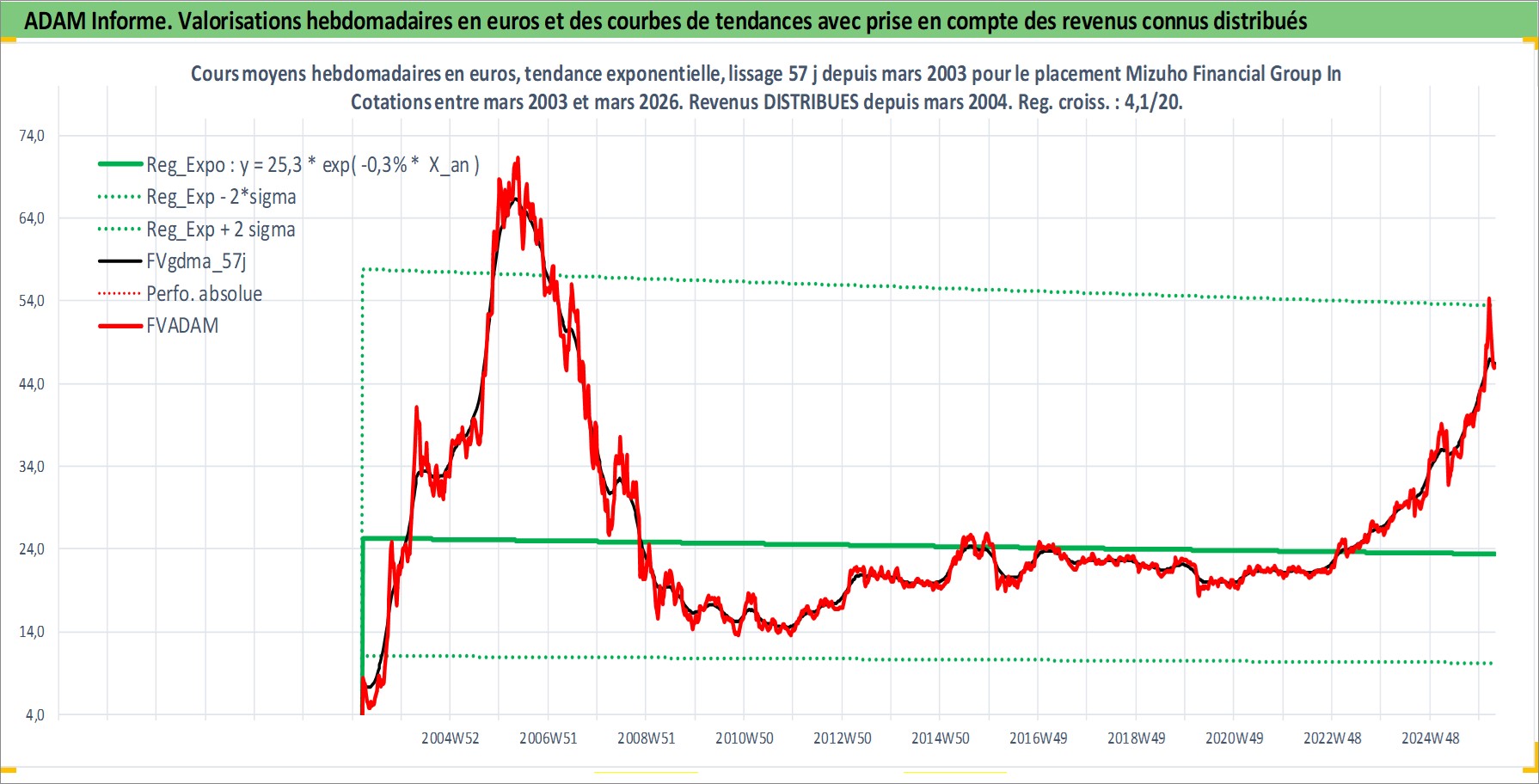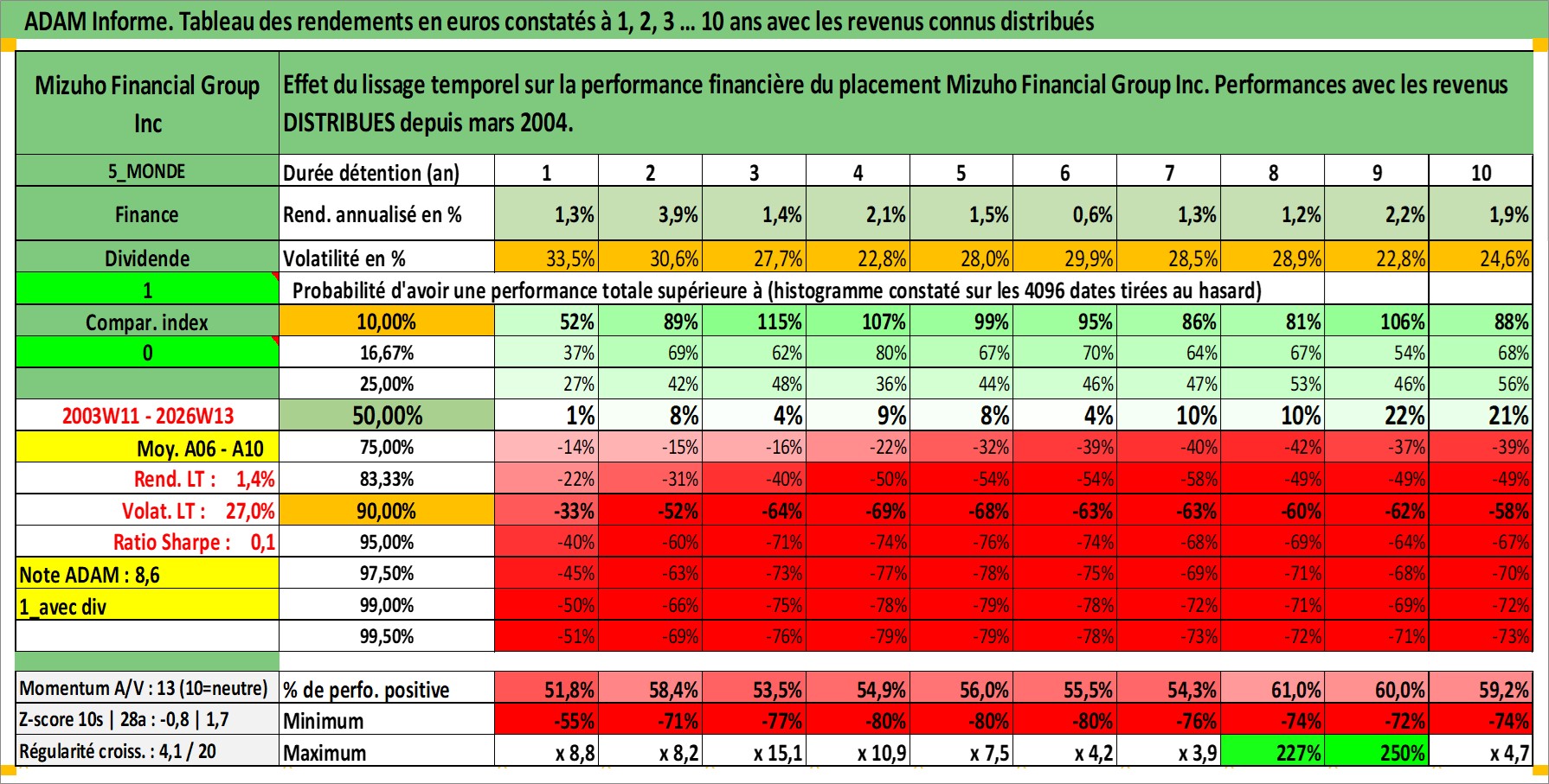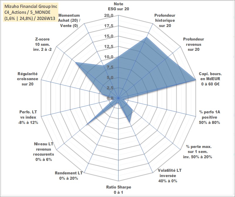 Site dédié aux investisseursPage dédiée sur site financeAnalyse des valorisations hebdomadaires de l'action Mizuho Financial Group Inc. Cet actif est cote en JPY. Les valorisations sont en contrevaleur EURO et couvrent les semaines 2003W11 a 2026W13. Les revenus de cet actif financier sont pris en compte depuis la semaine 2004W13. La note globale ESG de cet actif est estimee a 10.0 (apres rebasage entre 0 et 20).