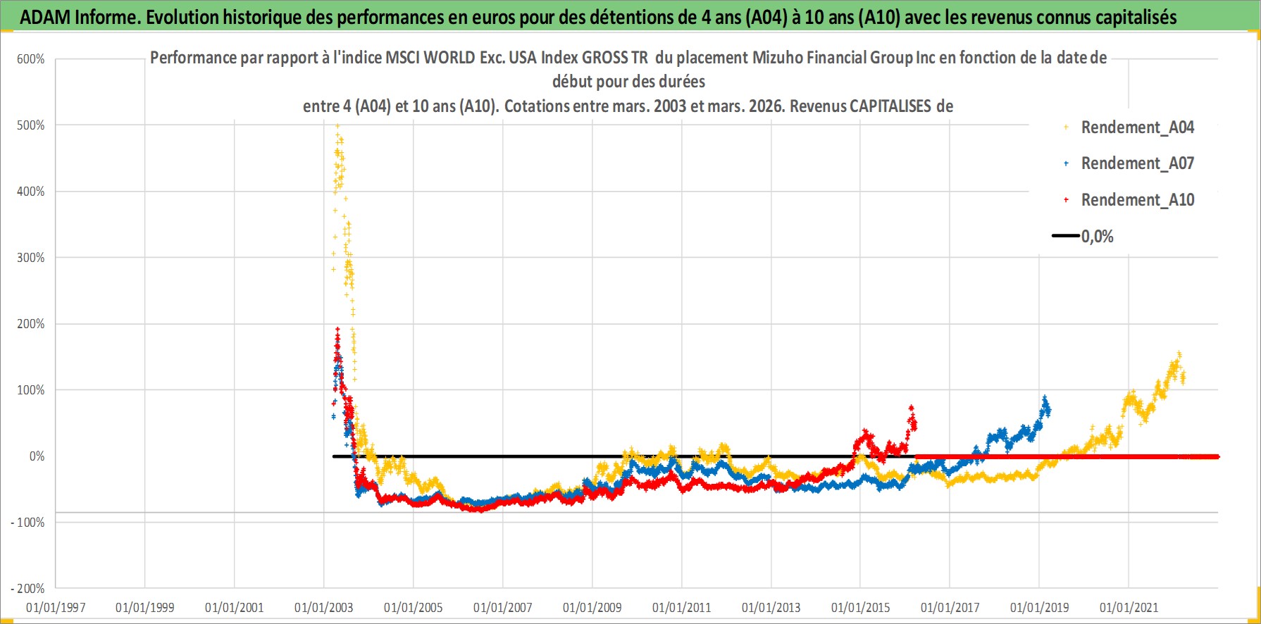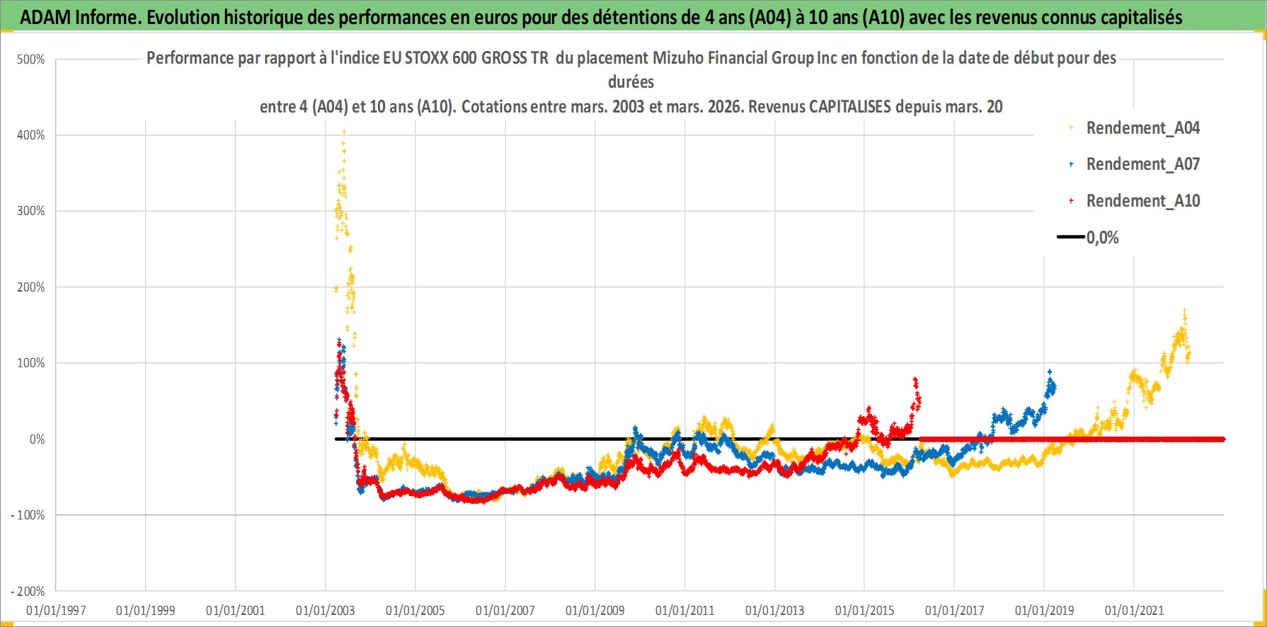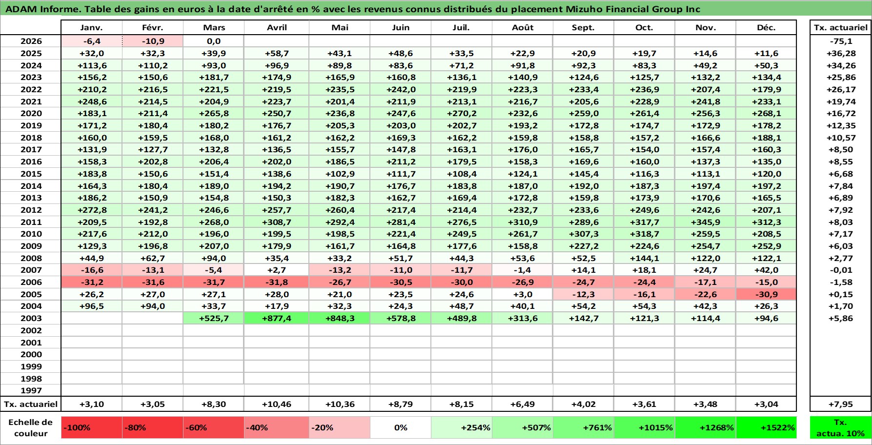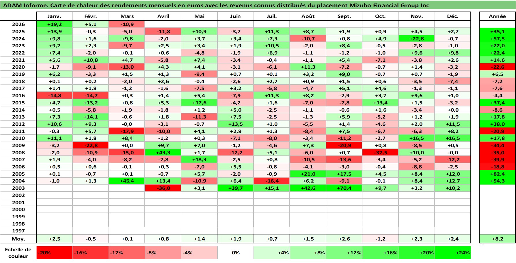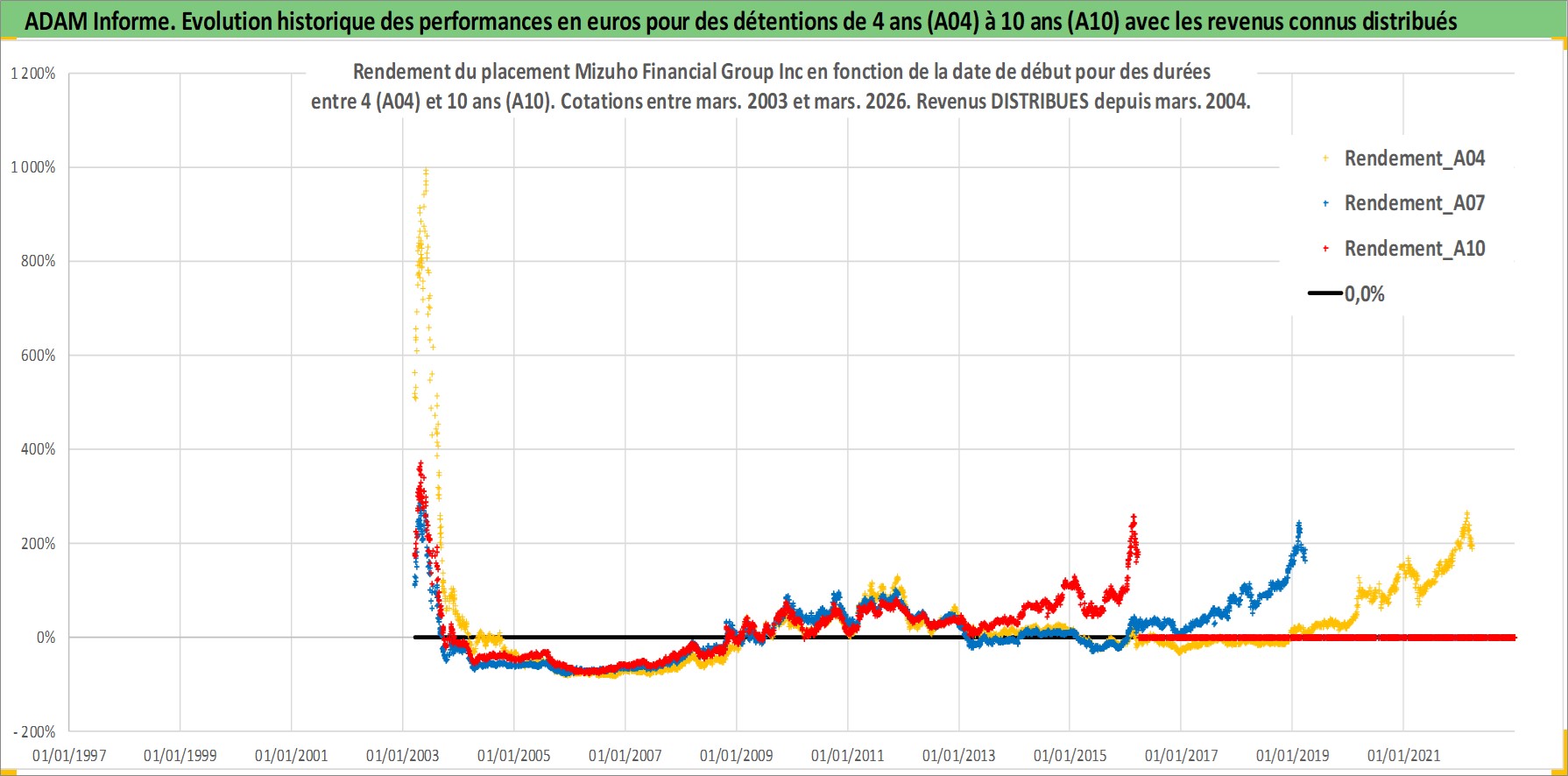 Site dédié aux investisseursPage dédiée sur site financeAnalyse des valorisations hebdomadaires de l'action Mizuho Financial Group Inc. Cet actif est cote en JPY. Les valorisations sont en contrevaleur EURO et couvrent les semaines 2003W11 a 2026W13. Les revenus de cet actif financier sont pris en compte depuis la semaine 2004W13. La note globale ESG de cet actif est estimee a 10.0 (apres rebasage entre 0 et 20).