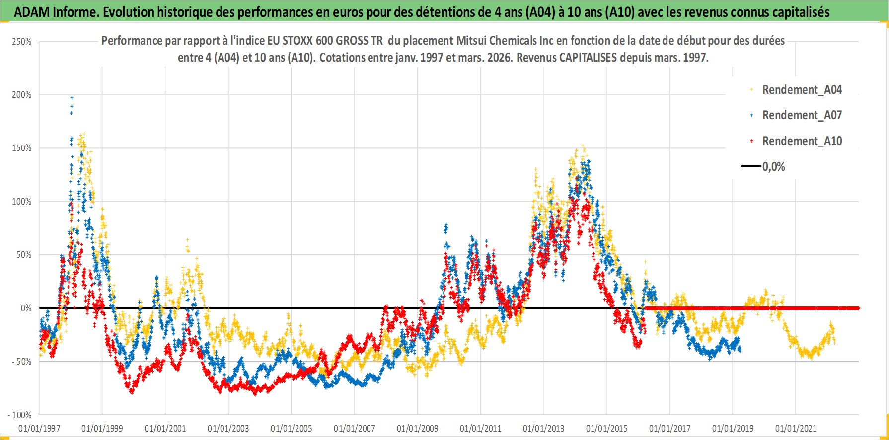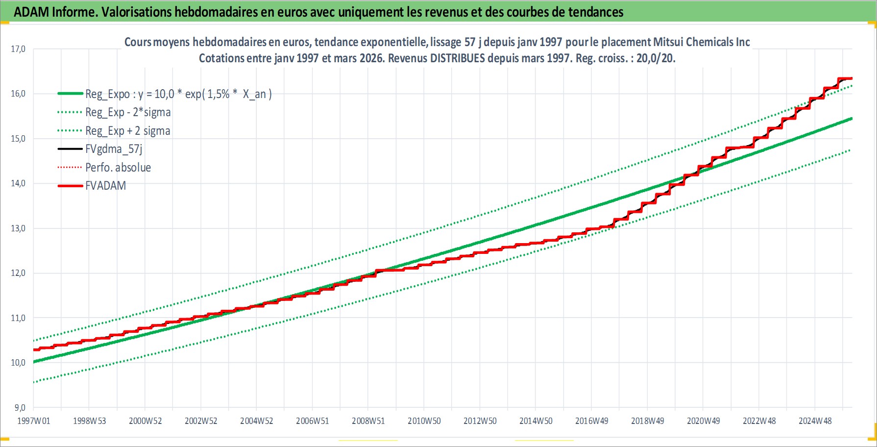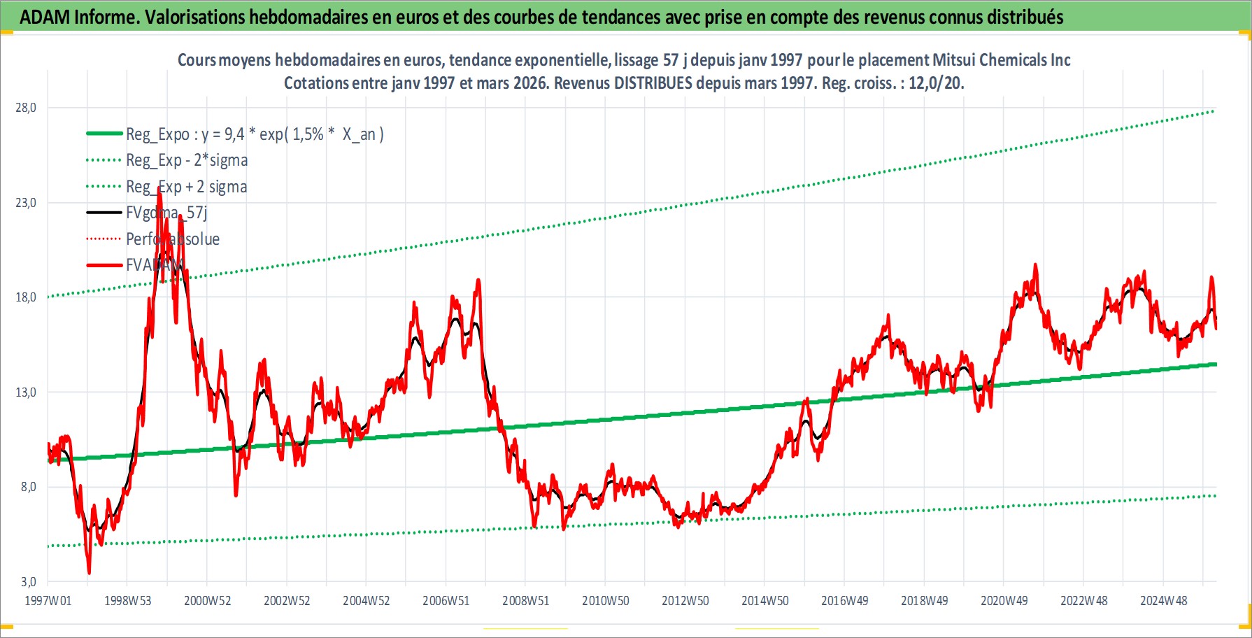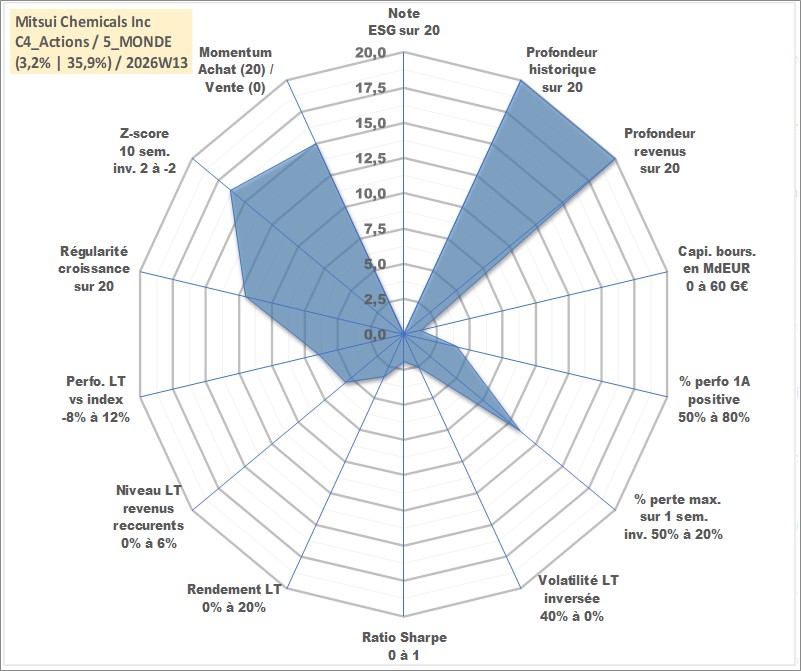 Site dédié aux investisseursPage dédiée sur site financeAnalyse des valorisations hebdomadaires de l'action Mitsui Chemicals Inc. Cet actif est cote en JPY. Les valorisations sont en contrevaleur EURO et couvrent les semaines 1997W01 a 2026W13. Les revenus de cet actif financier sont pris en compte depuis la semaine 1997W13. La note ESG de cet actif n'est pas connue.