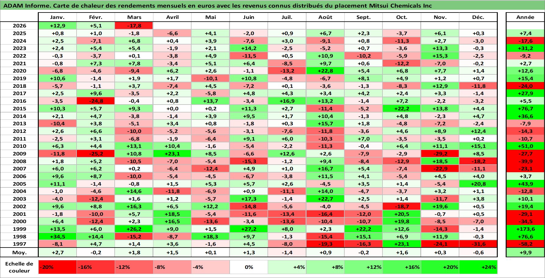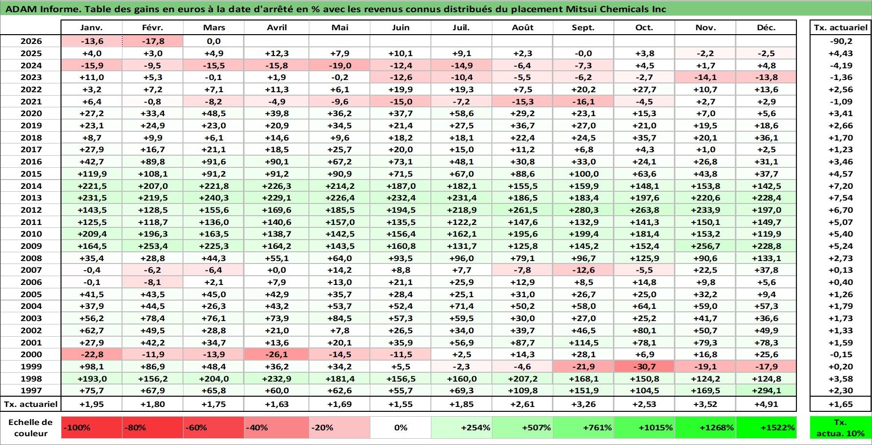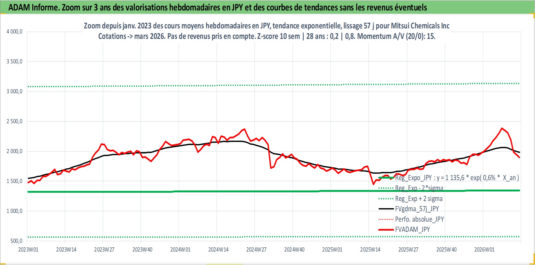 Site dédié aux investisseursPage dédiée sur site financeAnalyse des valorisations hebdomadaires de l'action Mitsui Chemicals Inc. Cet actif est cote en JPY. Les valorisations sont en contrevaleur EURO et couvrent les semaines 1997W01 a 2026W13. Les revenus de cet actif financier sont pris en compte depuis la semaine 1997W13. La note ESG de cet actif n'est pas connue.