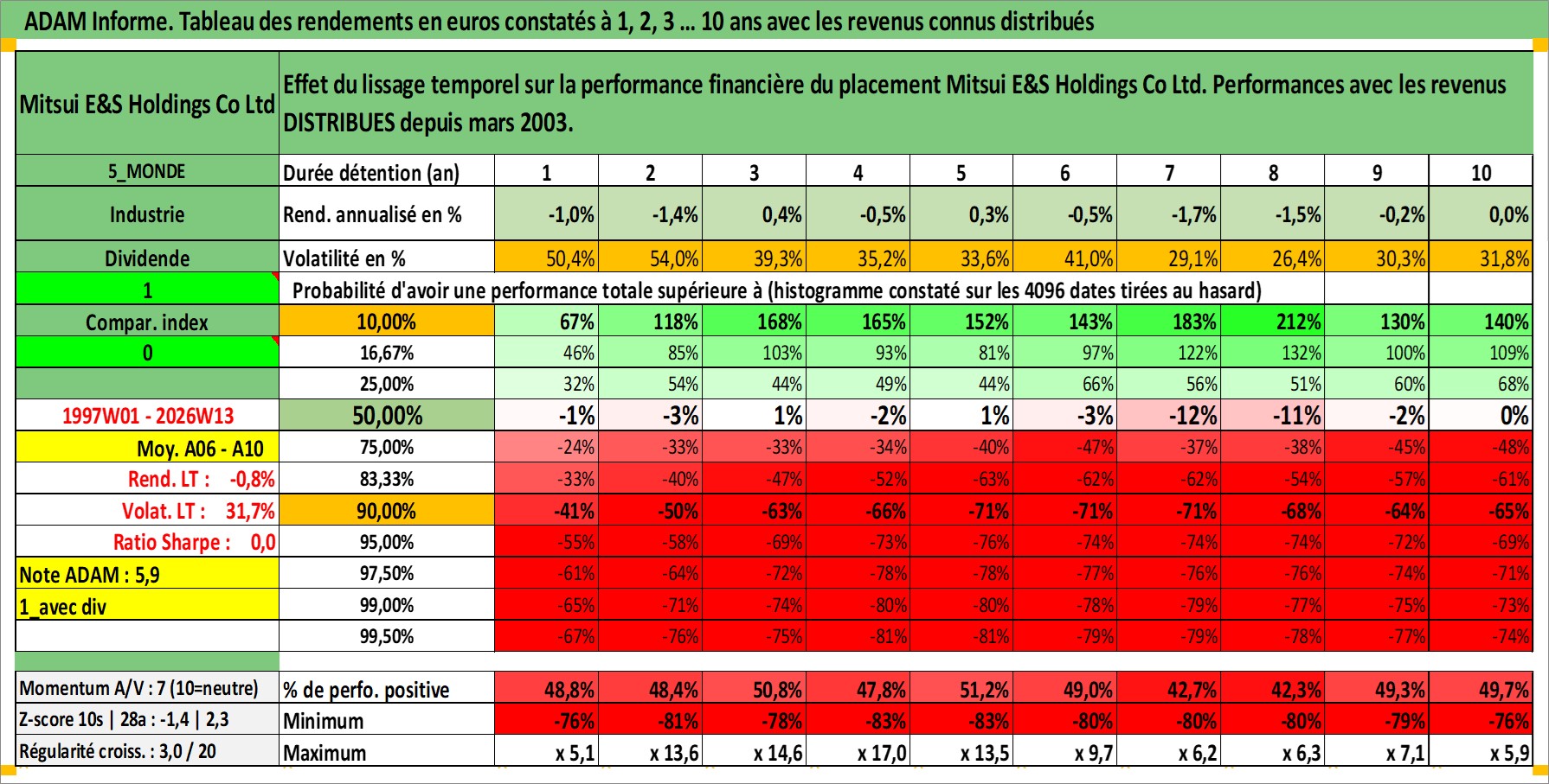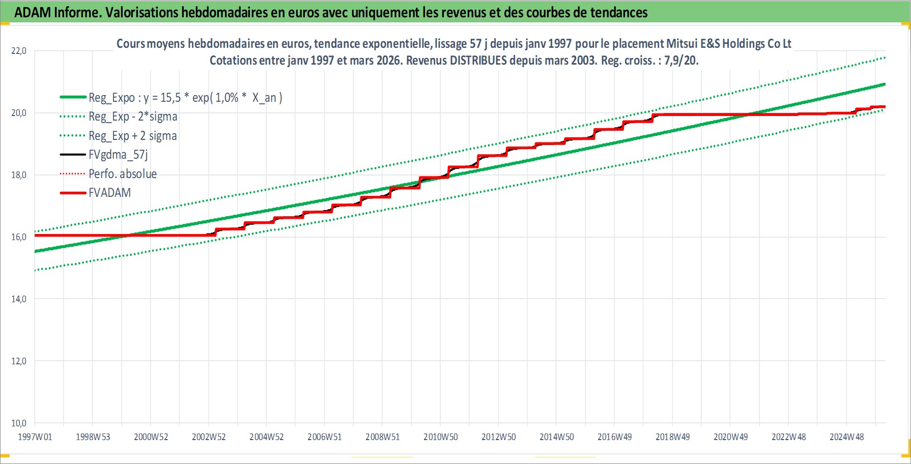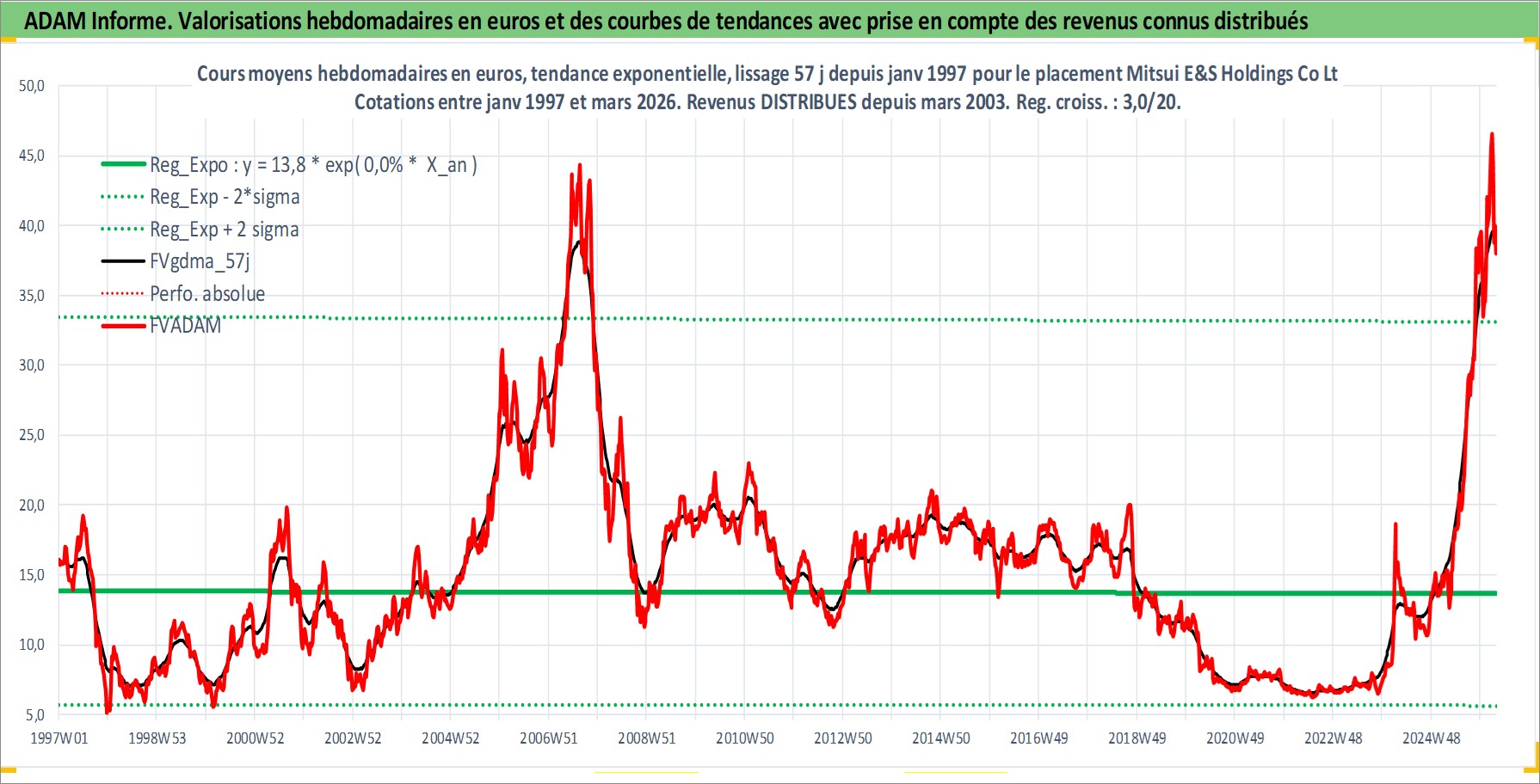Site dédié aux investisseursPage dédiée sur site financeAnalyse des valorisations hebdomadaires de l'action Mitsui E&S Holdings Co Ltd. Cet actif est cote en JPY. Les valorisations sont en contrevaleur EURO et couvrent les semaines 1997W01 a 2026W13. Les revenus de cet actif financier sont pris en compte depuis la semaine 2003W13. La note ESG de cet actif n'est pas connue.