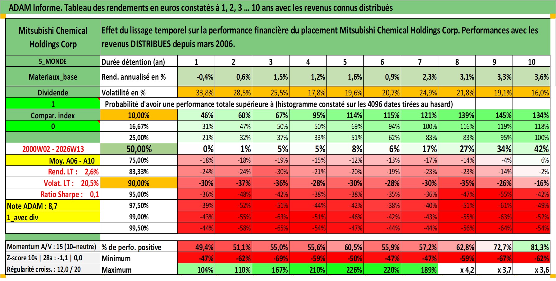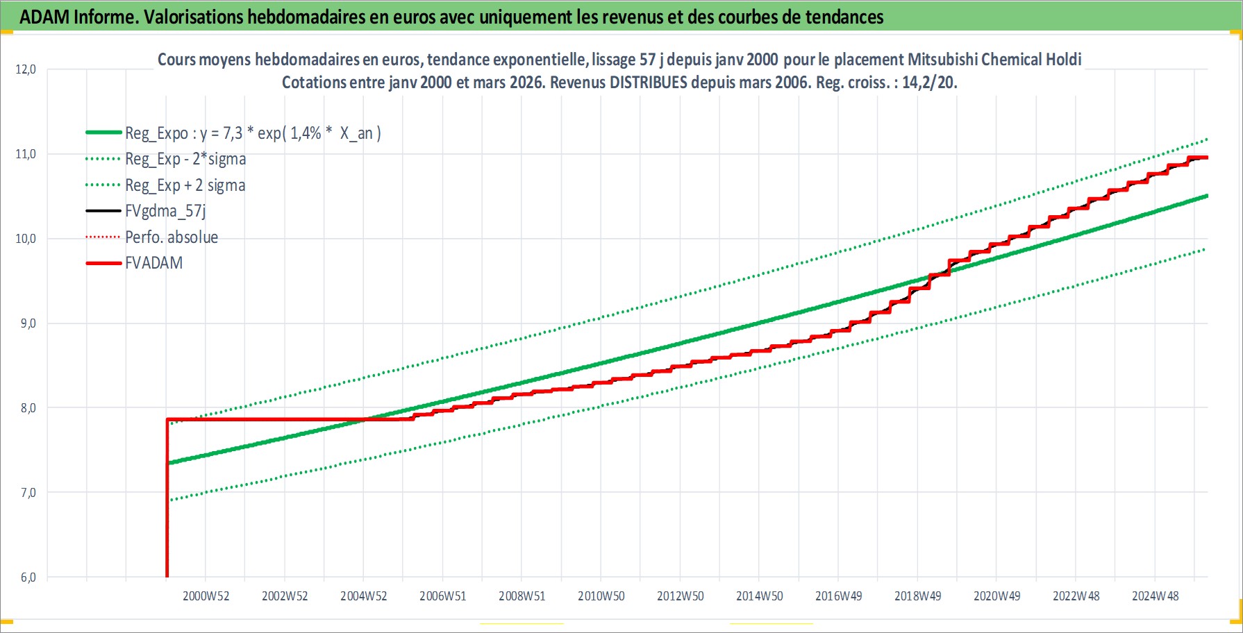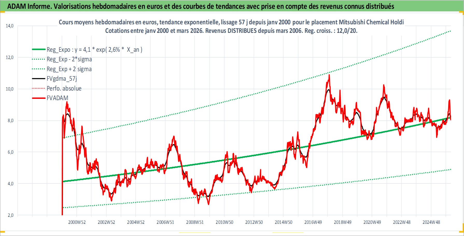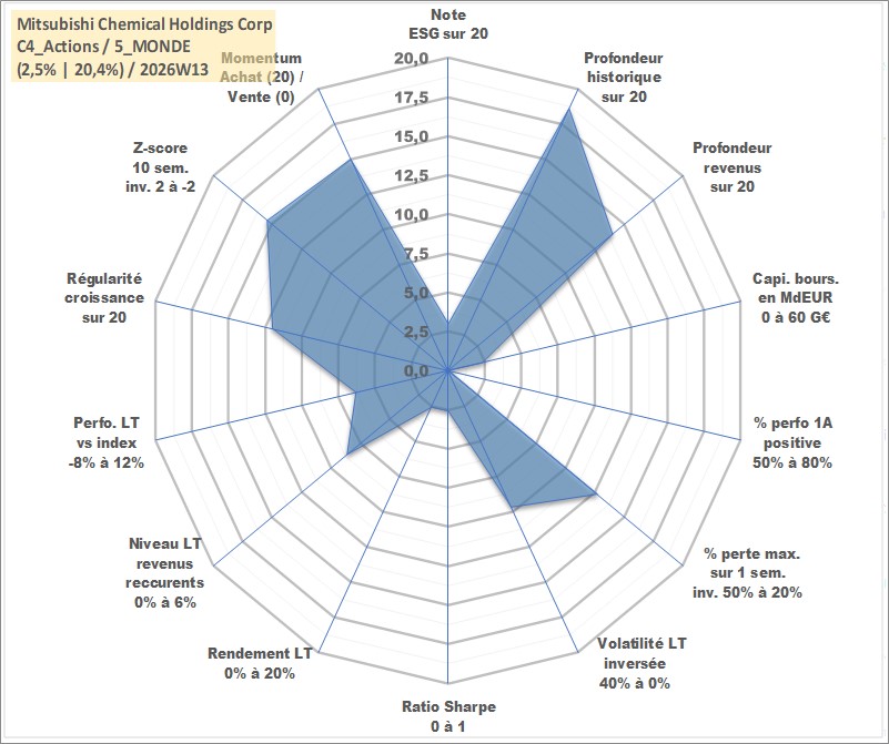 Site dédié aux investisseursPage dédiée sur site financeAnalyse des valorisations hebdomadaires de l'action Mitsubishi Chemical Holdings Corp. Cet actif est cote en JPY. Les valorisations sont en contrevaleur EURO et couvrent les semaines 2000W02 a 2026W13. Les revenus de cet actif financier sont pris en compte depuis la semaine 2006W13. La note globale ESG de cet actif est estimee a 3.0 (apres rebasage entre 0 et 20).