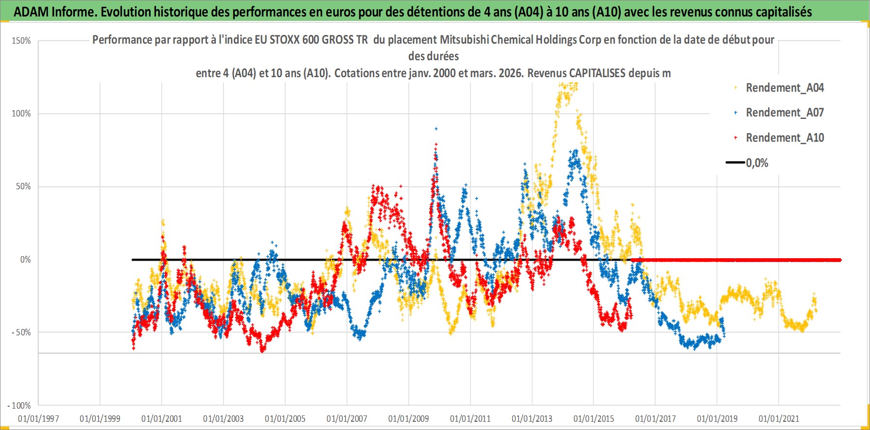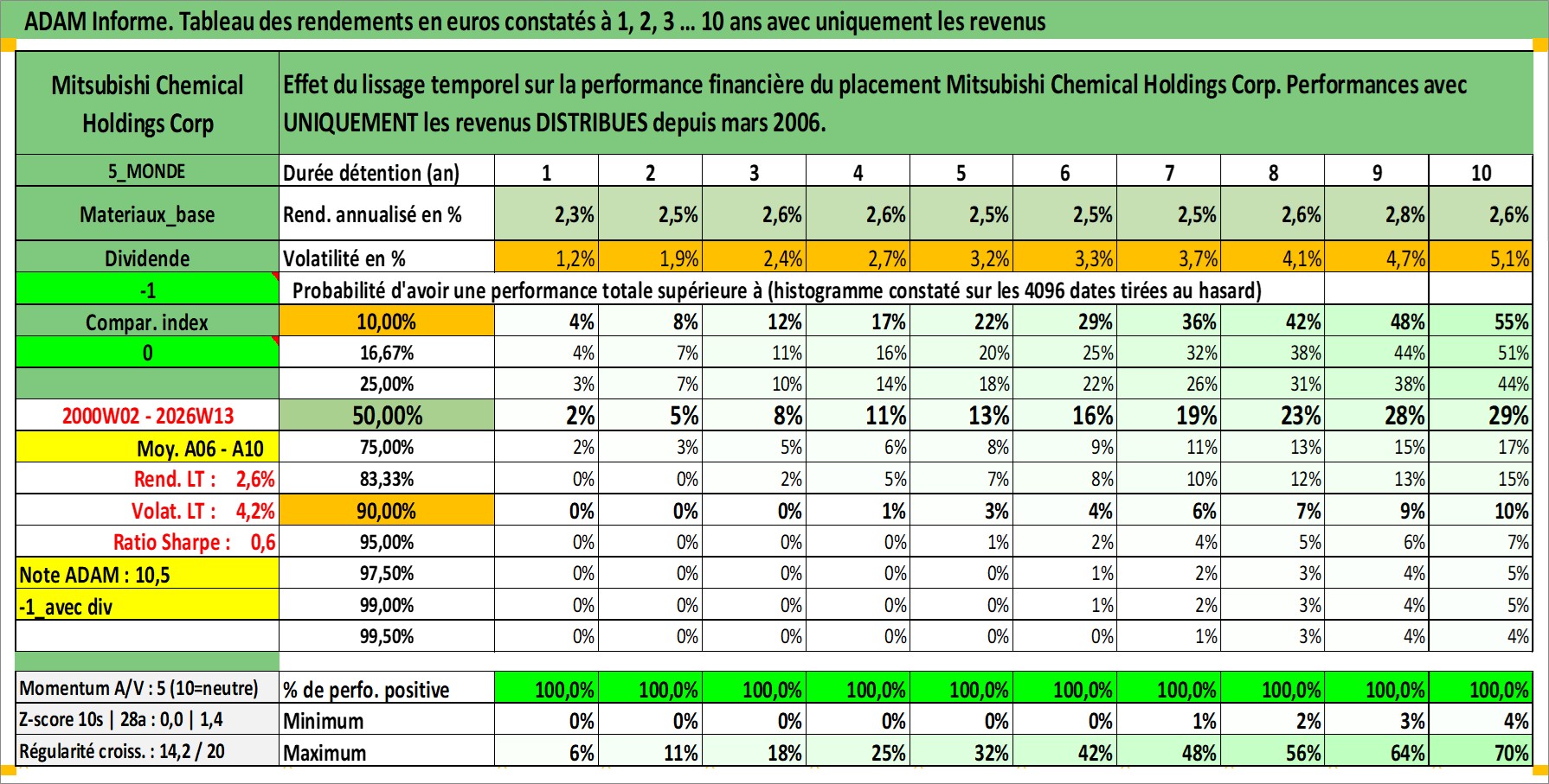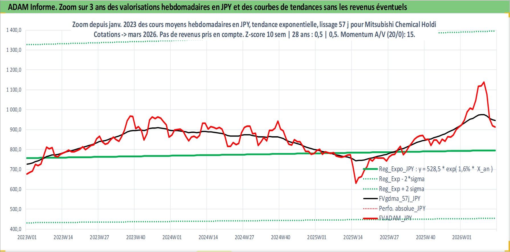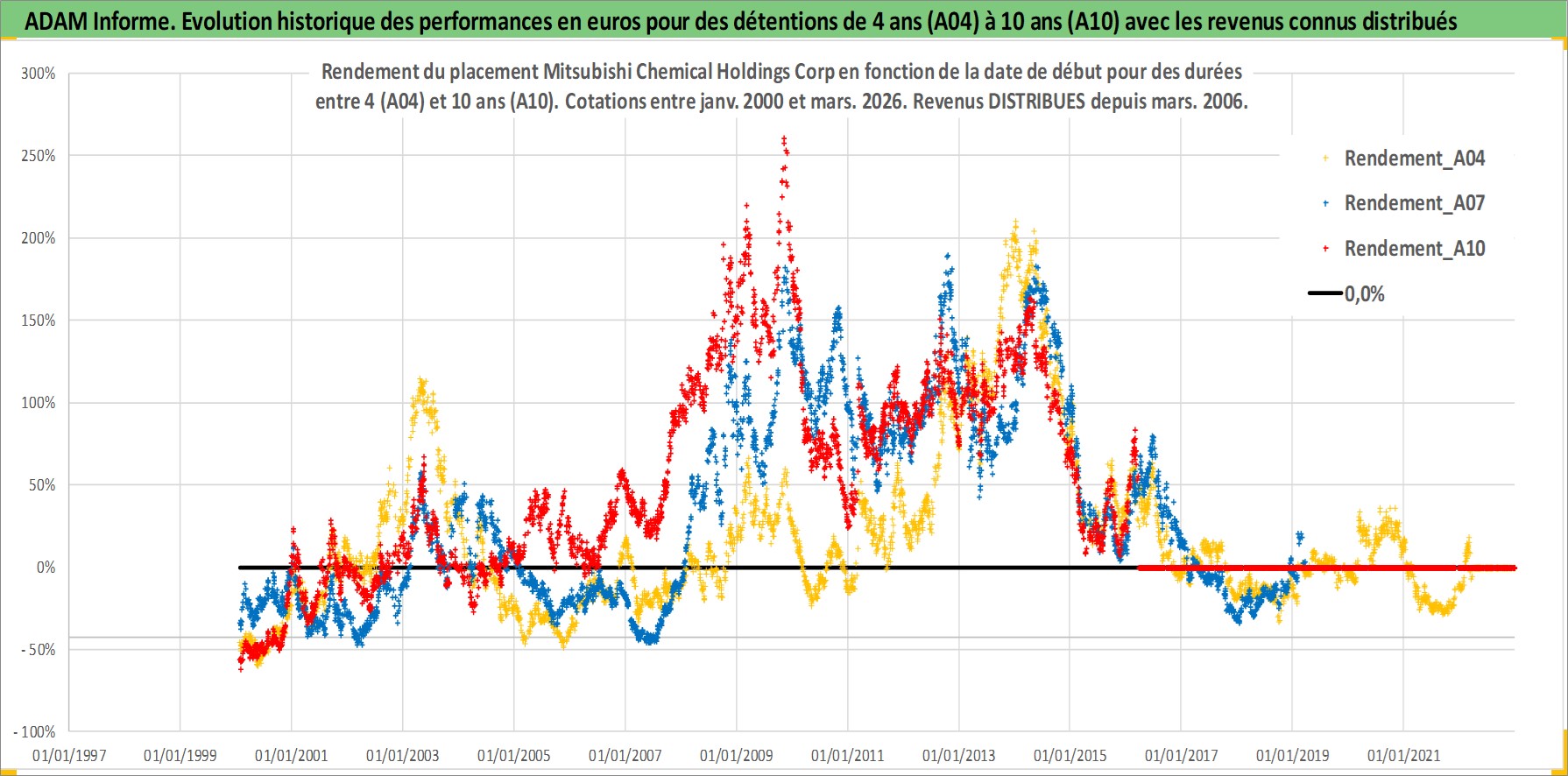 Site dédié aux investisseursPage dédiée sur site financeAnalyse des valorisations hebdomadaires de l'action Mitsubishi Chemical Holdings Corp. Cet actif est cote en JPY. Les valorisations sont en contrevaleur EURO et couvrent les semaines 2000W02 a 2026W13. Les revenus de cet actif financier sont pris en compte depuis la semaine 2006W13. La note globale ESG de cet actif est estimee a 3.0 (apres rebasage entre 0 et 20).