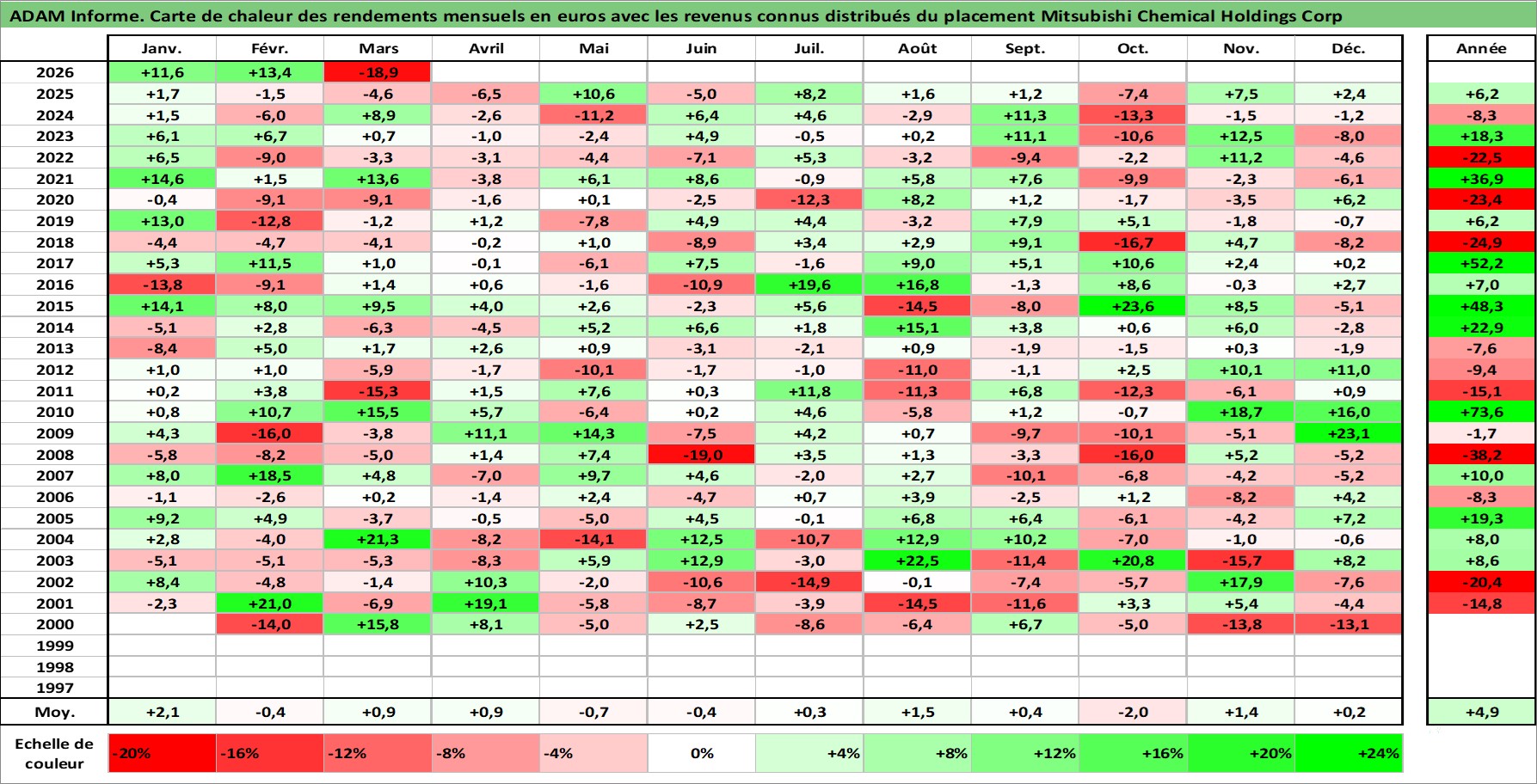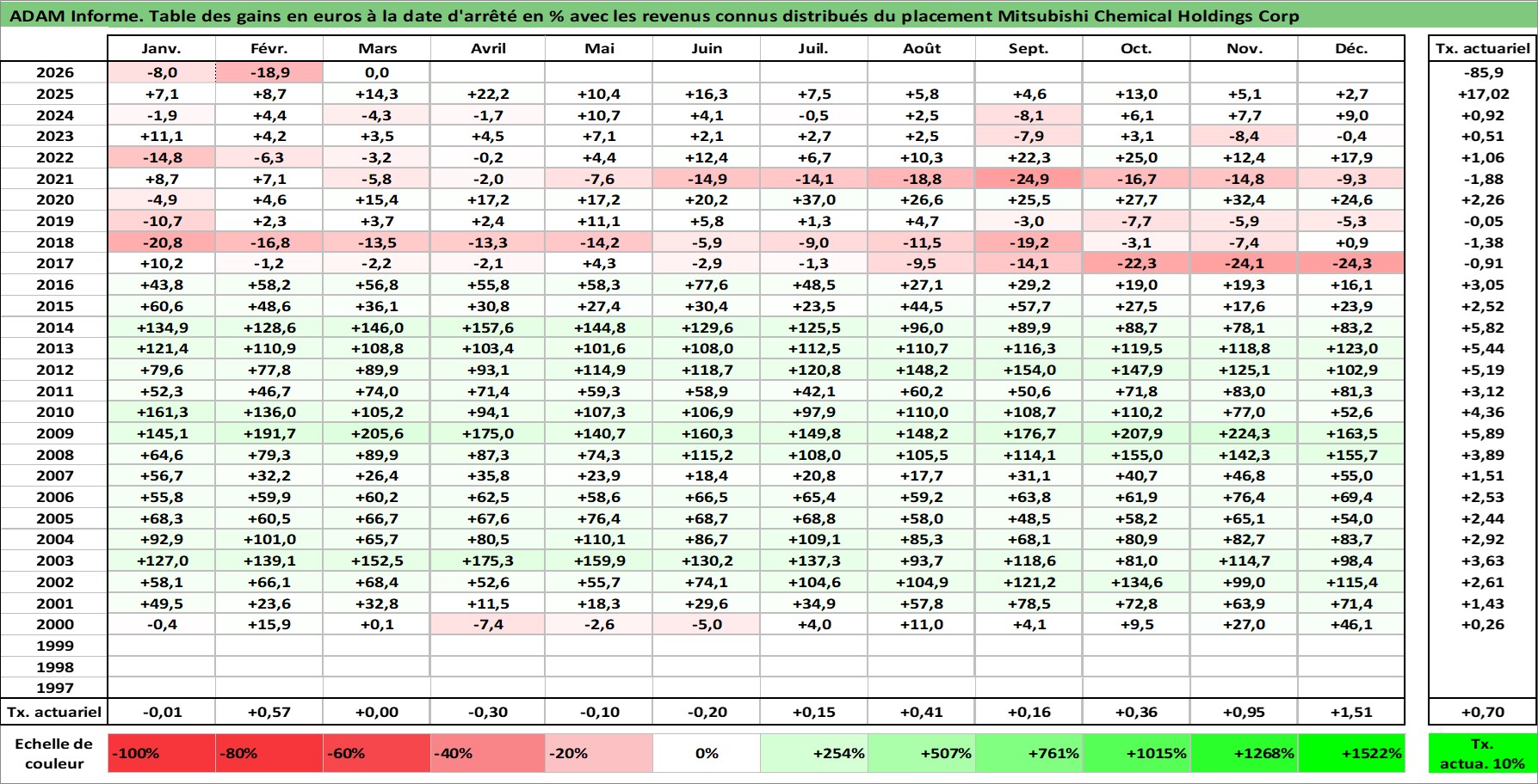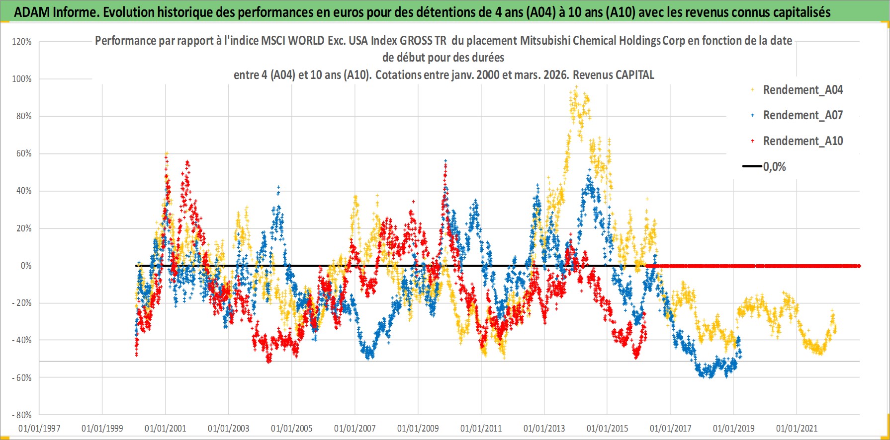 Site dédié aux investisseursPage dédiée sur site financeAnalyse des valorisations hebdomadaires de l'action Mitsubishi Chemical Holdings Corp. Cet actif est cote en JPY. Les valorisations sont en contrevaleur EURO et couvrent les semaines 2000W02 a 2026W13. Les revenus de cet actif financier sont pris en compte depuis la semaine 2006W13. La note globale ESG de cet actif est estimee a 3.0 (apres rebasage entre 0 et 20).