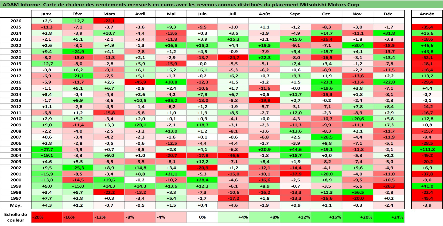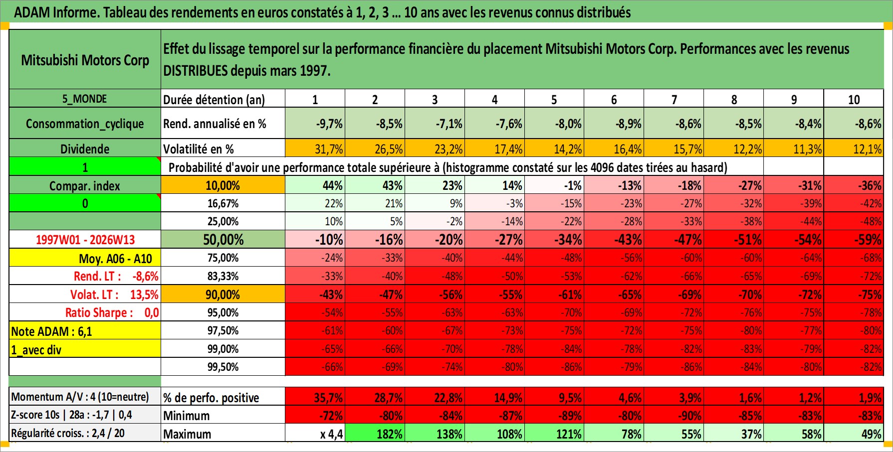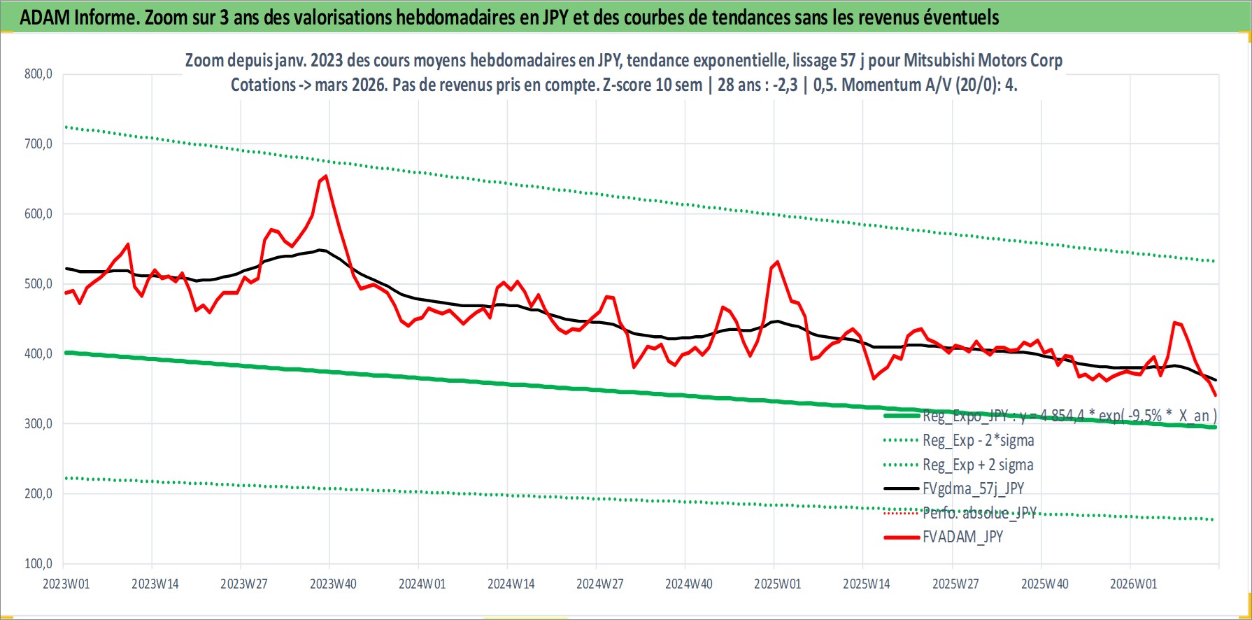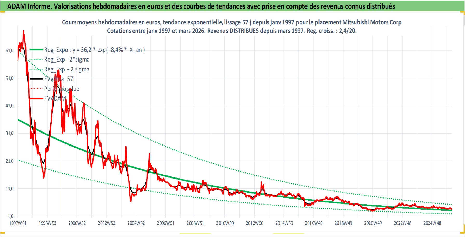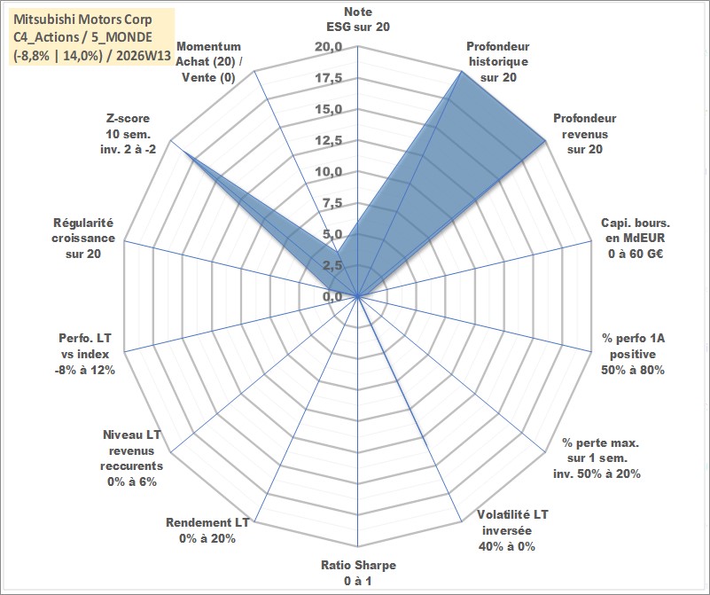 Site dédié aux investisseursPage dédiée sur site financeAnalyse des valorisations hebdomadaires de l'action Mitsubishi Motors Corp. Cet actif est cote en JPY. Les valorisations sont en contrevaleur EURO et couvrent les semaines 1997W01 a 2026W13. Les revenus de cet actif financier sont pris en compte depuis la semaine 1997W13. La note globale ESG de cet actif est estimee a 6.0 (apres rebasage entre 0 et 20).