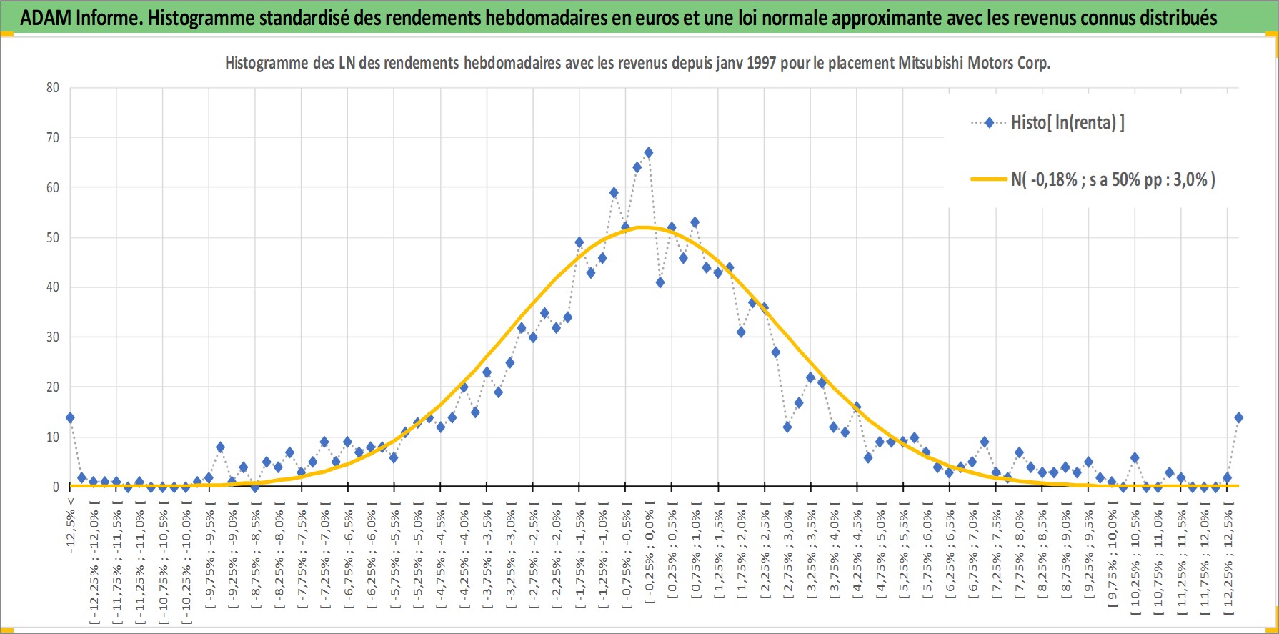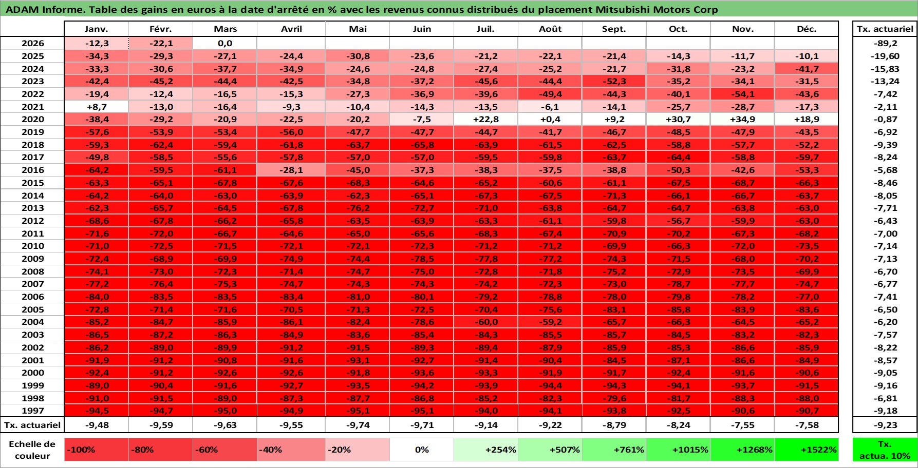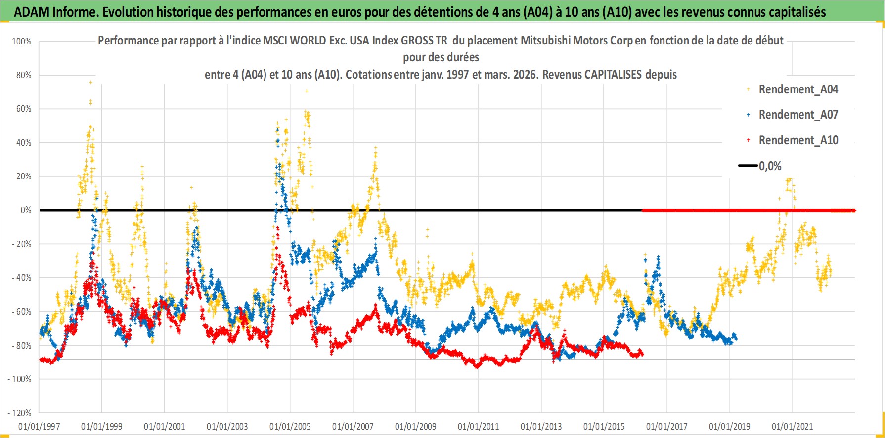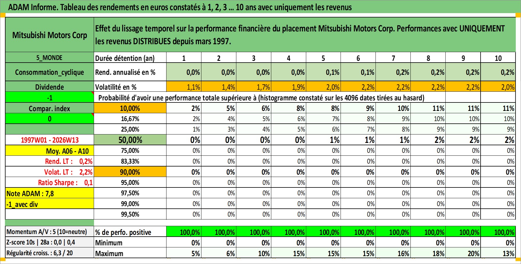 Site dédié aux investisseursPage dédiée sur site financeAnalyse des valorisations hebdomadaires de l'action Mitsubishi Motors Corp. Cet actif est cote en JPY. Les valorisations sont en contrevaleur EURO et couvrent les semaines 1997W01 a 2026W13. Les revenus de cet actif financier sont pris en compte depuis la semaine 1997W13. La note globale ESG de cet actif est estimee a 6.0 (apres rebasage entre 0 et 20).