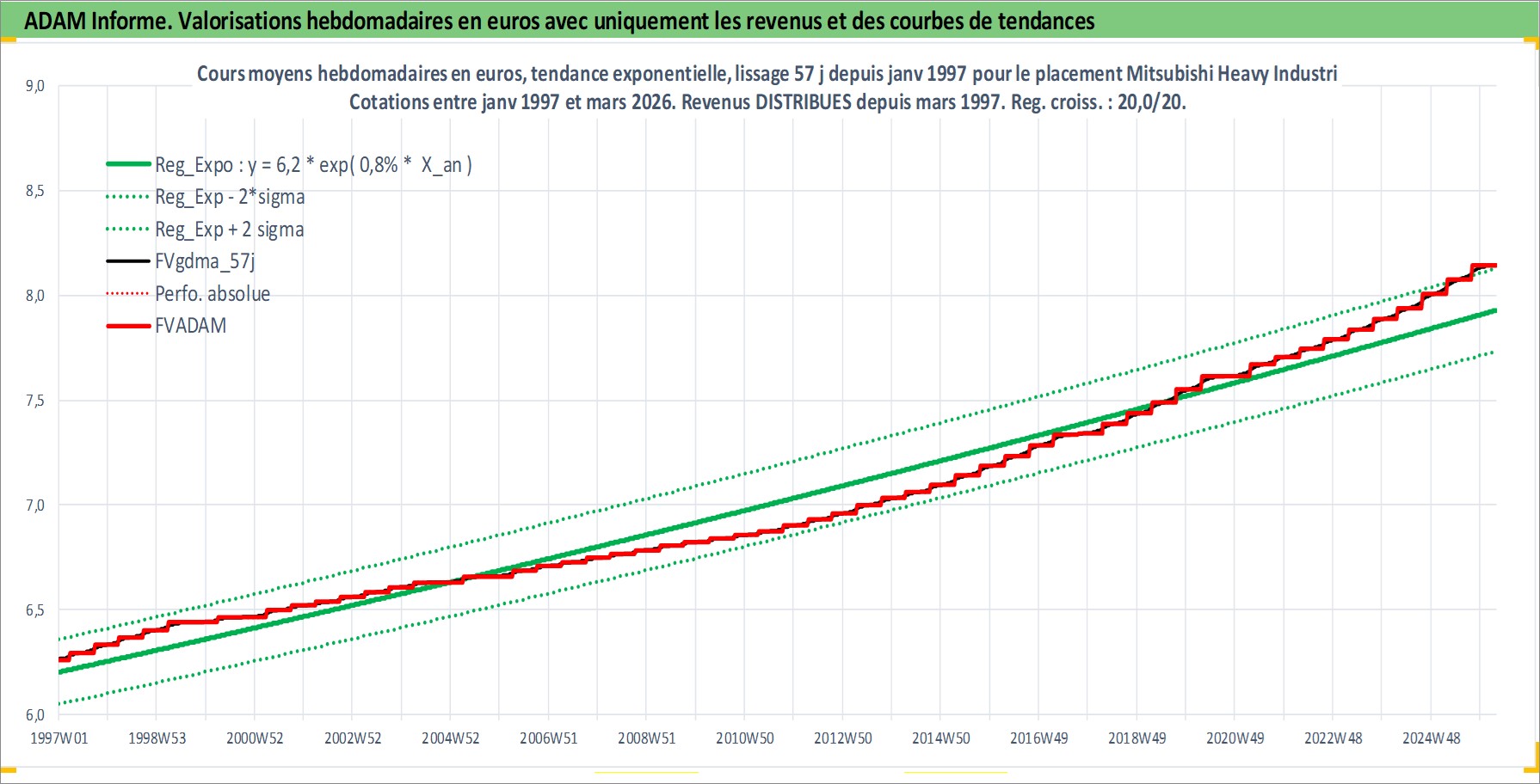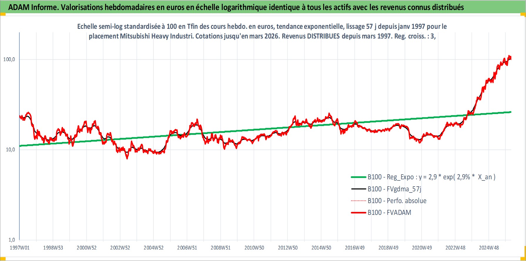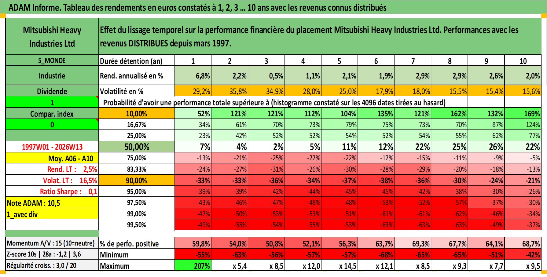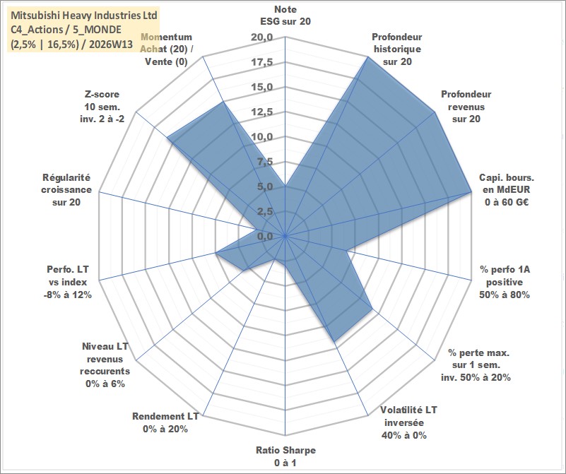 Site dédié aux investisseursPage dédiée sur site financeAnalyse des valorisations hebdomadaires de l'action Mitsubishi Heavy Industries Ltd. Cet actif est cote en JPY. Les valorisations sont en contrevaleur EURO et couvrent les semaines 1997W01 a 2026W13. Les revenus de cet actif financier sont pris en compte depuis la semaine 1997W13. La note globale ESG de cet actif est estimee a 5.0 (apres rebasage entre 0 et 20).