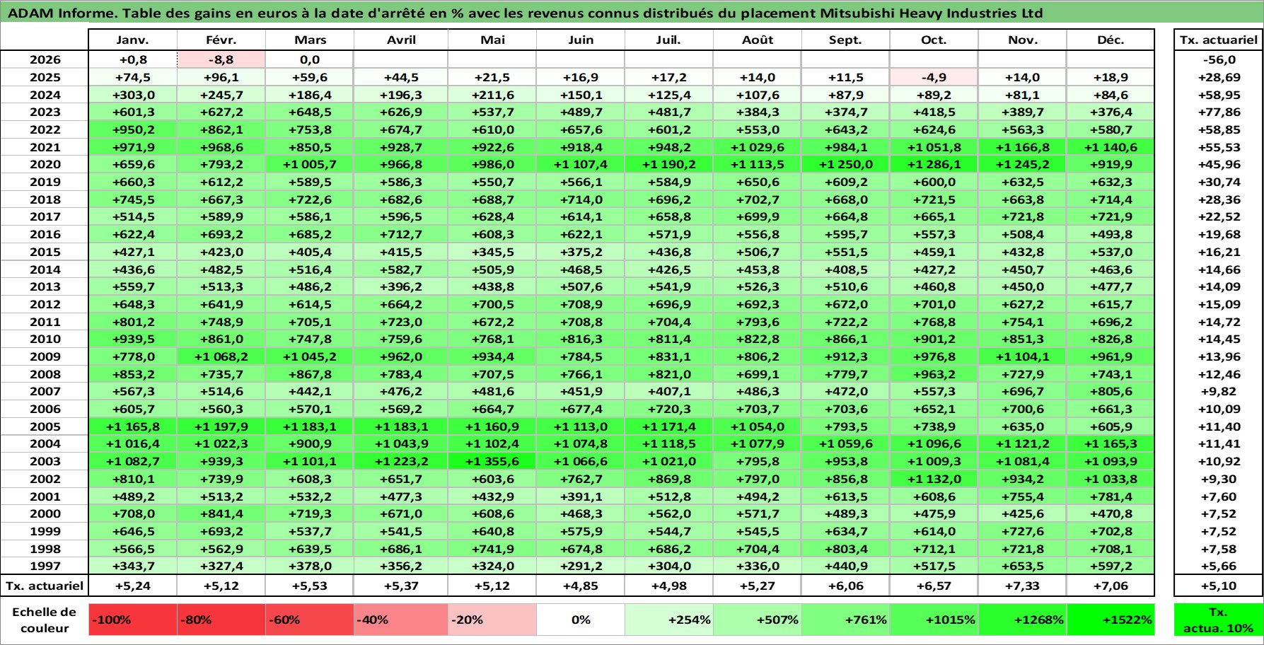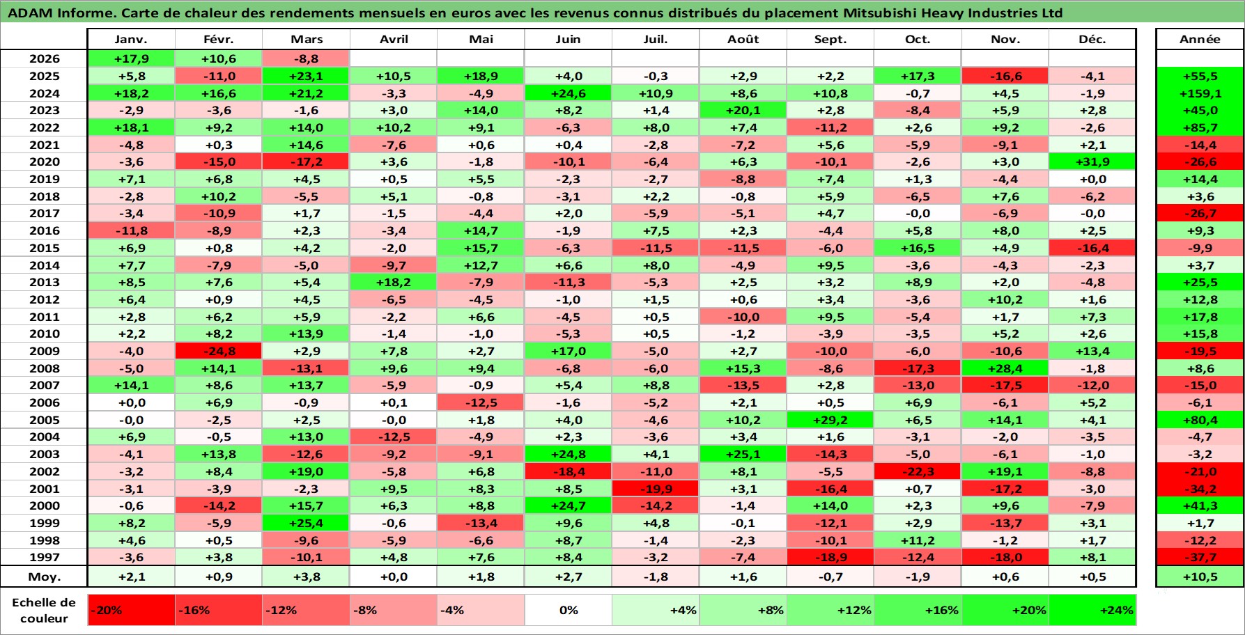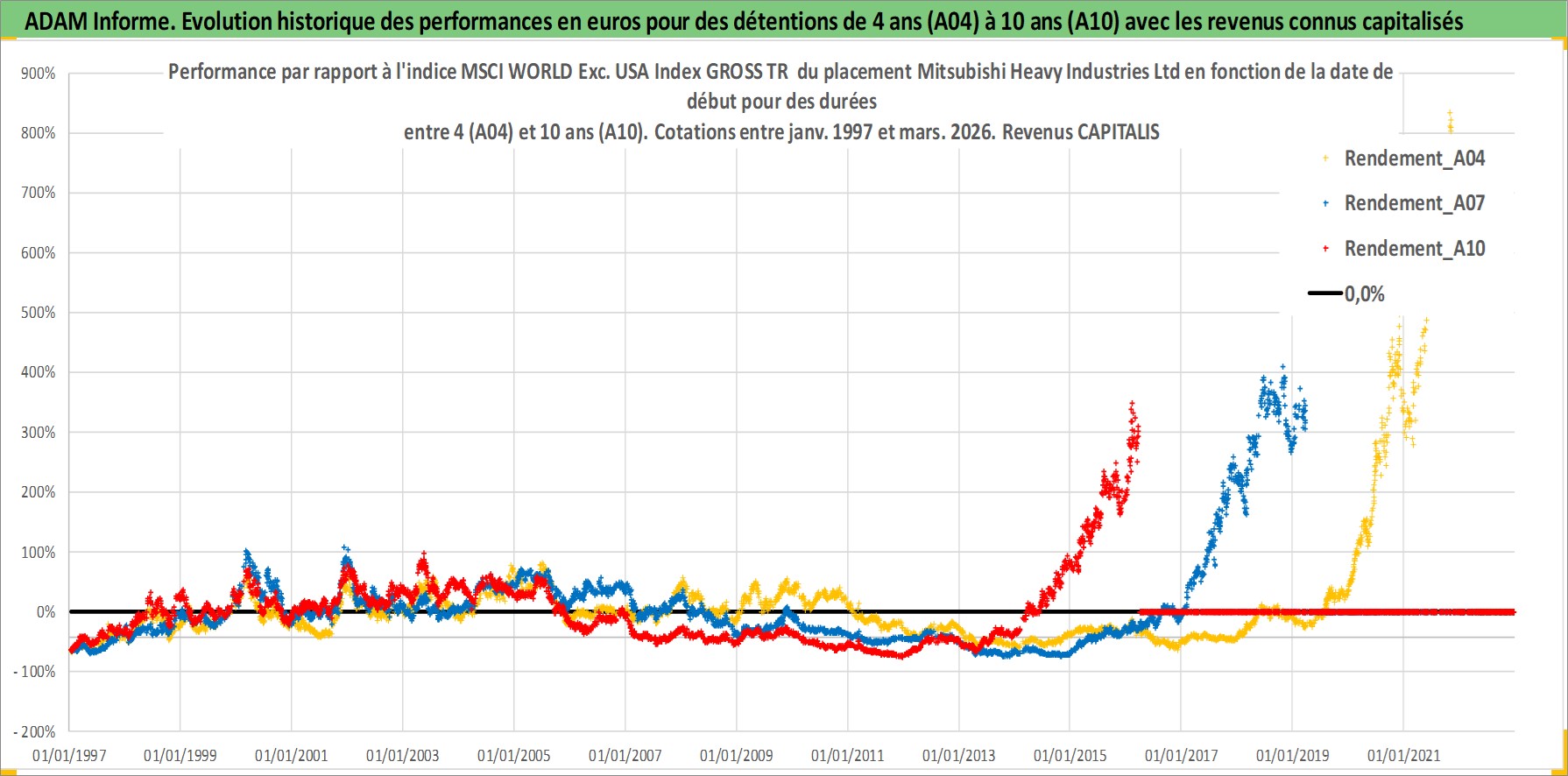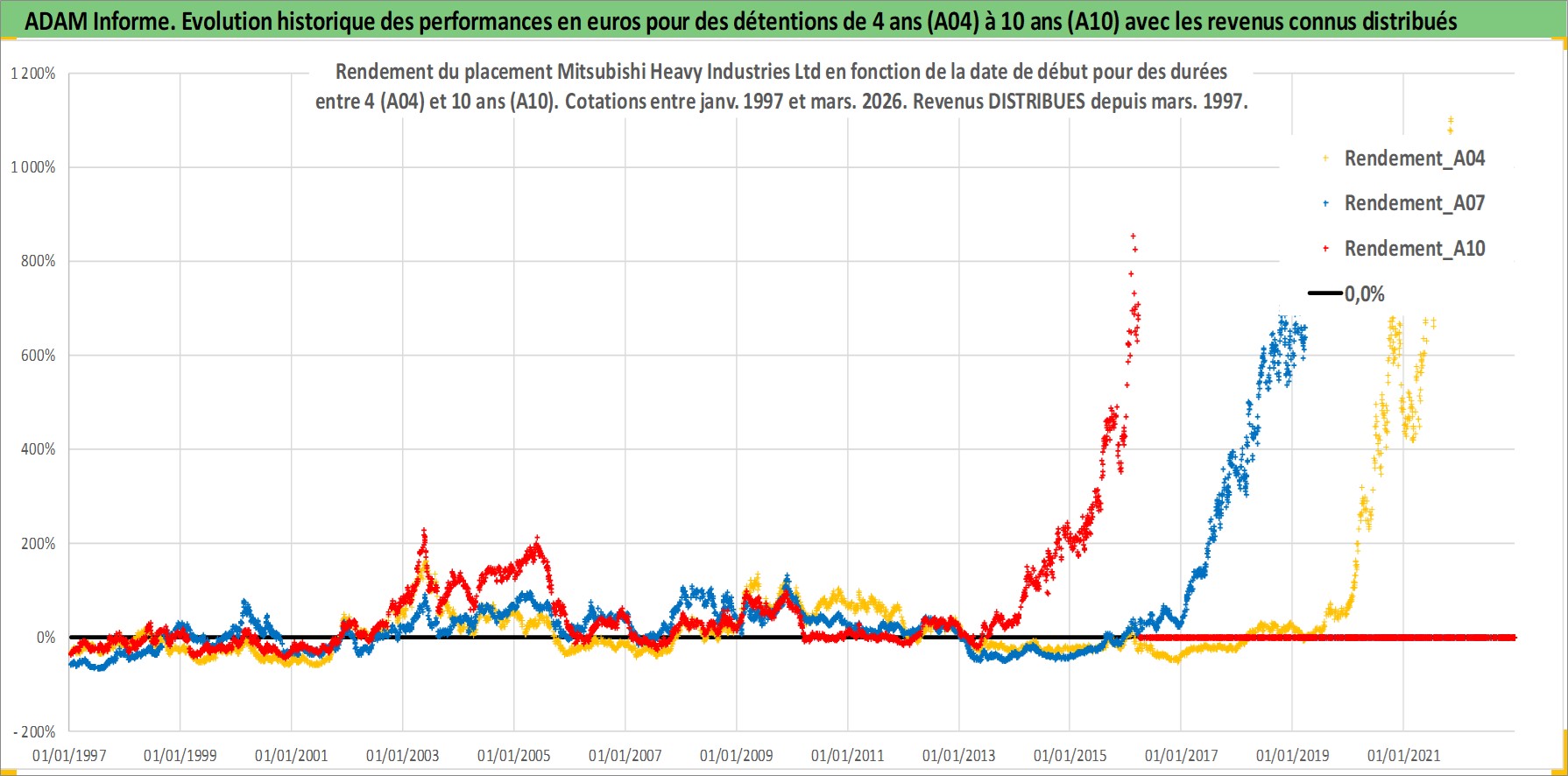 Site dédié aux investisseursPage dédiée sur site financeAnalyse des valorisations hebdomadaires de l'action Mitsubishi Heavy Industries Ltd. Cet actif est cote en JPY. Les valorisations sont en contrevaleur EURO et couvrent les semaines 1997W01 a 2026W13. Les revenus de cet actif financier sont pris en compte depuis la semaine 1997W13. La note globale ESG de cet actif est estimee a 5.0 (apres rebasage entre 0 et 20).
